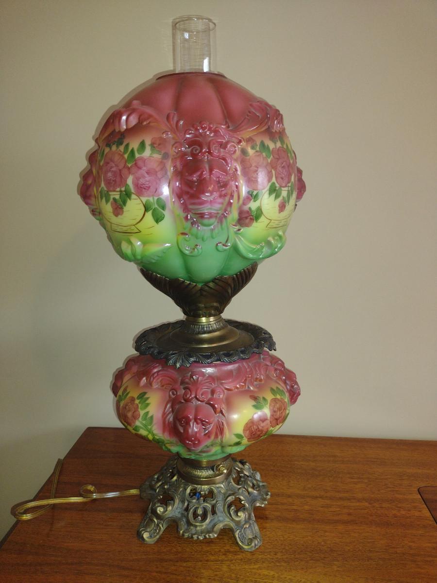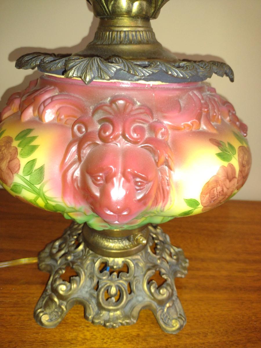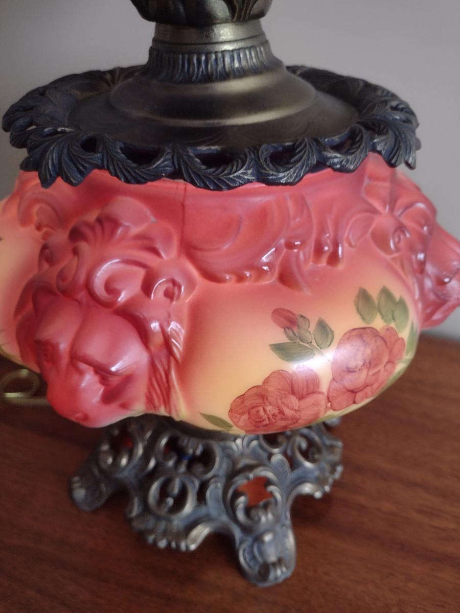 Vintage Hand Painted 'Gone with the Wind' Lion Face Table Lamp- Approx 25 3/4" Tall. Both shades, both top and bottom, appear to have working lights.