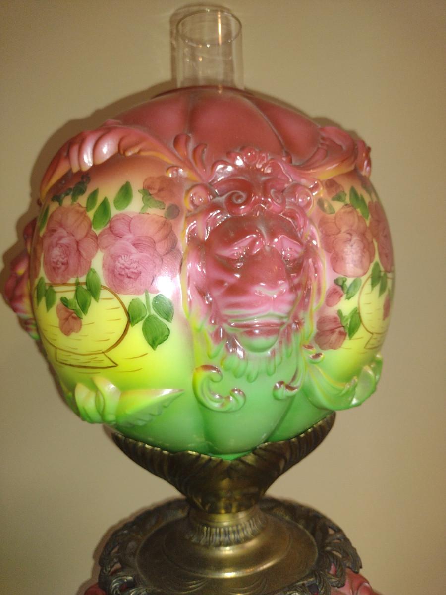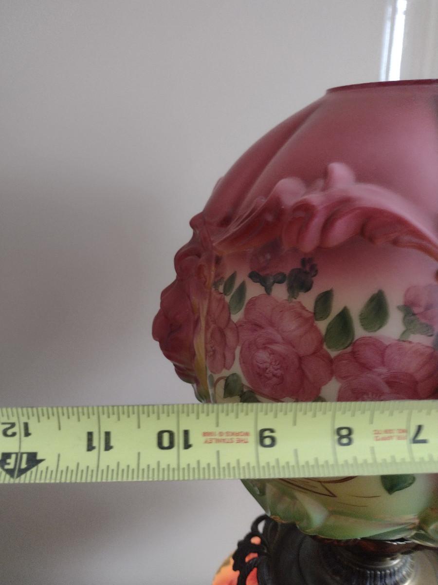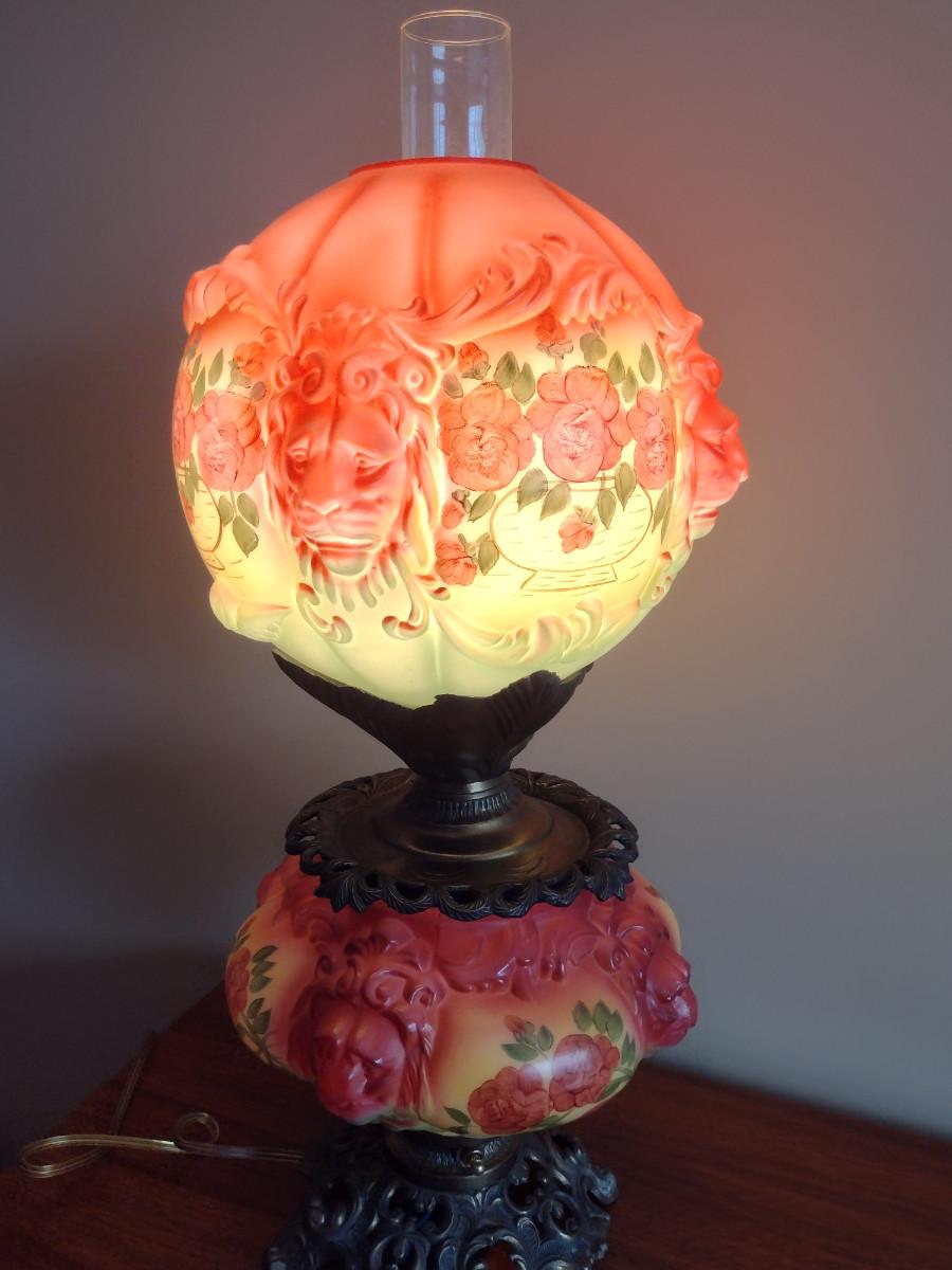Vintage Hand Painted 'Gone with the Wind' Lion Face Table Lamp- Approx 25 3/4" Tall. Both shades, both top and bottom, appear to have working lights.