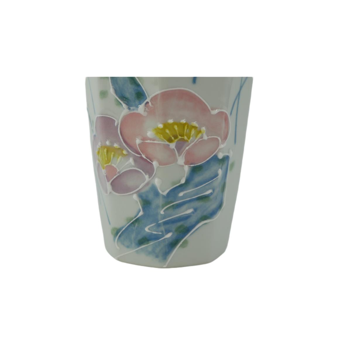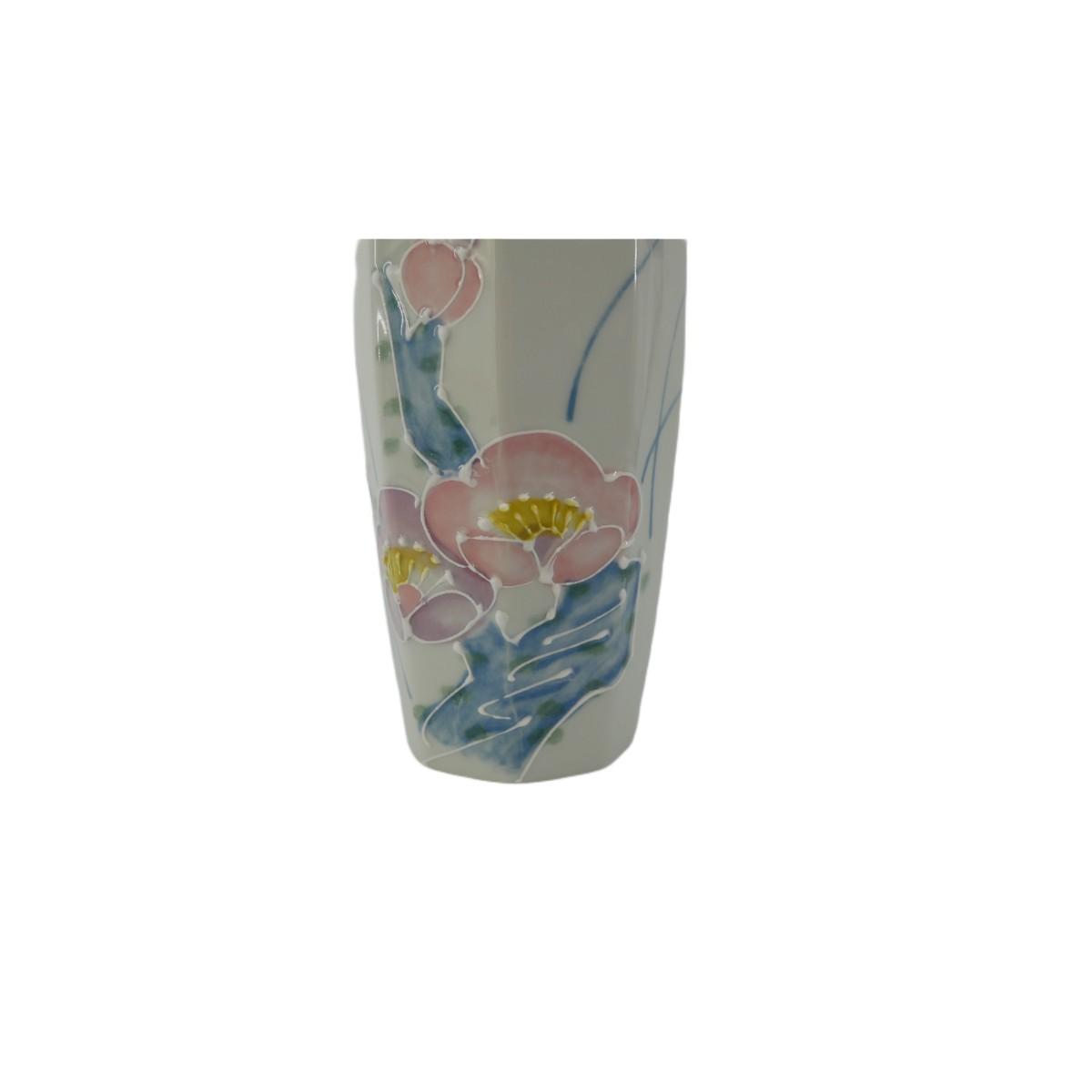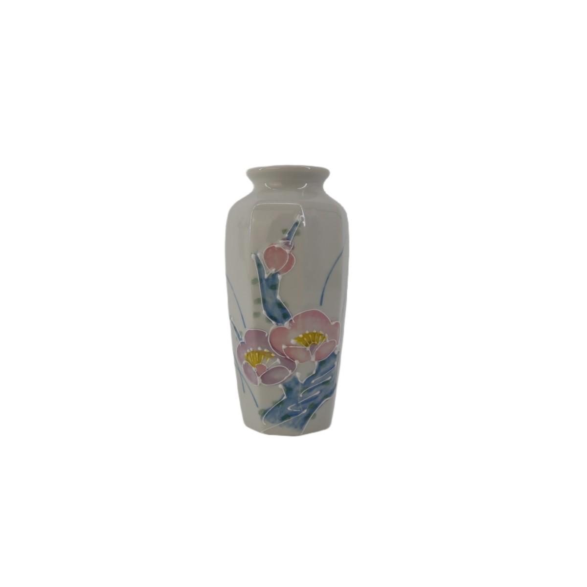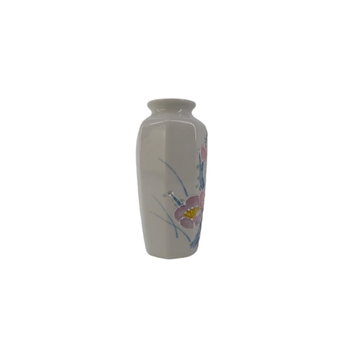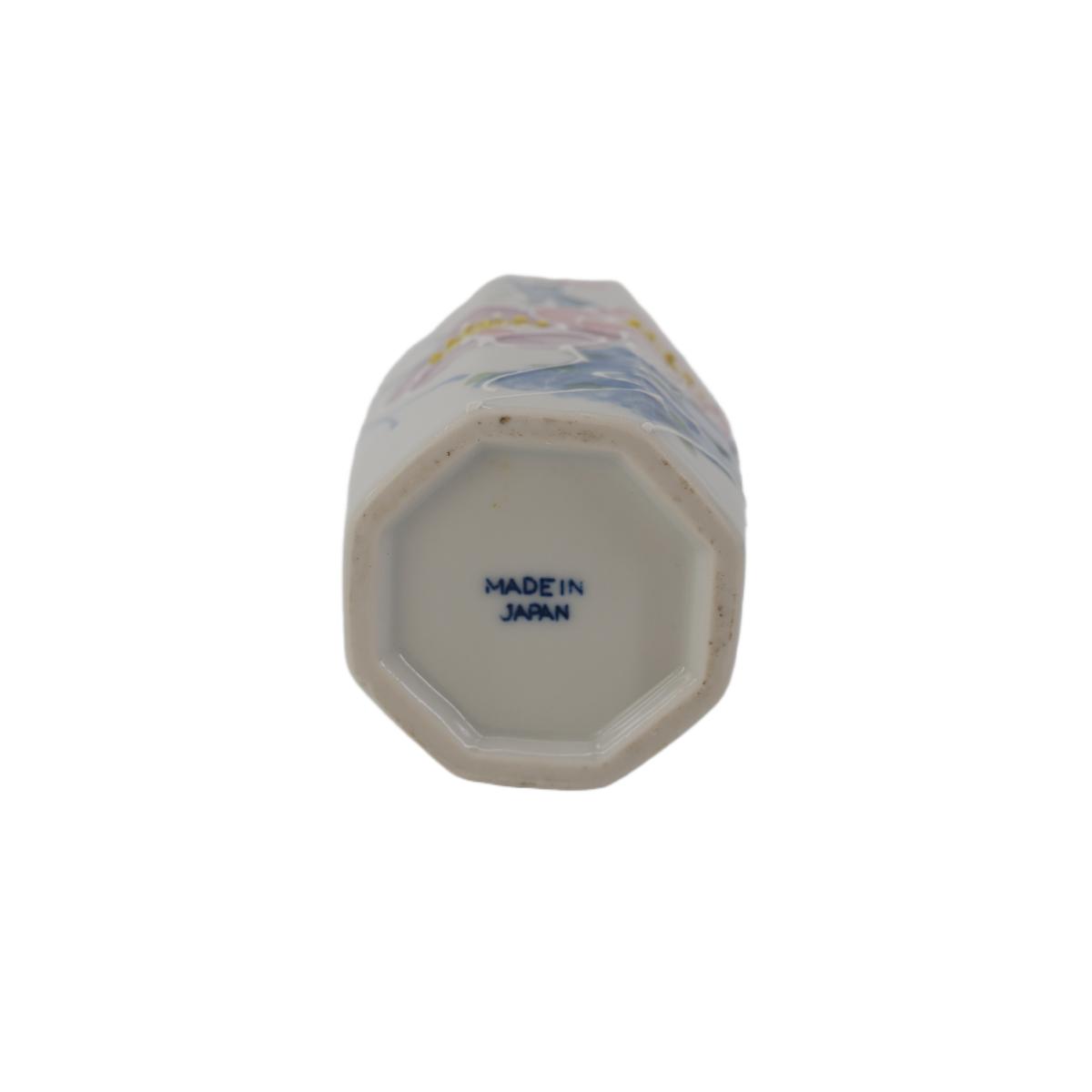 Hand painted decorative porcelain vase, stamped "Made in Japan". This vase depicts beautiful pink cherry blossoms growing from a branch with textured paint. Excellent condition, no issues found. Measures L 3" x H 6". Weighs 9.5 oz. (C63)