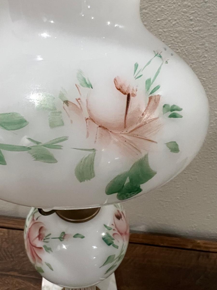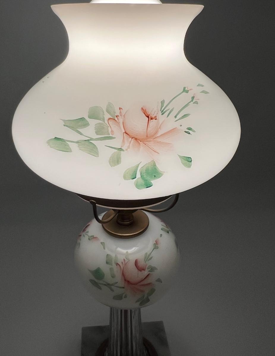 Elegance at its best! Beautiful hand painted white glass, hand painted, crystal/marble base. Measures 16 inches tall and 6 inches at its widest point.