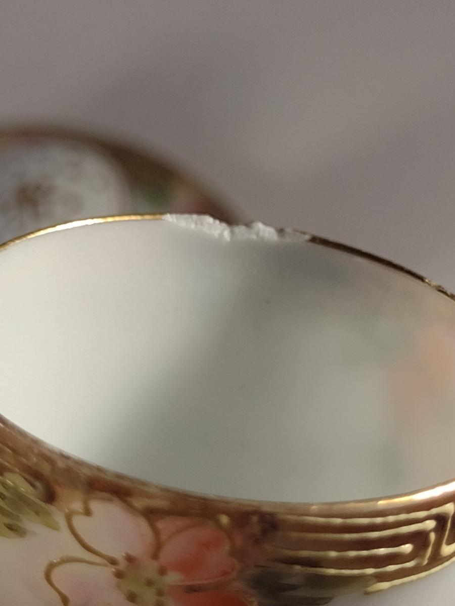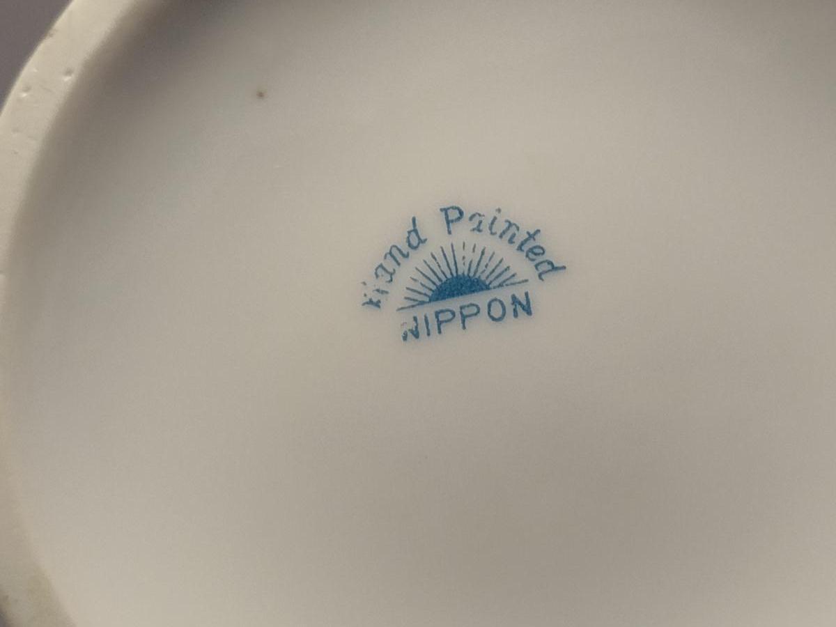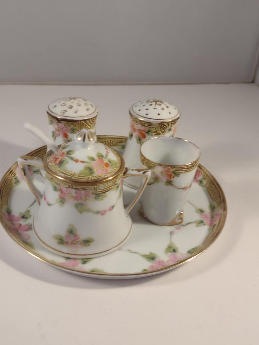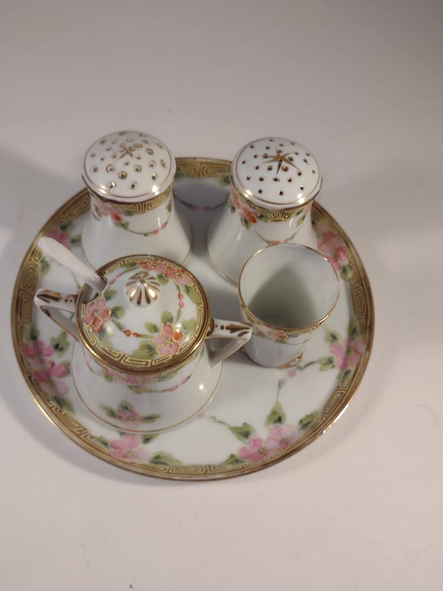 Vintage Hand Painted Nippon Condiment Set- Seven Pieces. Cup has chipping at rim- please see all pictures for condition.