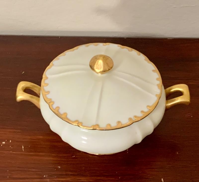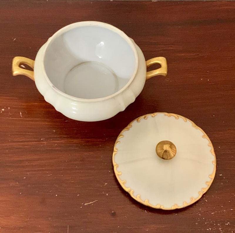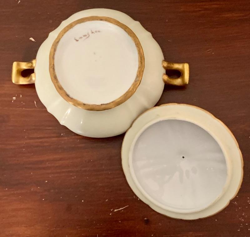Off white porcelain with hand painted gold gilding. Artist signed on back “Emmy Lou.” No cracks, nicks, crazing or repairs noted. Measures 7 1/4” across handle to handle.