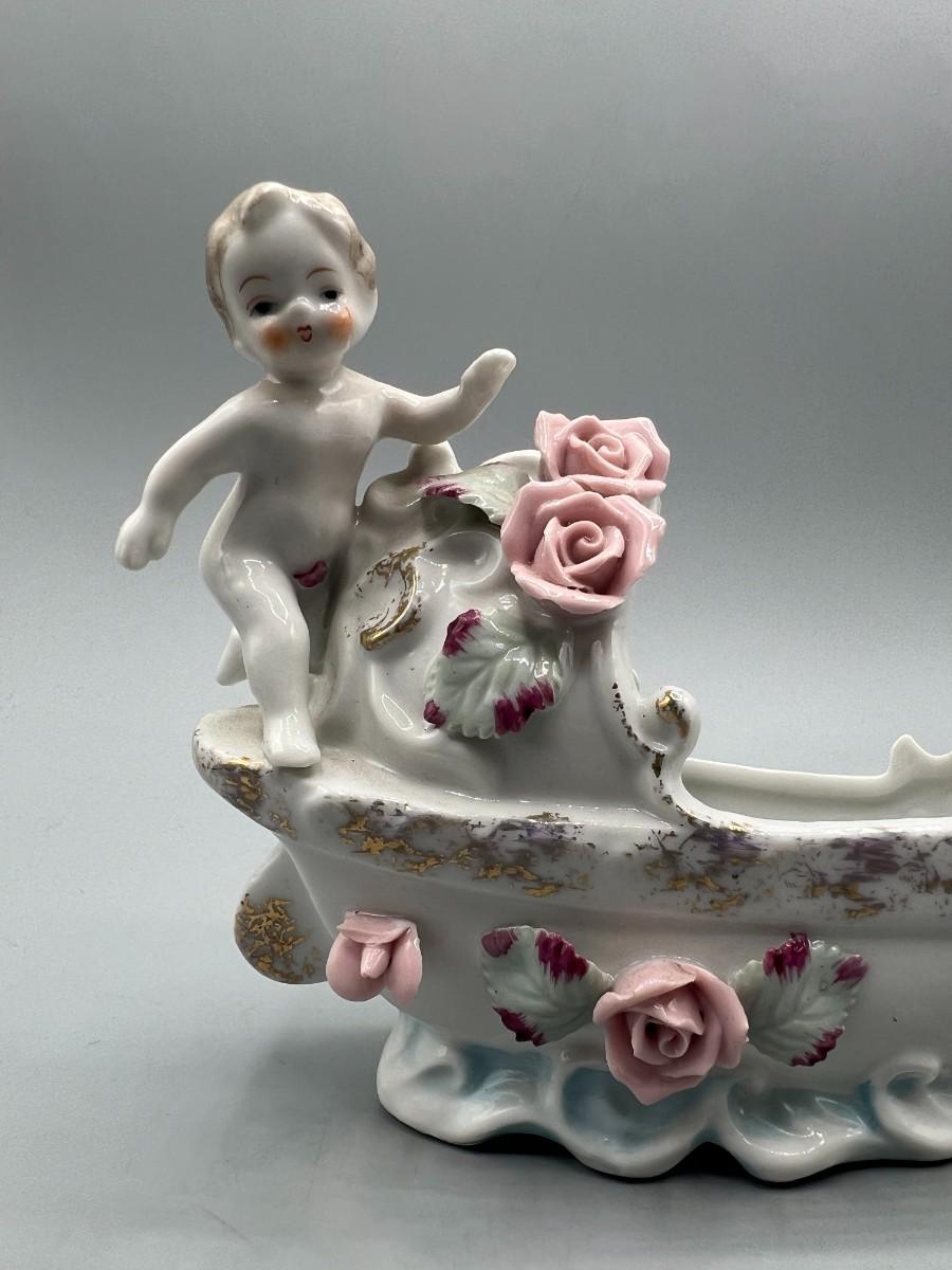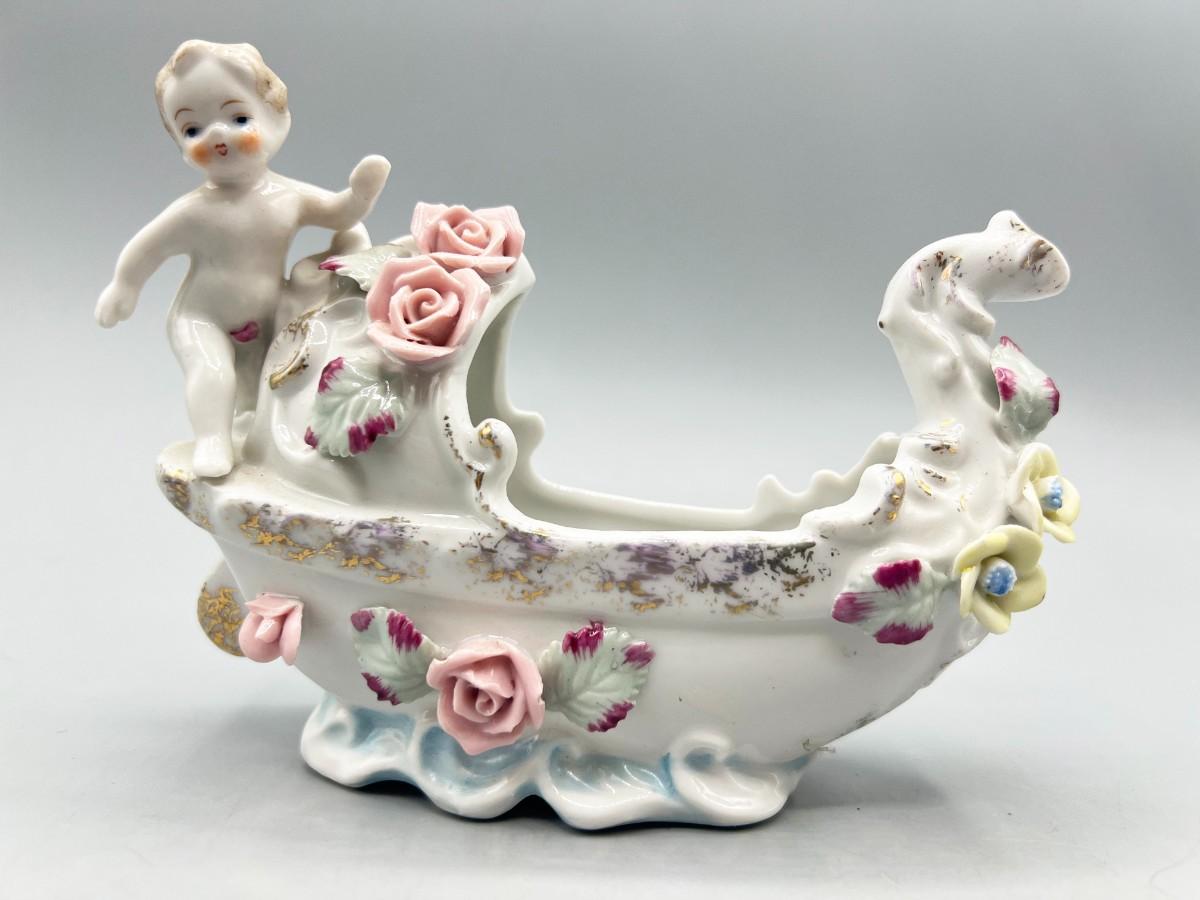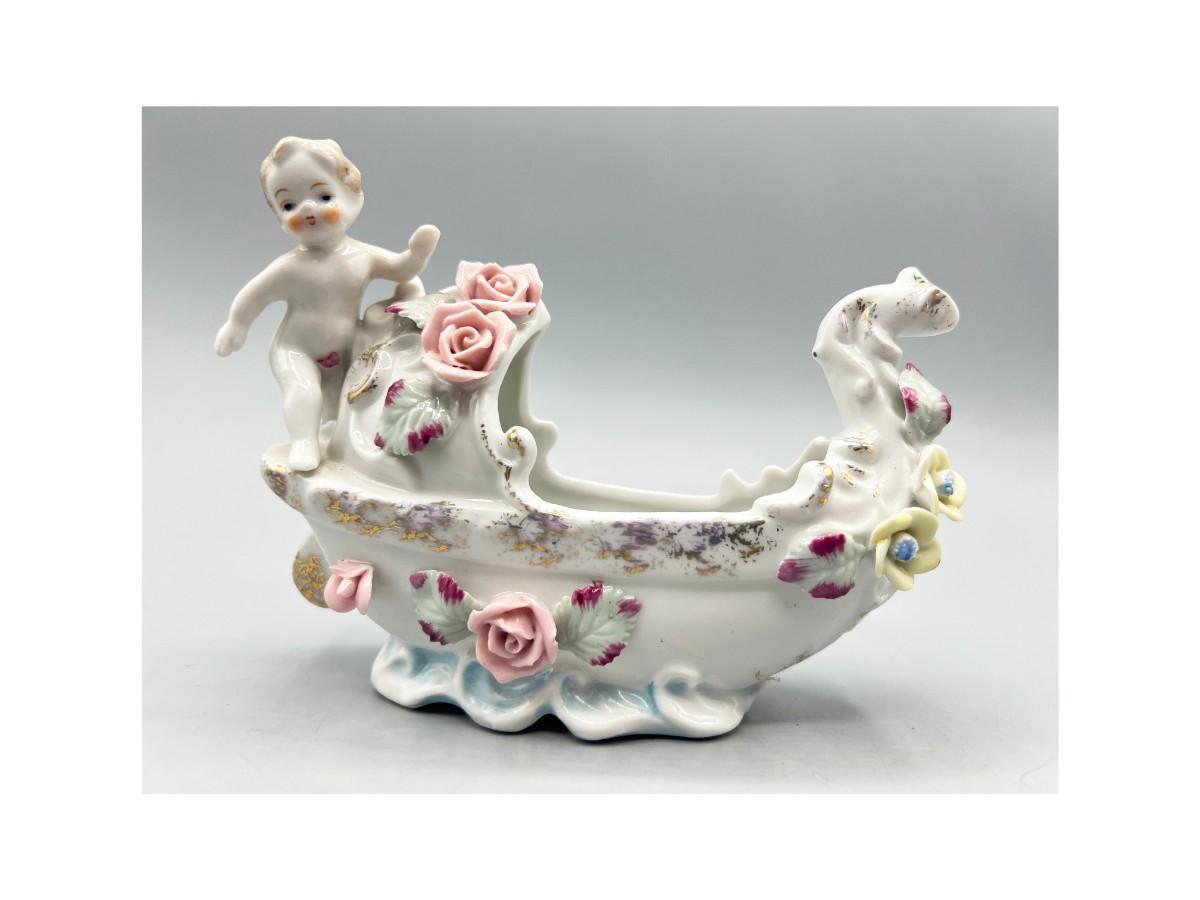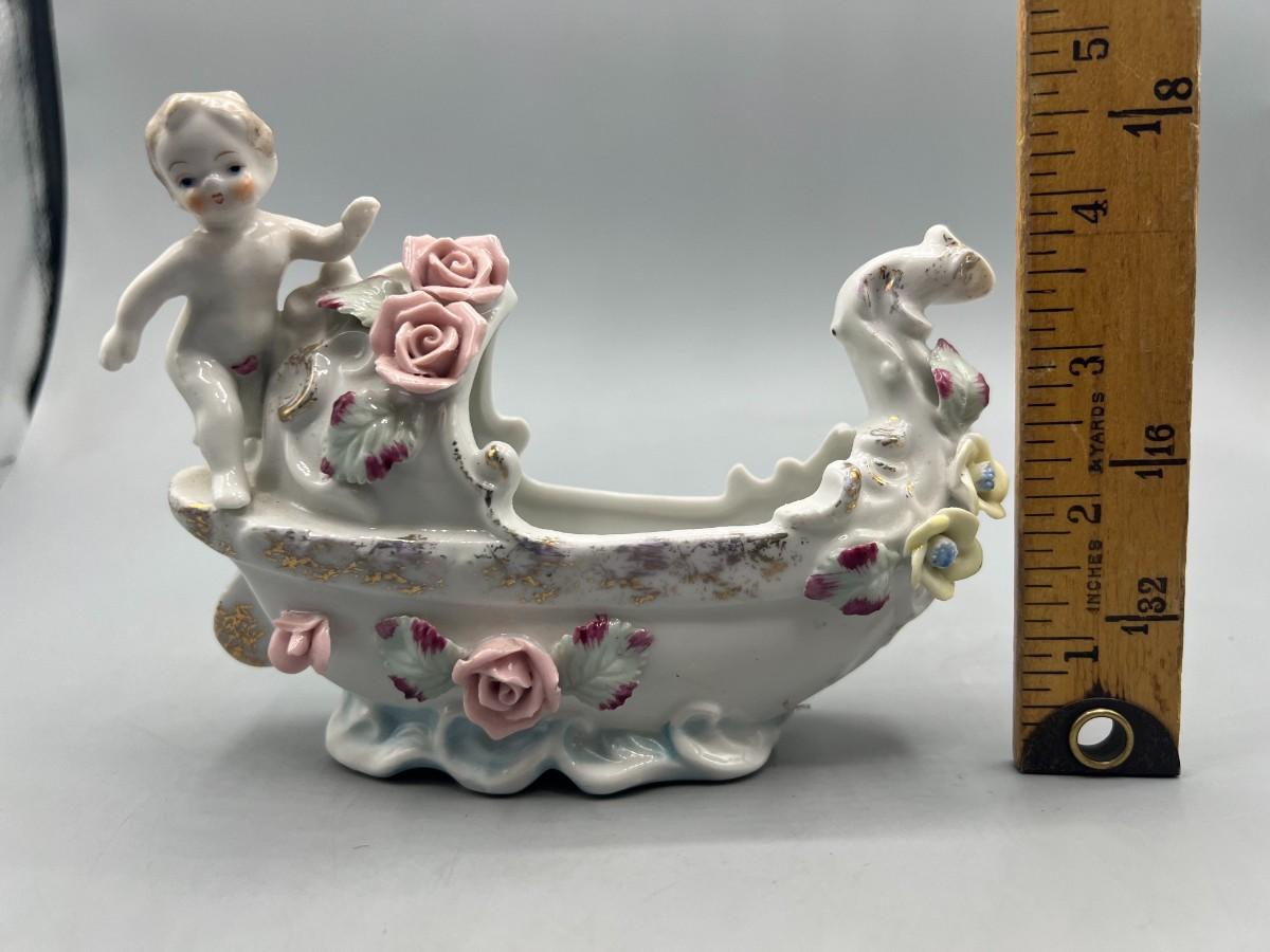 Vintage Hand Painted Rose Ceramic Baby Basket Mid Century Figurine