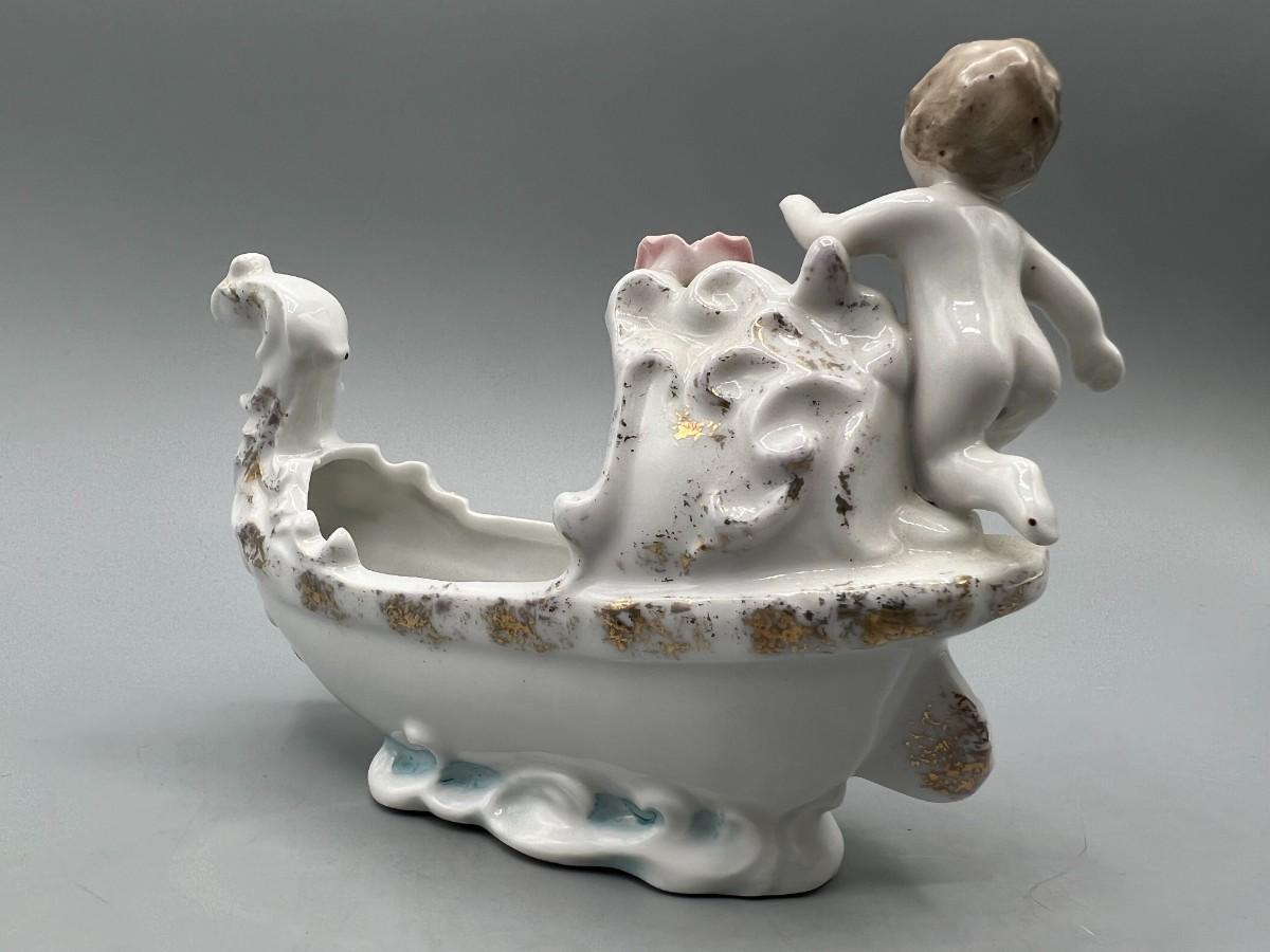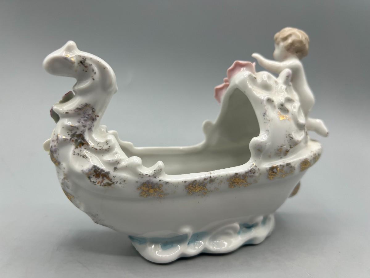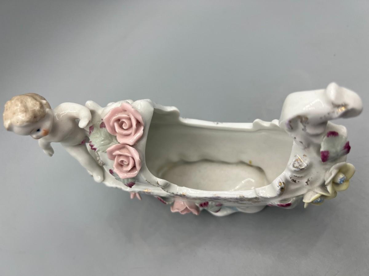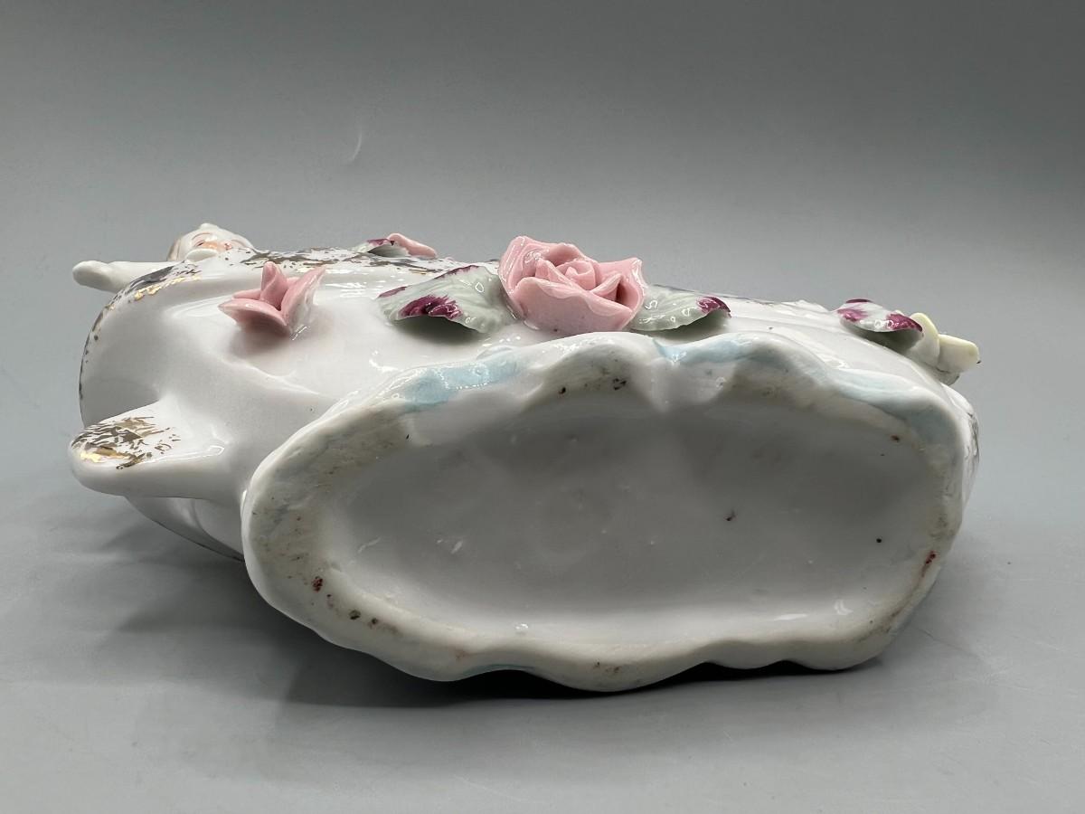 Vintage Hand Painted Rose Ceramic Baby Basket Mid Century Figurine