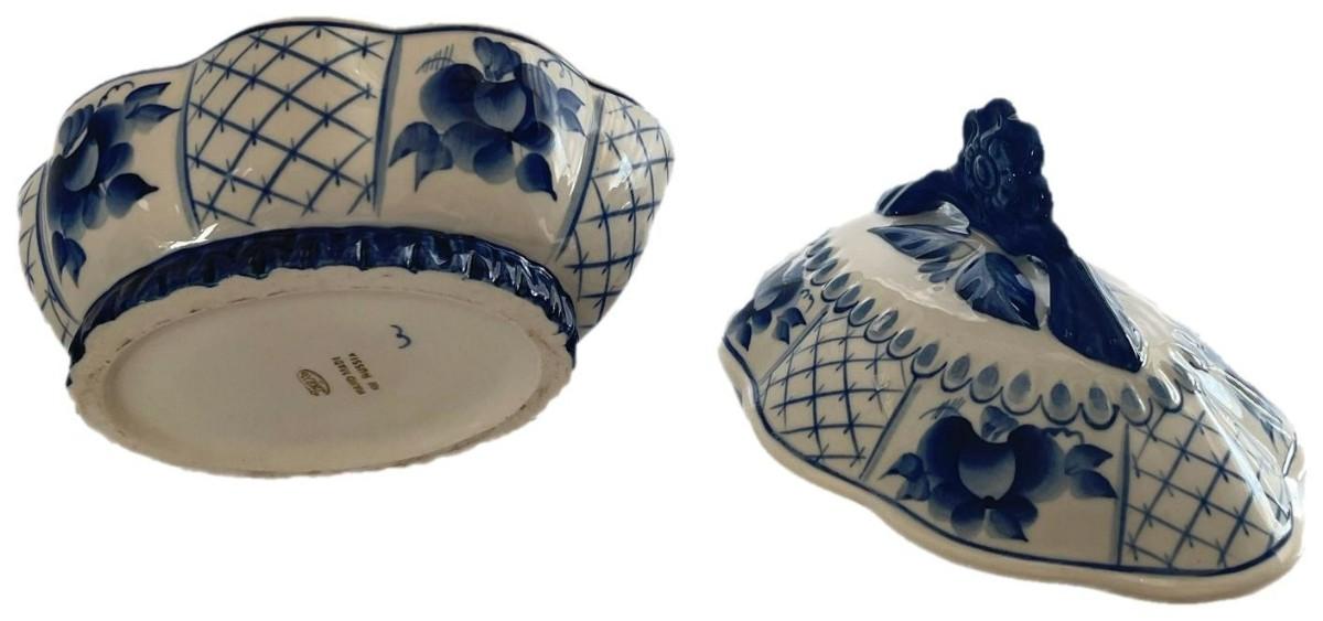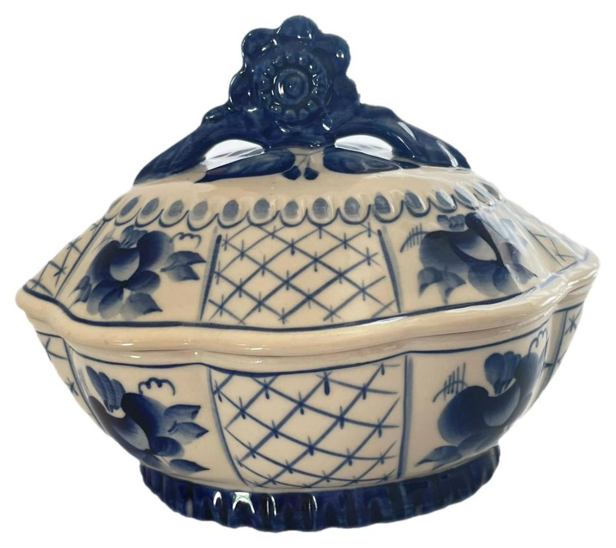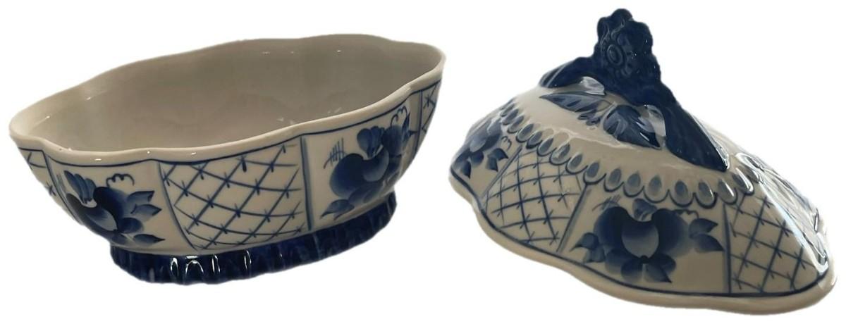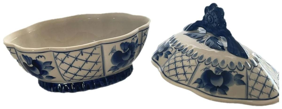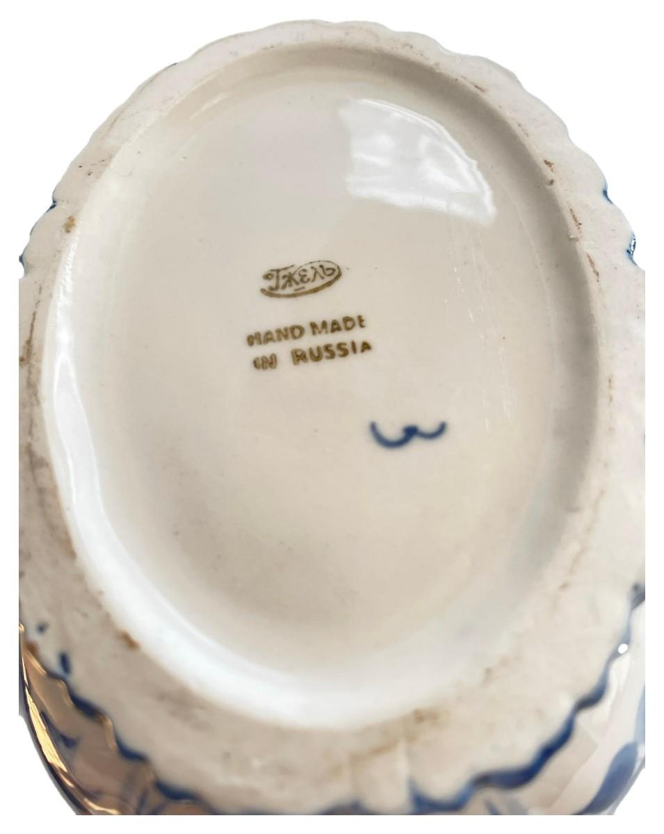 Stunning bowl, manner of Meissen, made in Russia and hand painted. Measures 8" X 6" X 6 3/4" in height. In VG conditions.