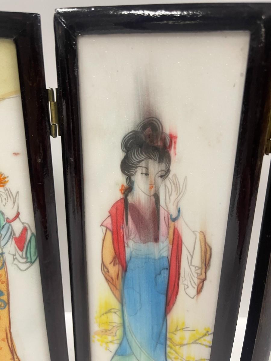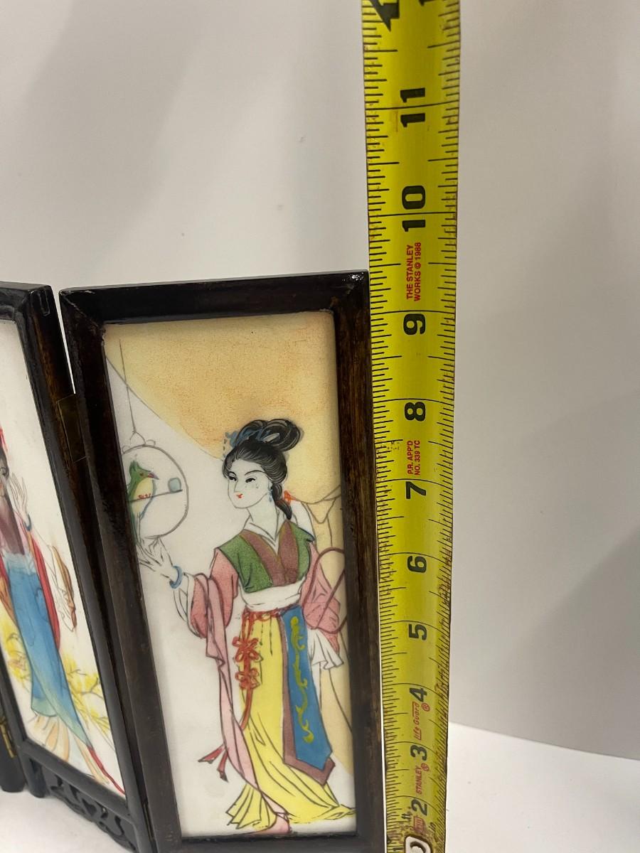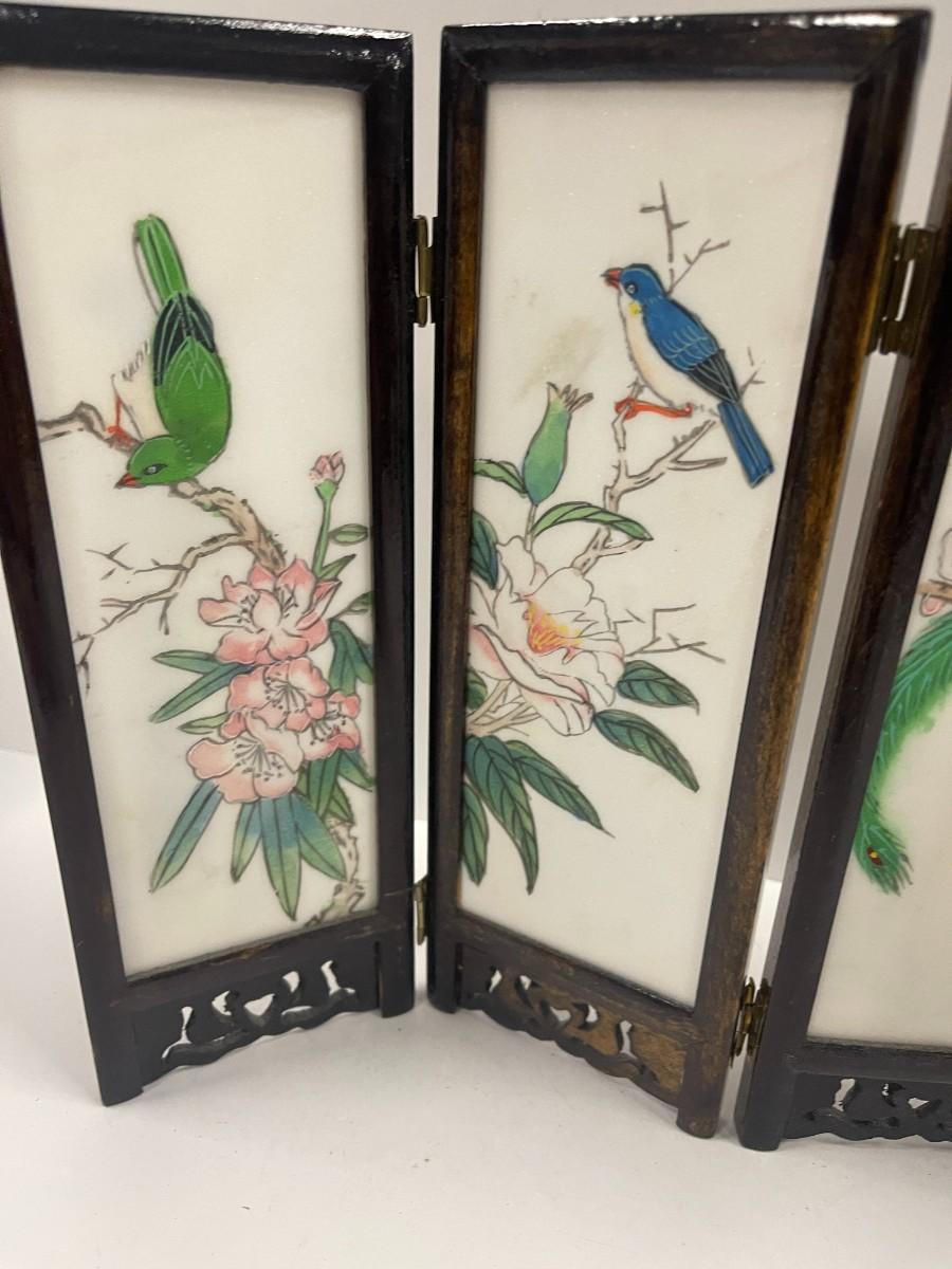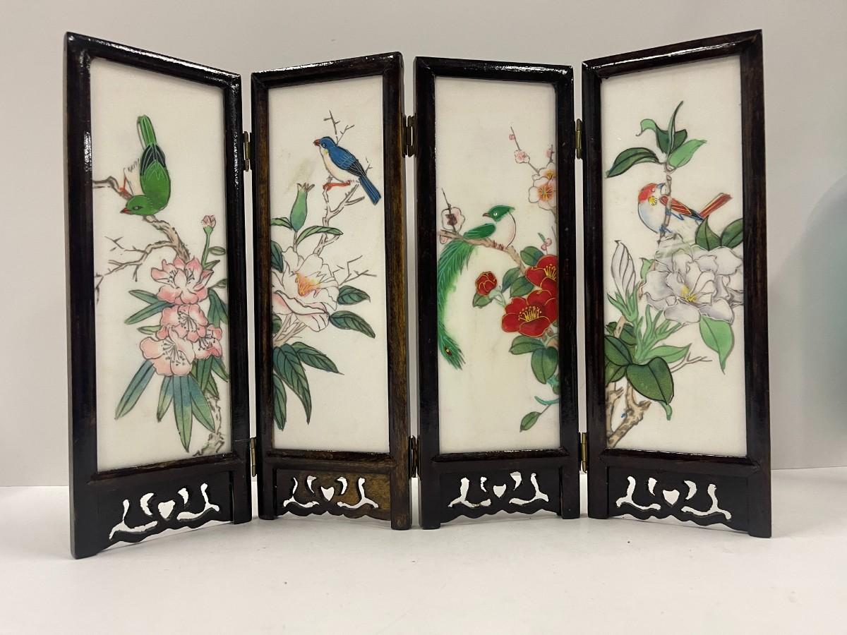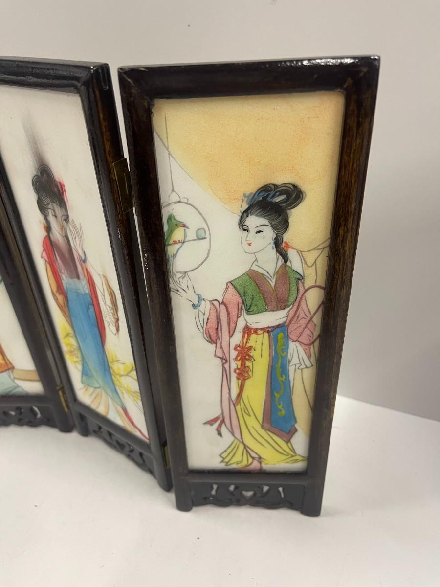 Vintage hand painted table top screen. Each panel is a stone of some sort that has been hand painted. One side depicts birds and flowers, the other side depicts female figures. One of the female figures was damaged. 9 1/2" high. Each panel is about 3 1/2" wide; 14" wide in total. One of the hinges needs new screws so it's not properly attached.