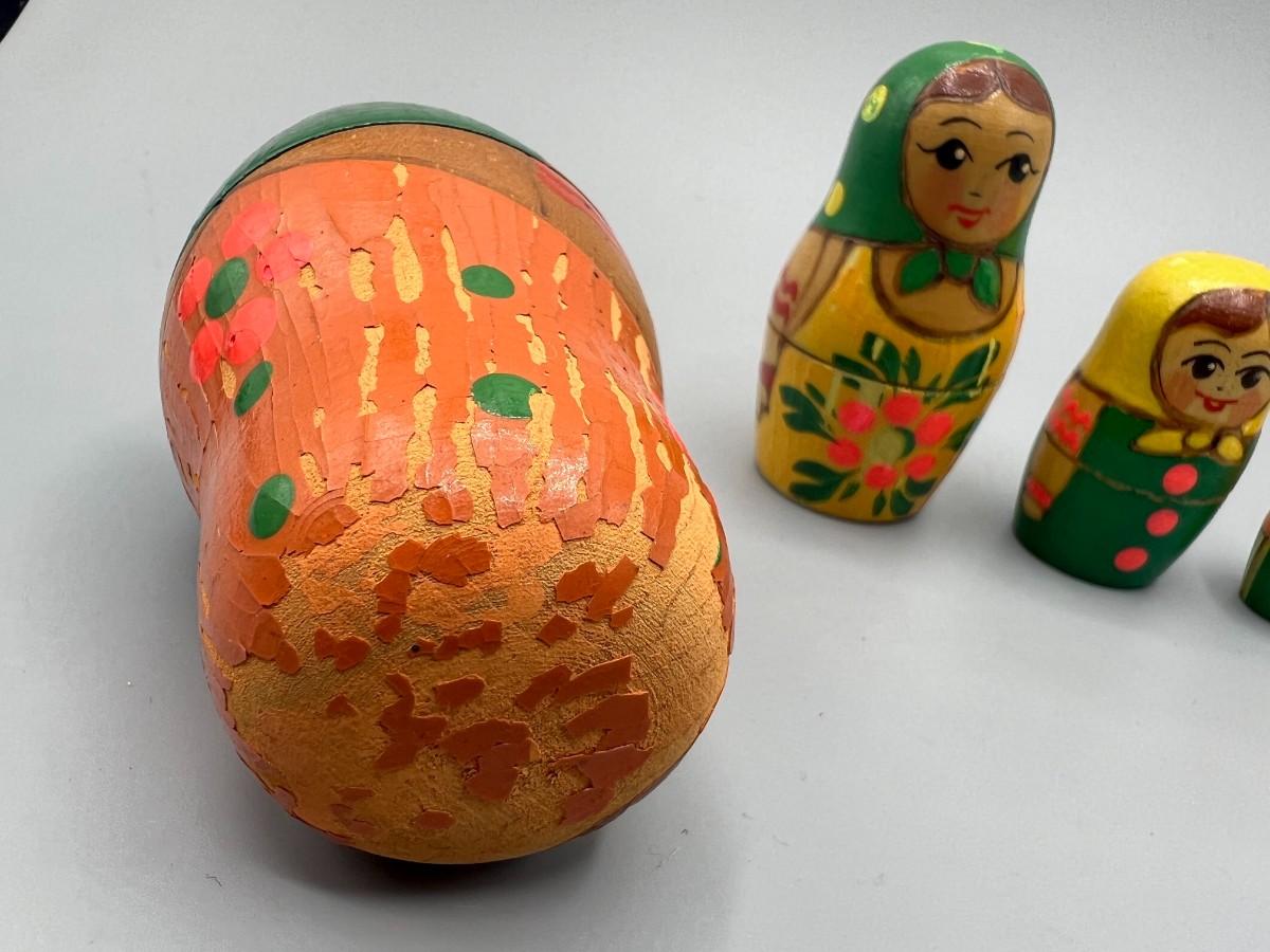 Vintage Hand Painted Wooden Russian Nesting Babushka Matryoshka Dolls Russian Souvenir, the paint is chipping on some parts of the dolls and there are some light cracks on the wood, but there is no other significant damage and is in good collectible condition. Check pictueres for more details and for sizing.