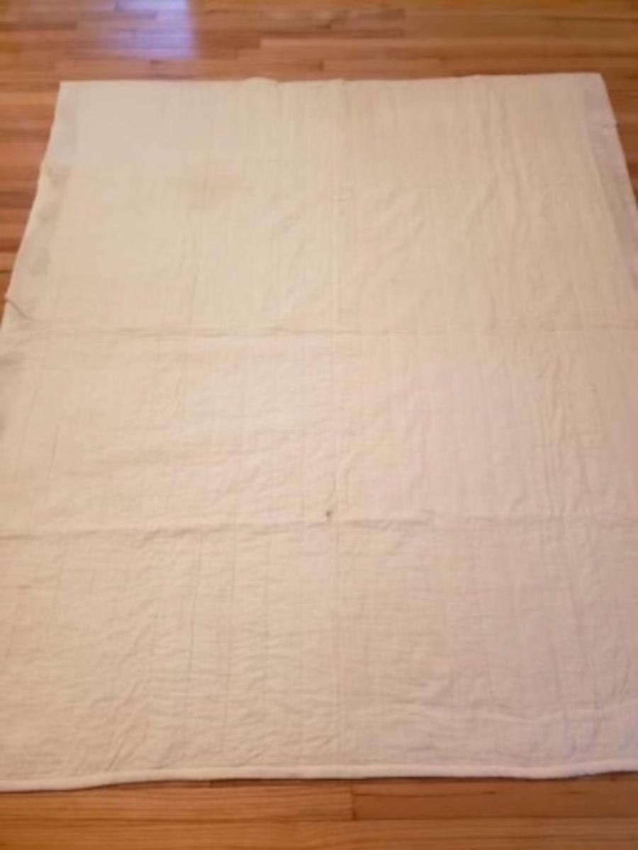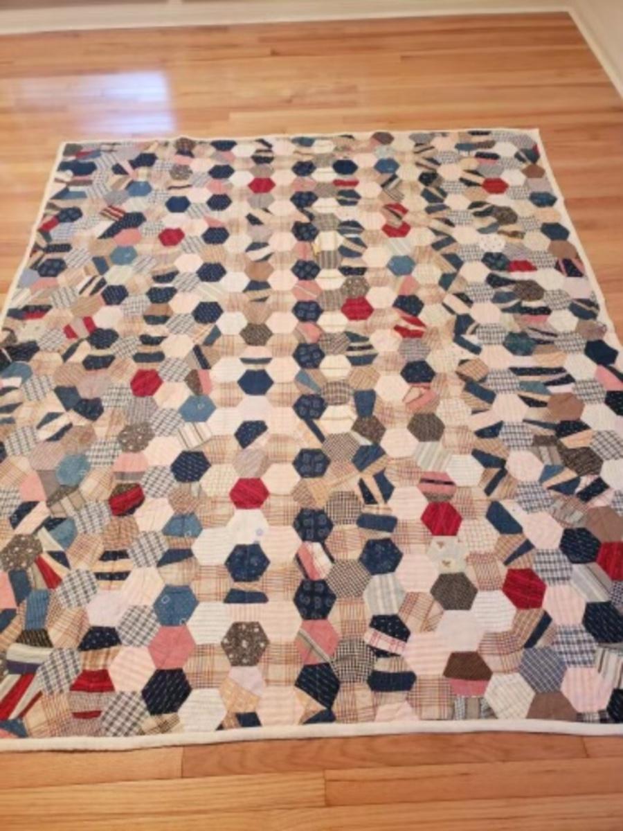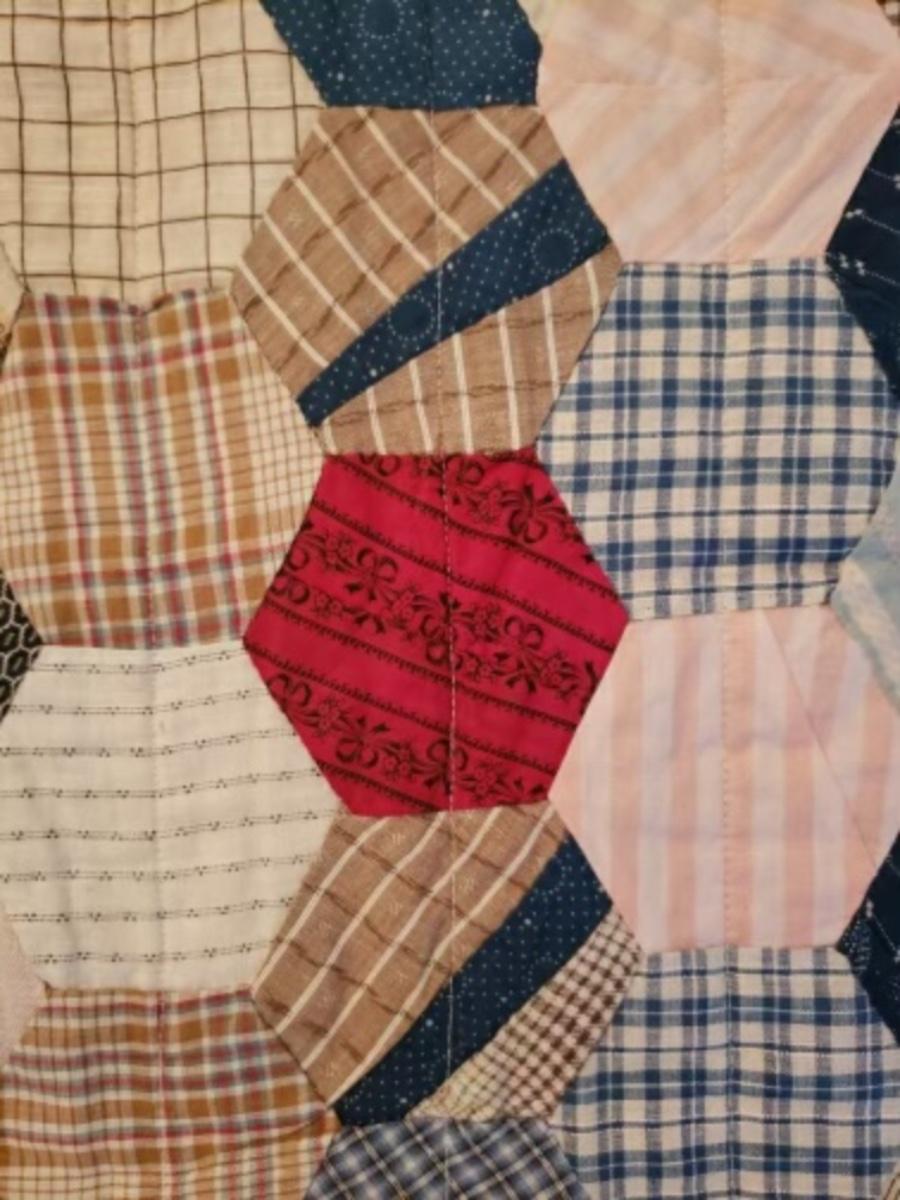 Vintage hand pieced machine quilted hexagon quilt.
