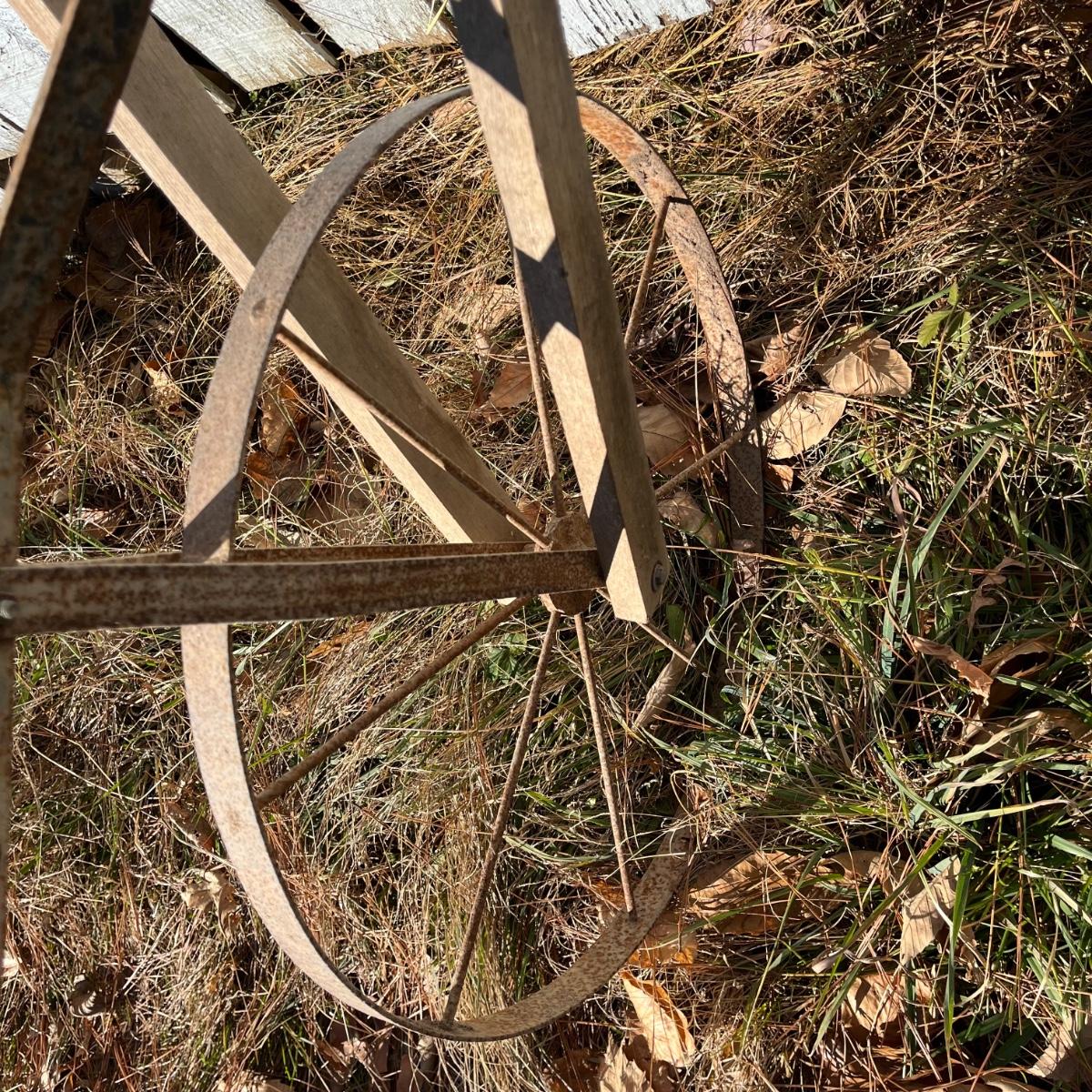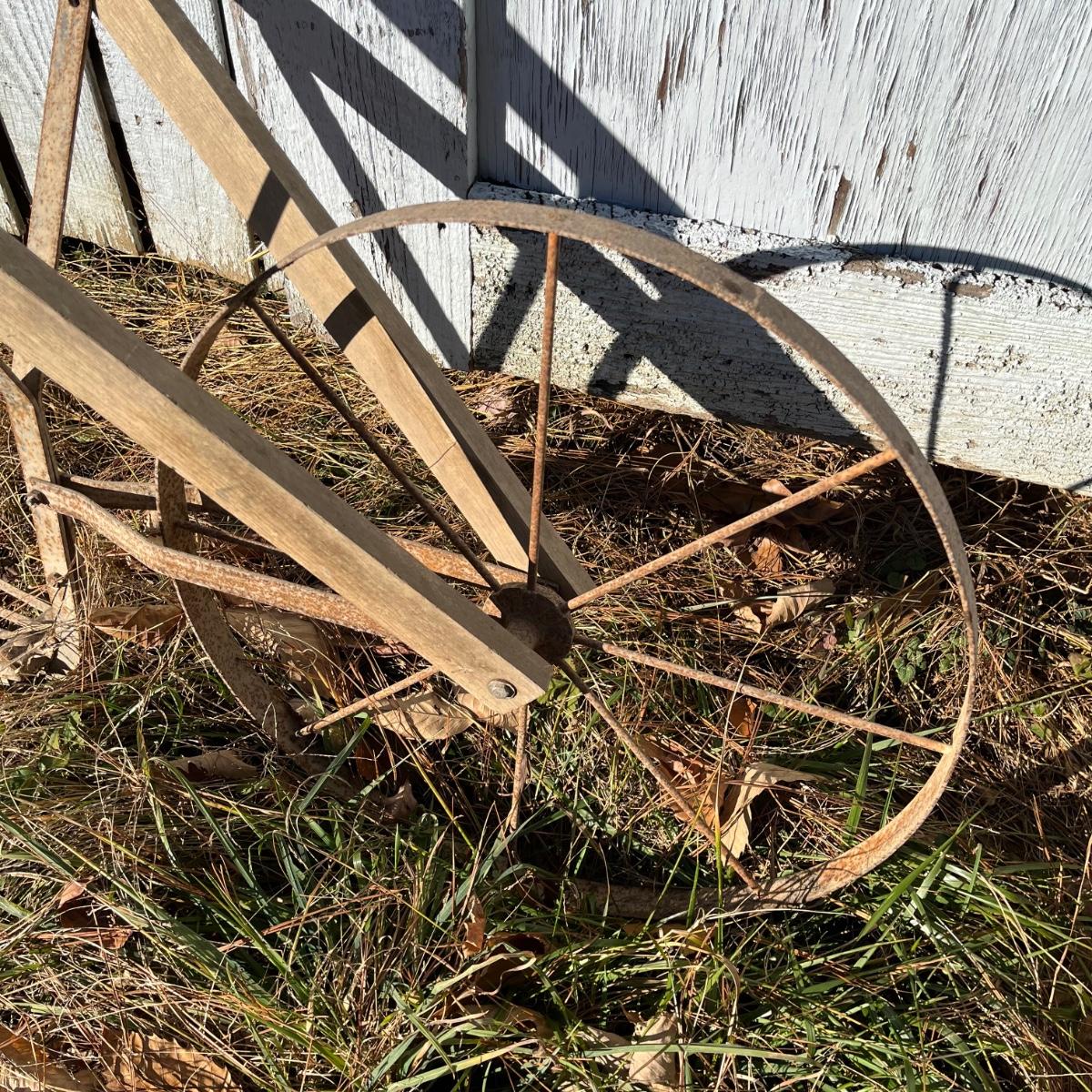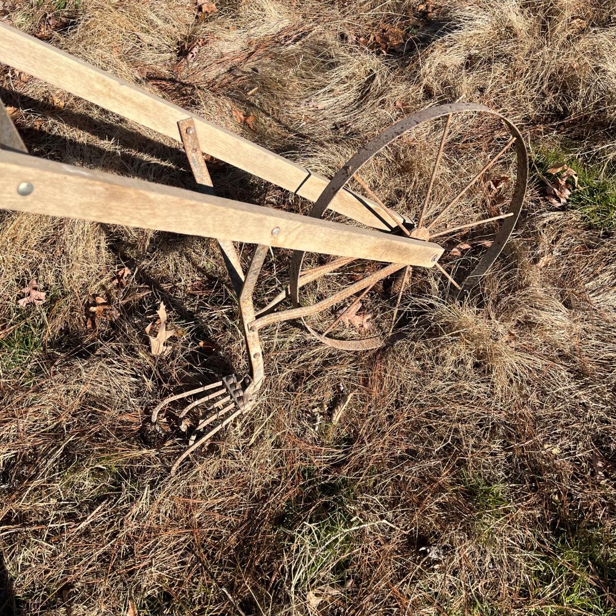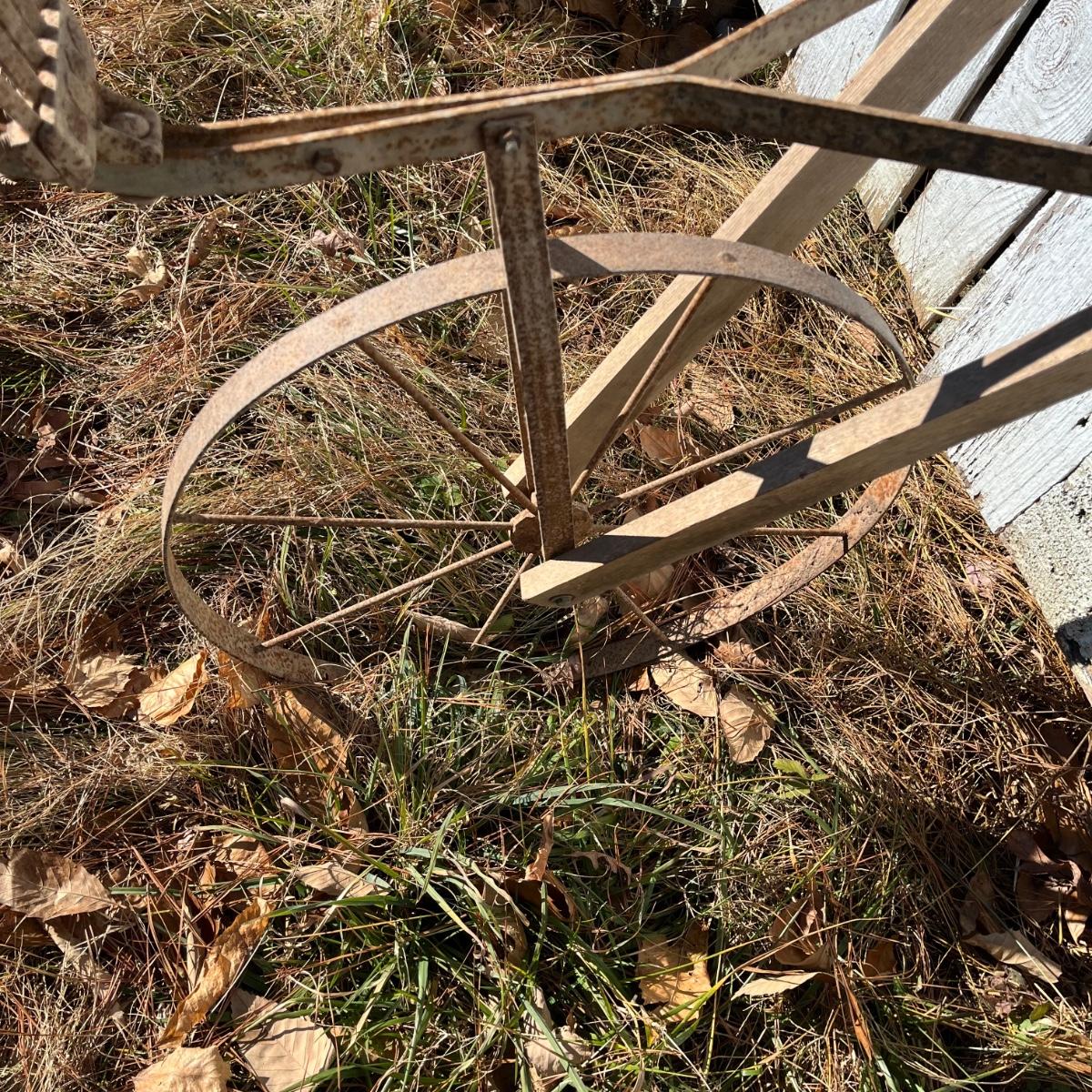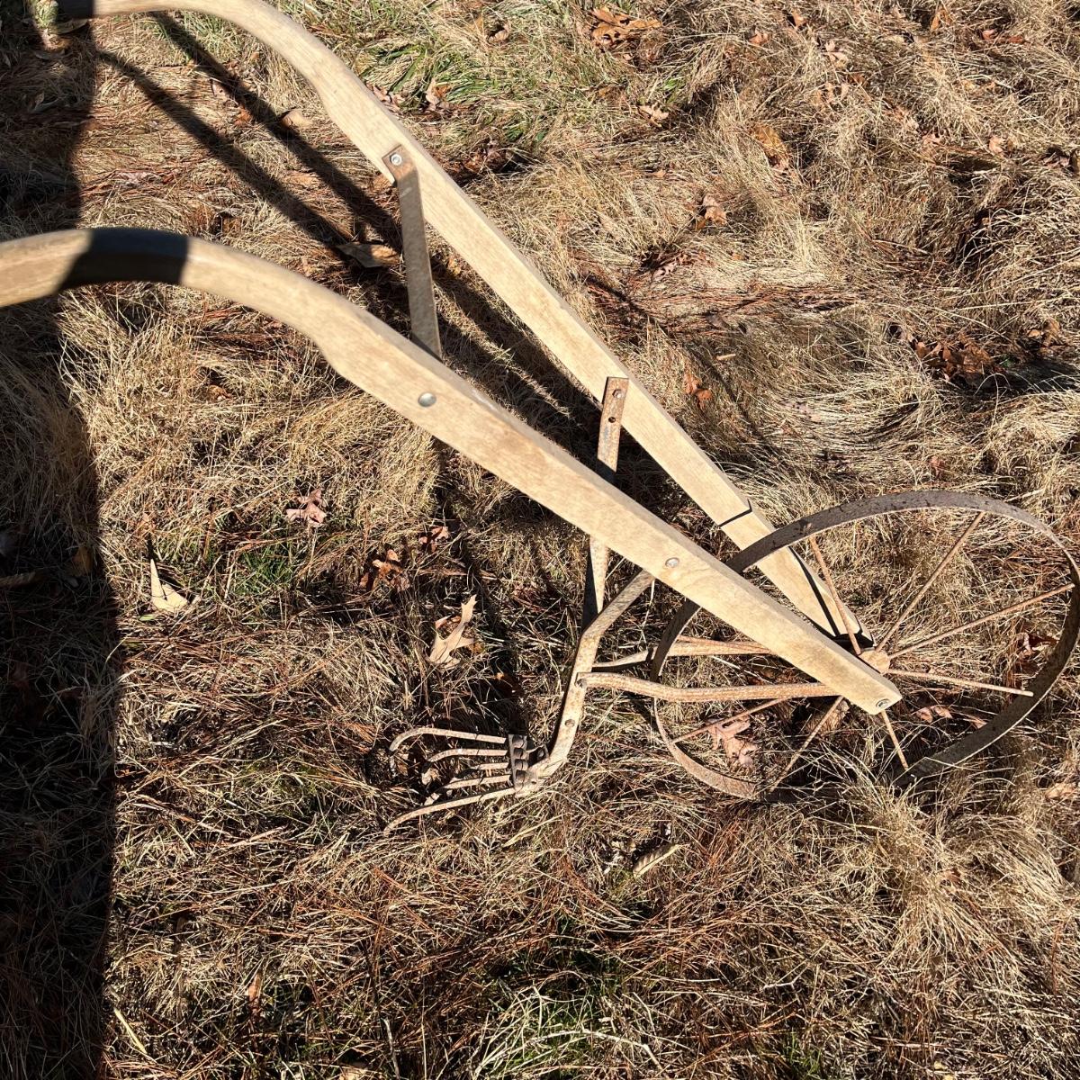 Lot includes a vintage hand plow that has wooden handles with a metal wheel and plow. Plow measures 21” x 62” x 42”.