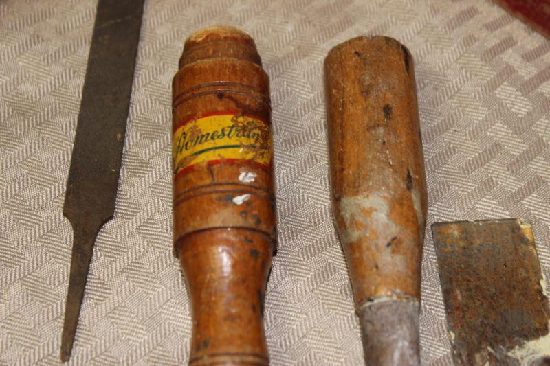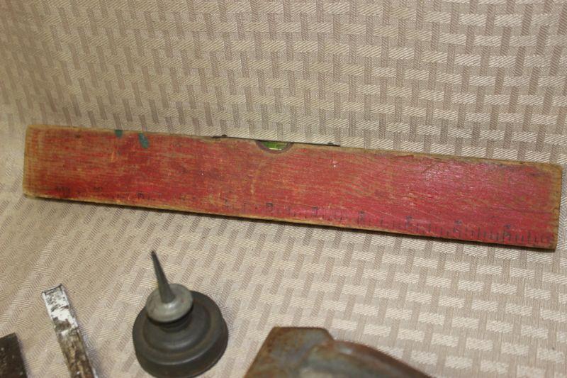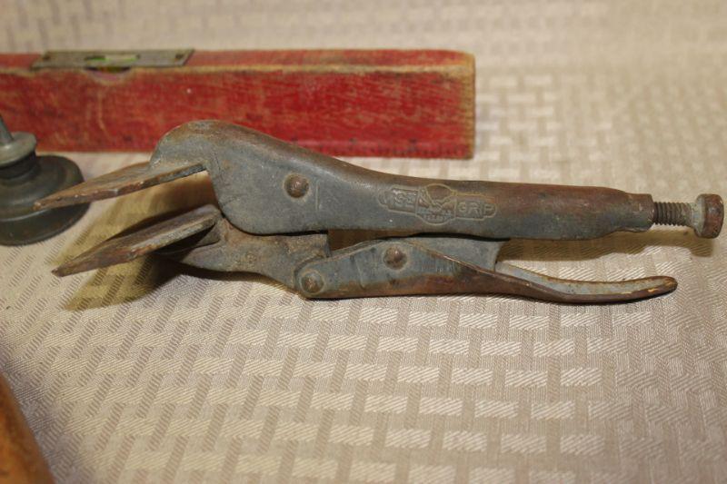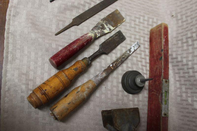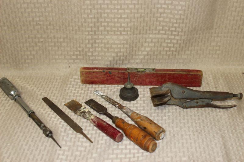 8 piece vintage tool lot. Included is a couple wood handle chisels, wood handled scraper, wood level, clamp vise grips, flat file, oil can, and a small hand push drill with bits. The level is a Johnson Level & is 12" in length. The hand push drill is a Yankee #41 and has 9 bits. All are used and have signs of wear.