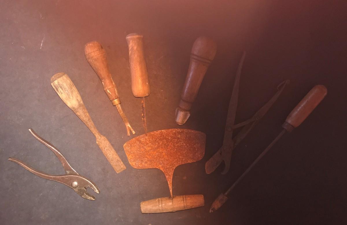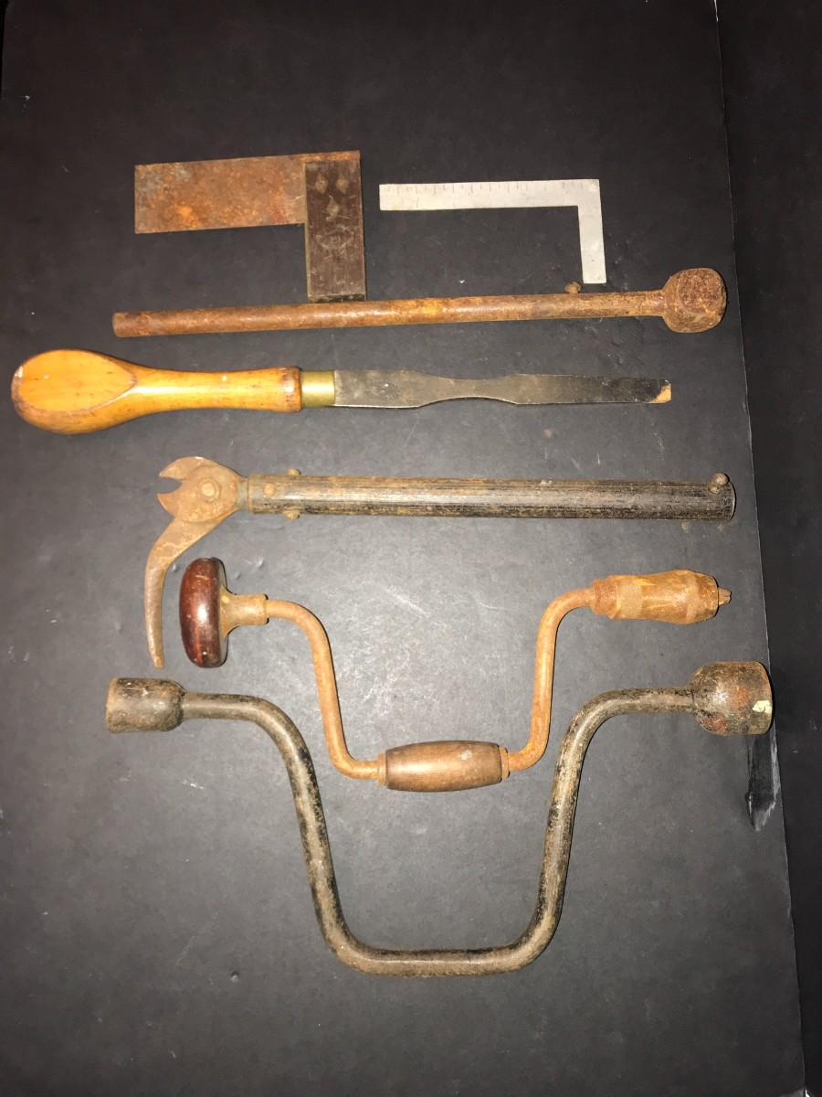 block planes , hand shaver , square , lug wrench , chisel, bit brace ,pliers , nail pry , blade holder , cutter , rod , hand shaver .