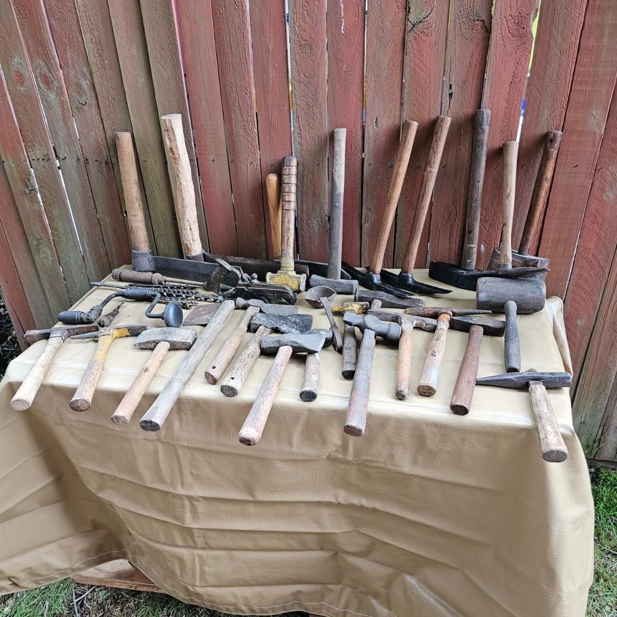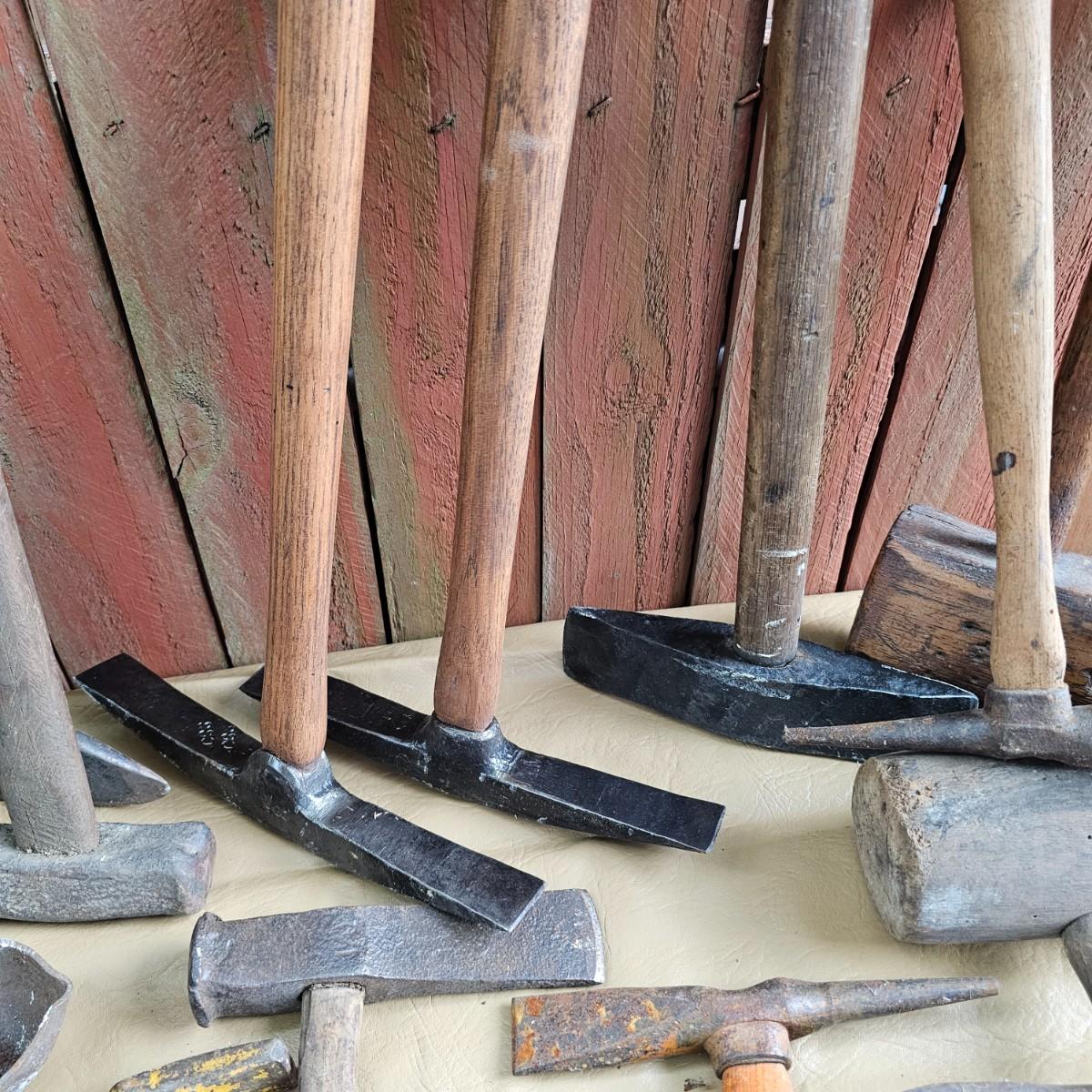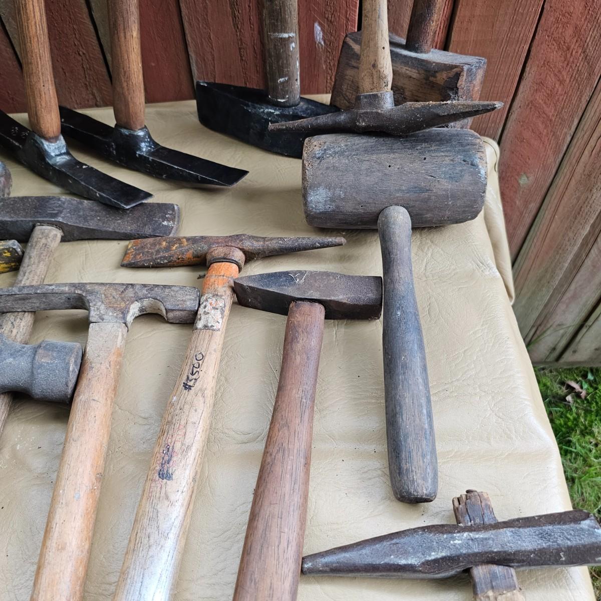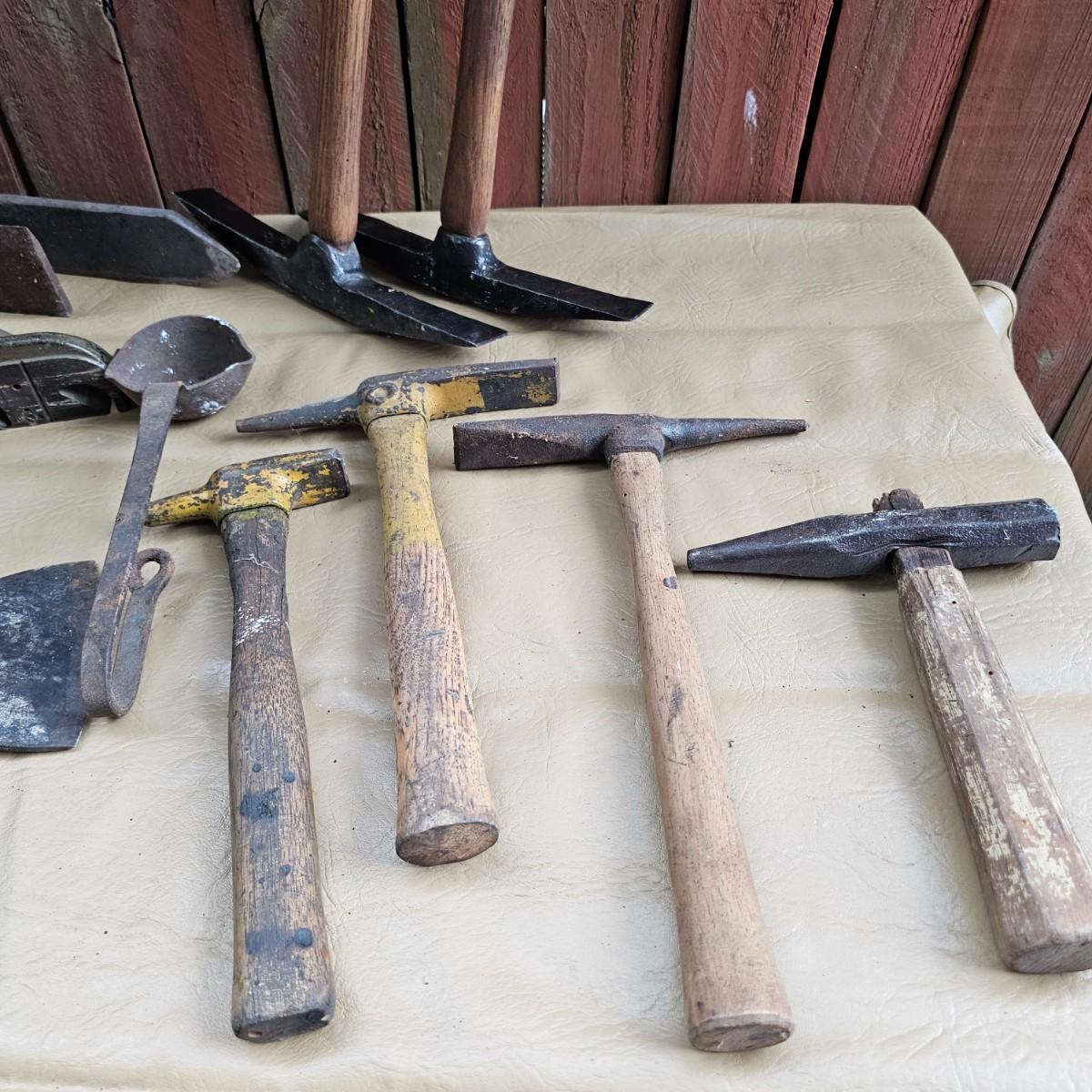 Large collection of vintage hand tools. Axes, hammers, hatchets, mallets, picks, etc. Vintage brace and bit with several drill bits. Stanley, metal plane. Many items used for rockhounding or excavation. Three wood handle froes for splitting shingles and shakes. Largest froe is 15" x 18". See photos for details. Local pickup only.