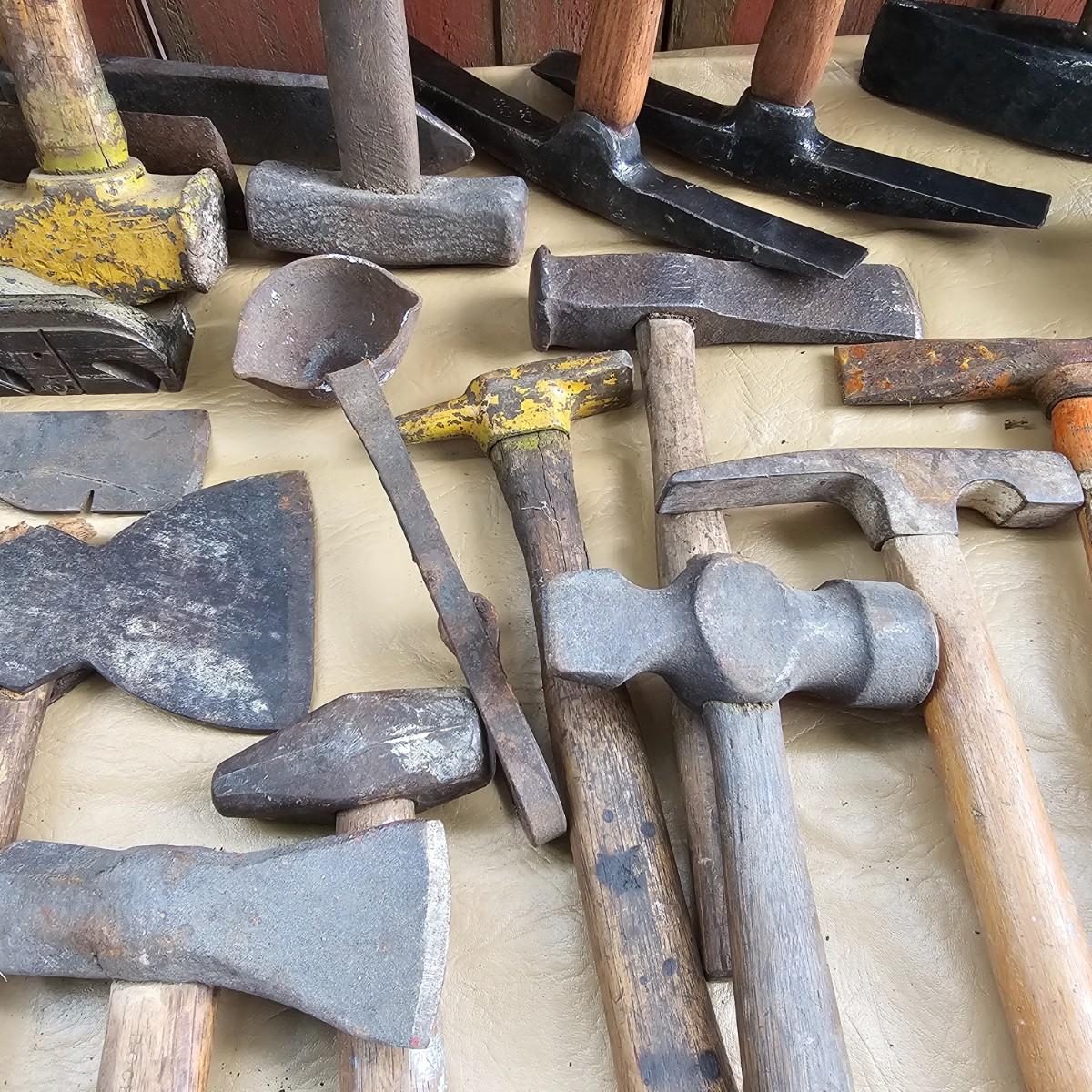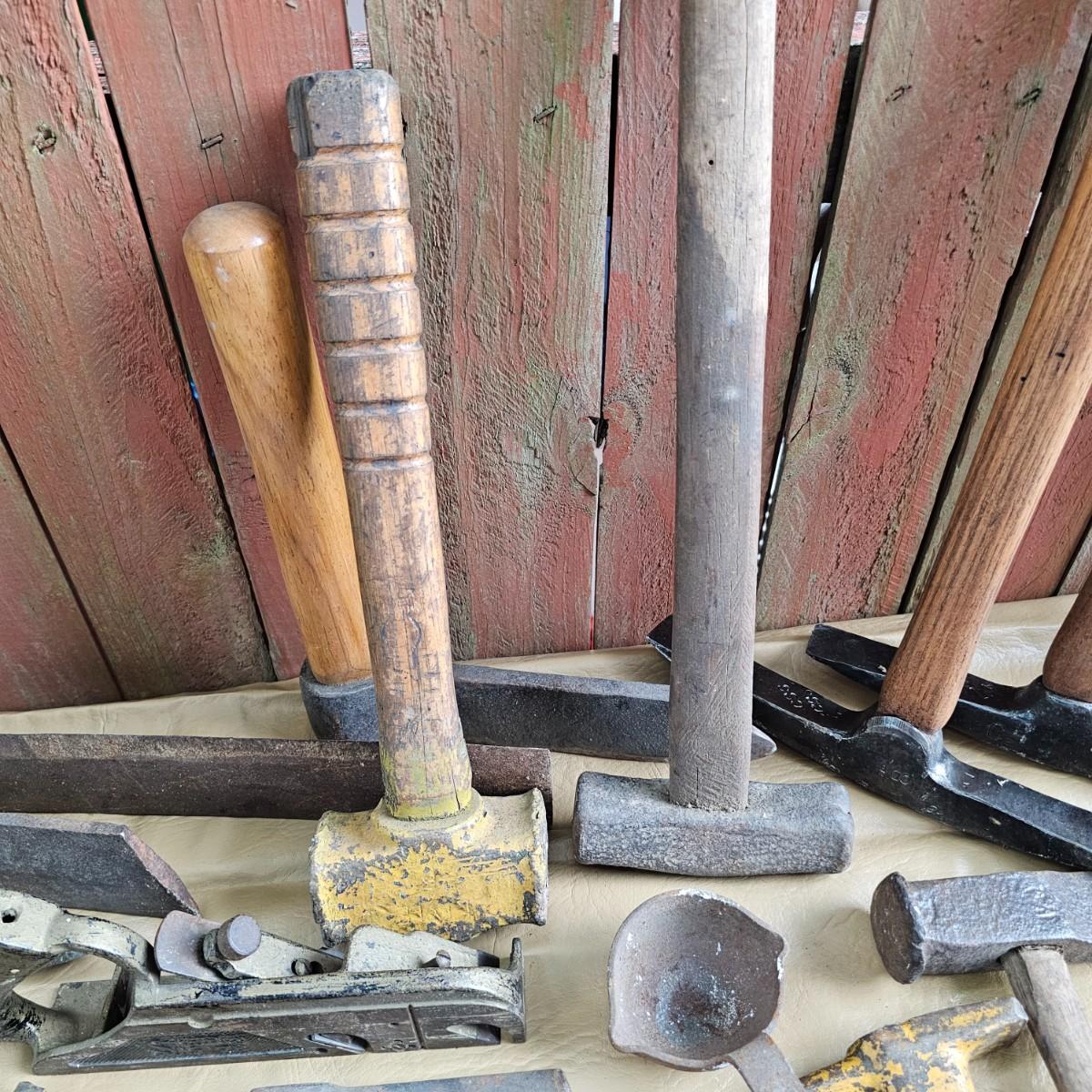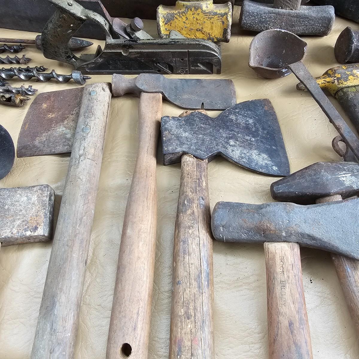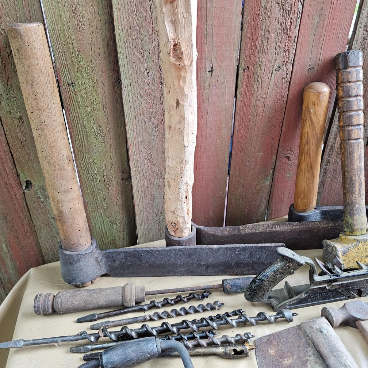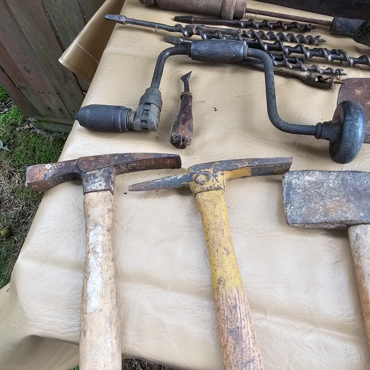 Large collection of vintage hand tools. Axes, hammers, hatchets, mallets, picks, etc. Vintage brace and bit with several drill bits. Stanley, metal plane. Many items used for rockhounding or excavation. Three wood handle froes for splitting shingles and shakes. Largest froe is 15" x 18". See photos for details. Local pickup only.
