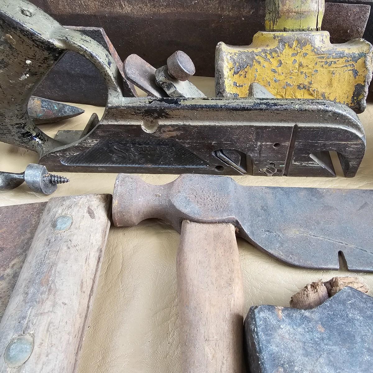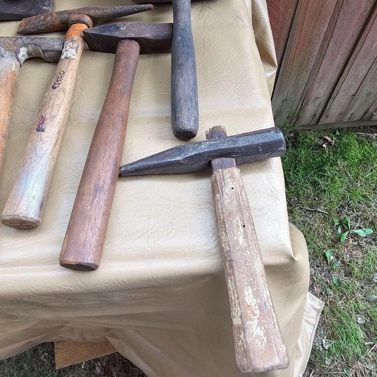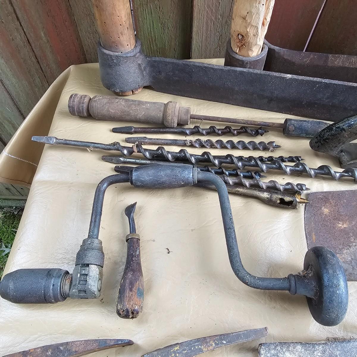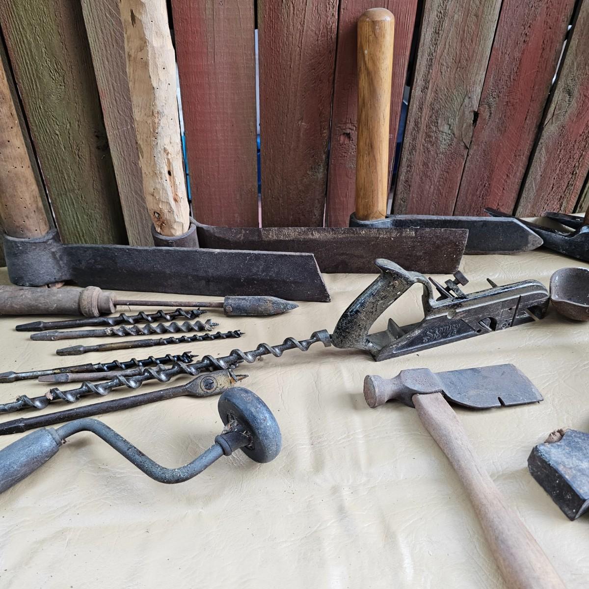 Large collection of vintage hand tools. Axes, hammers, hatchets, mallets, picks, etc. Vintage brace and bit with several drill bits. Stanley, metal plane. Many items used for rockhounding or excavation. Three wood handle froes for splitting shingles and shakes. Largest froe is 15" x 18". See photos for details. Local pickup only.