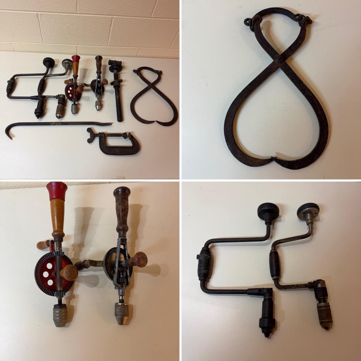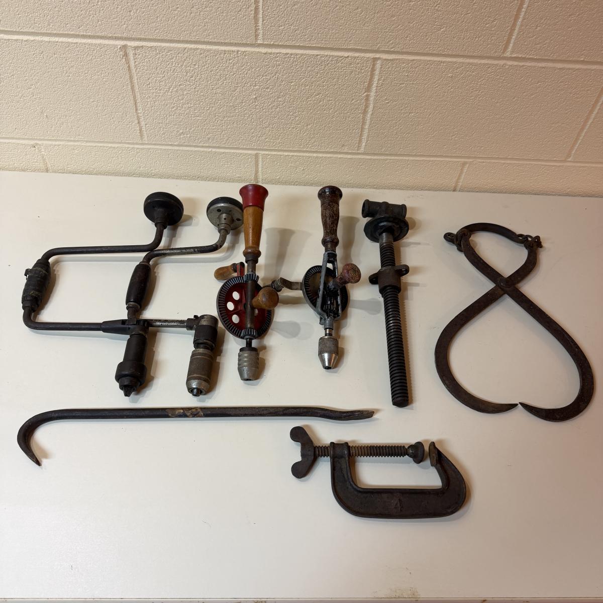 Lot includes one Stanley hand drill, three unmarked hand drills, cast iron ice tongs, c clamp, crow bar and a screw leg vise. Largest drill measures 8” x 3” x 15”H.