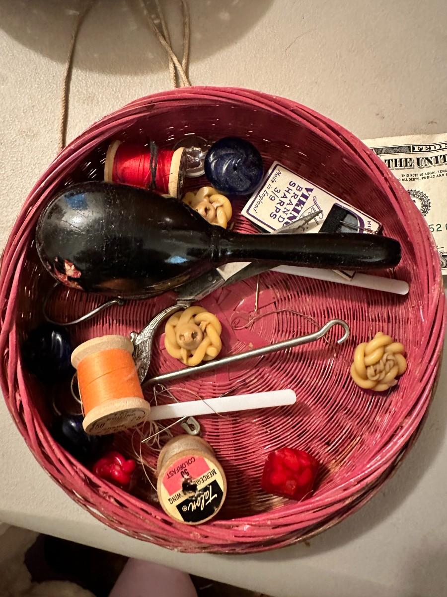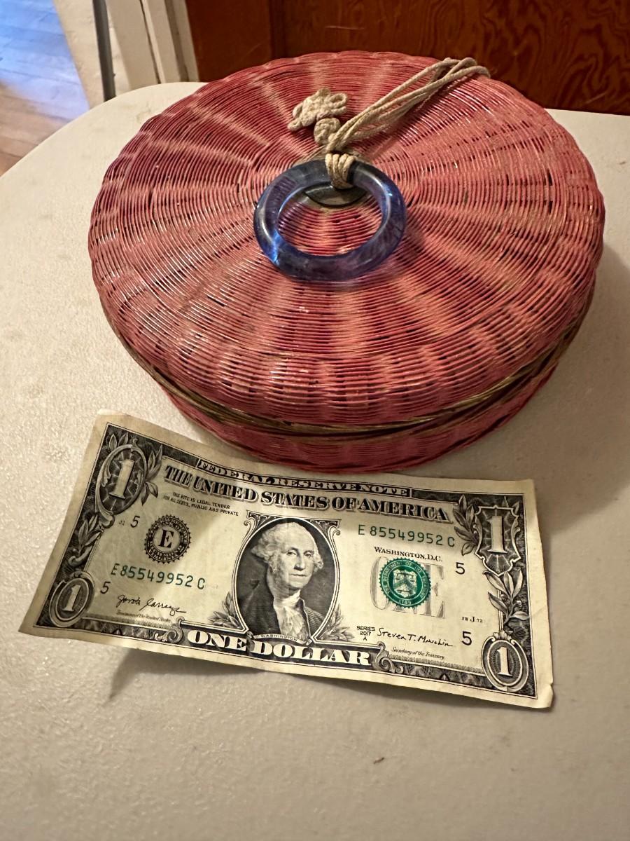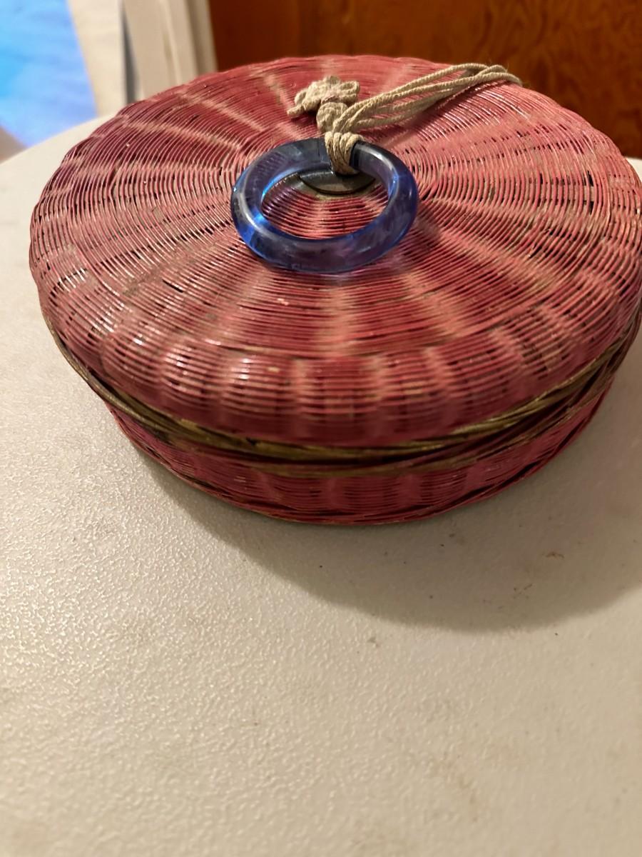 Vintage Hand Woven Asian Wicker Lidded Basket Tassels Coin Stone Ring Shells
