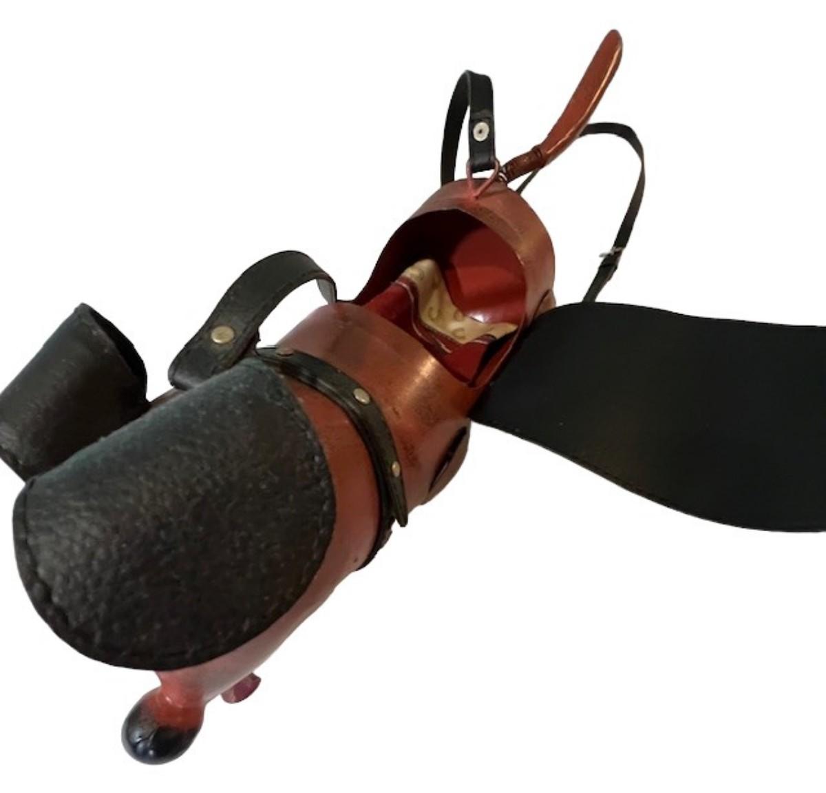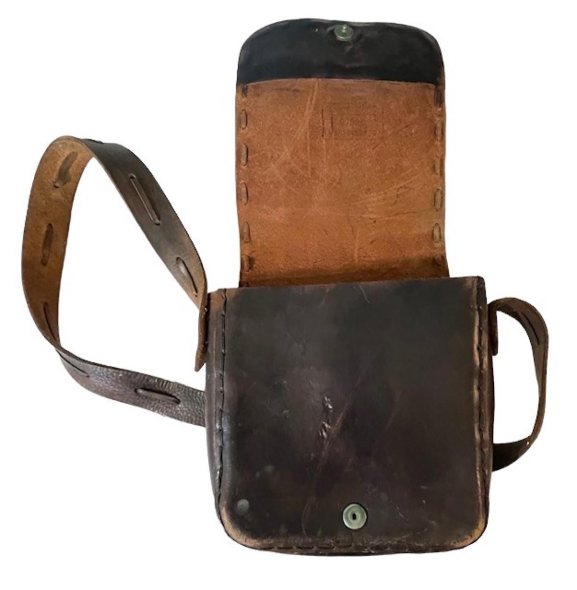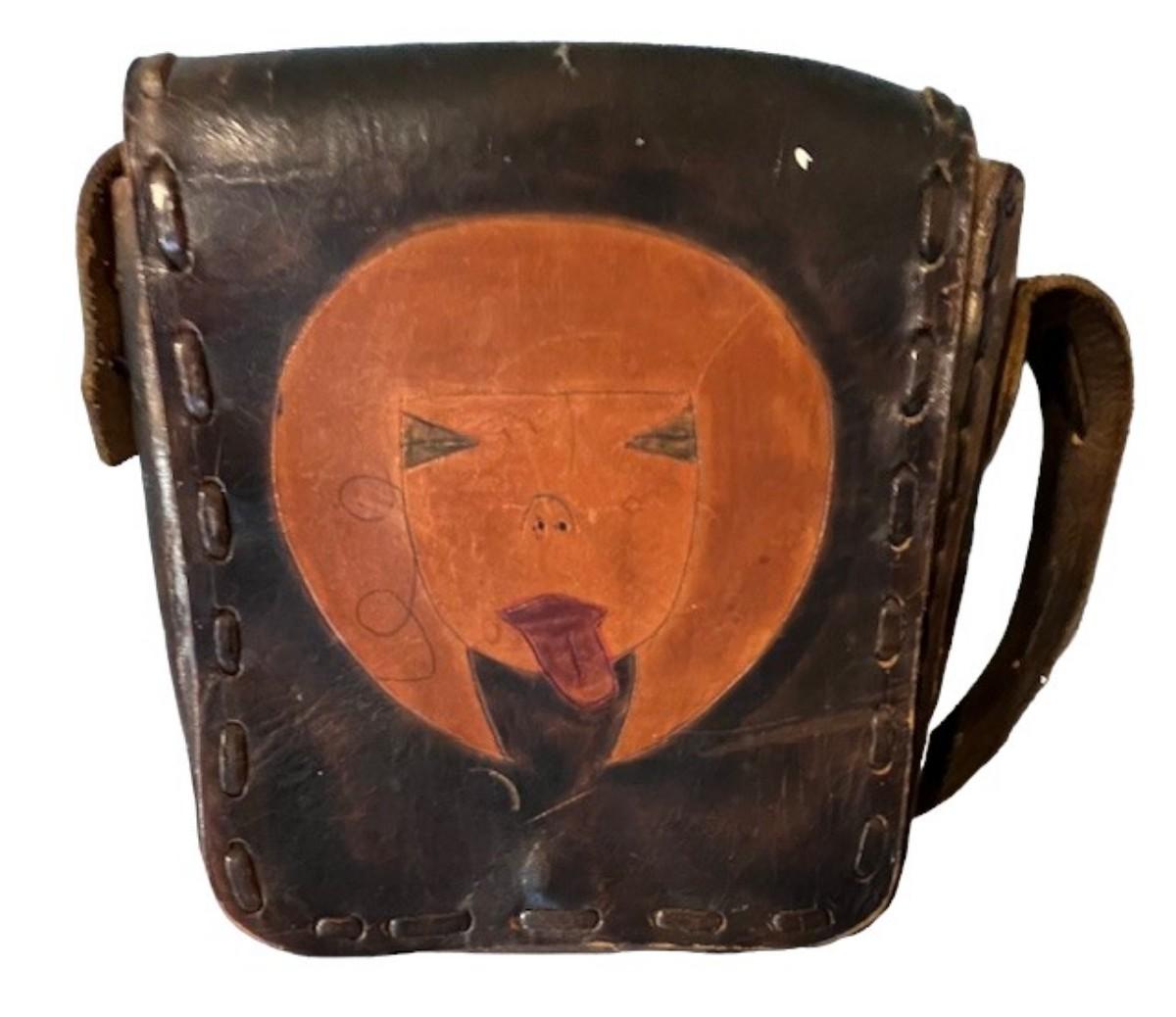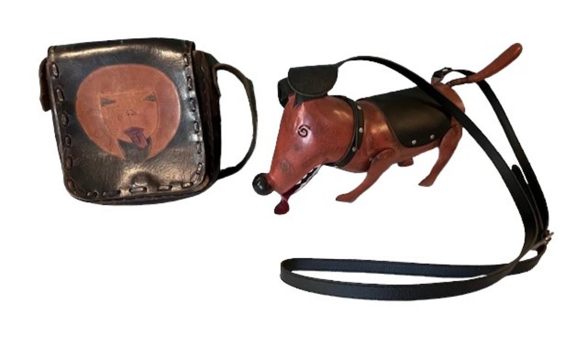 Includes a leather satchel made in Brazil, and a metal and leather dog purse. Measurement of largest: 15"L.