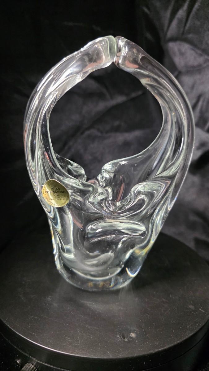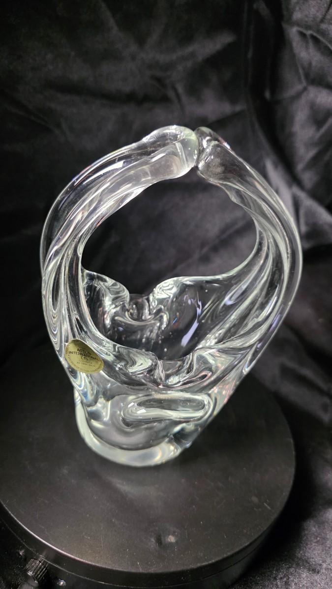 This vintage hand-blown art glass basket features a sculptural freeform silhouette that immediately reflects the Mid-Century Modern aesthetic. Crafted from thick, clear crystal glass, the piece showcases fluid pulled lines and a distinctive split handle that curves inward, creating depth, movement, and visual balance from every angle. The weight and clarity of the glass give it a refined presence, whether viewed up close or displayed as part of a curated collection.