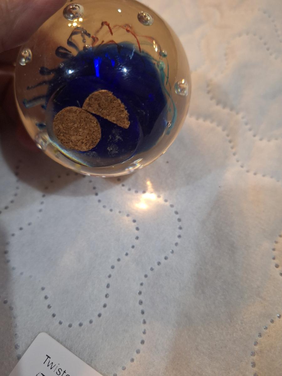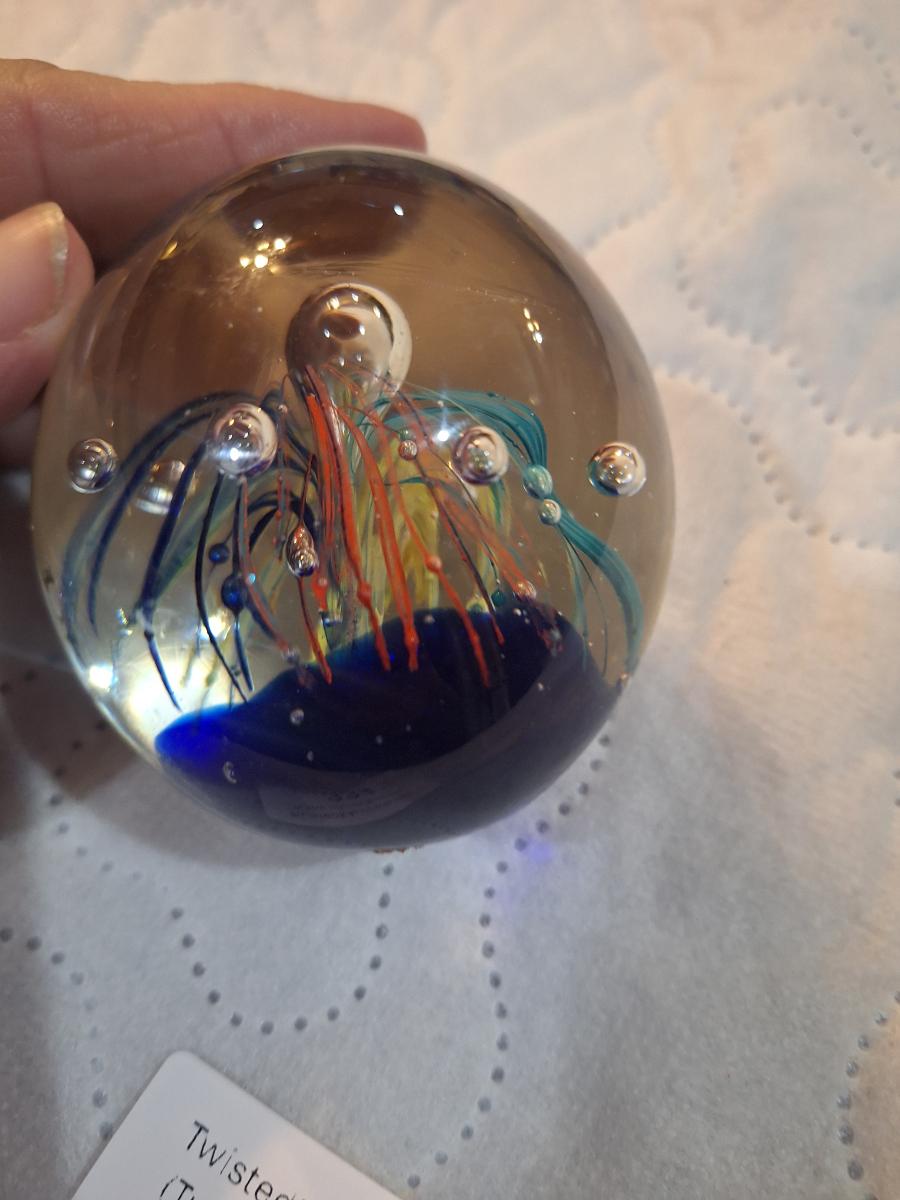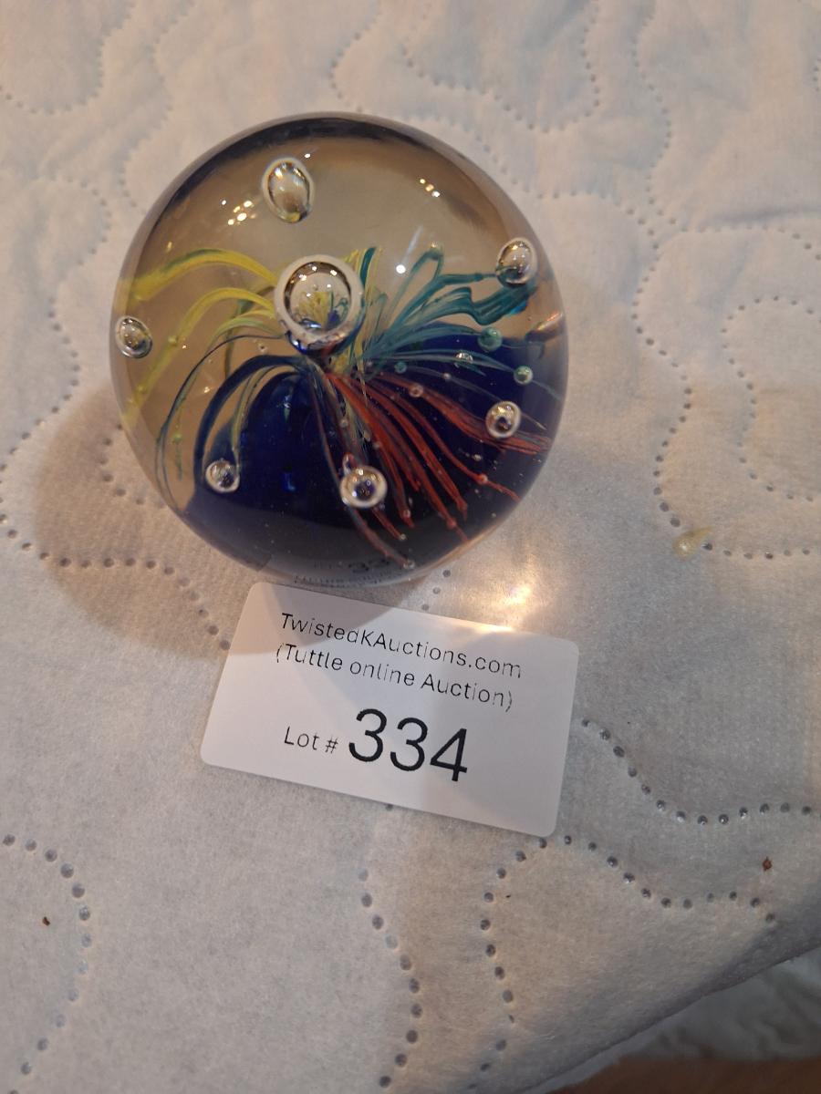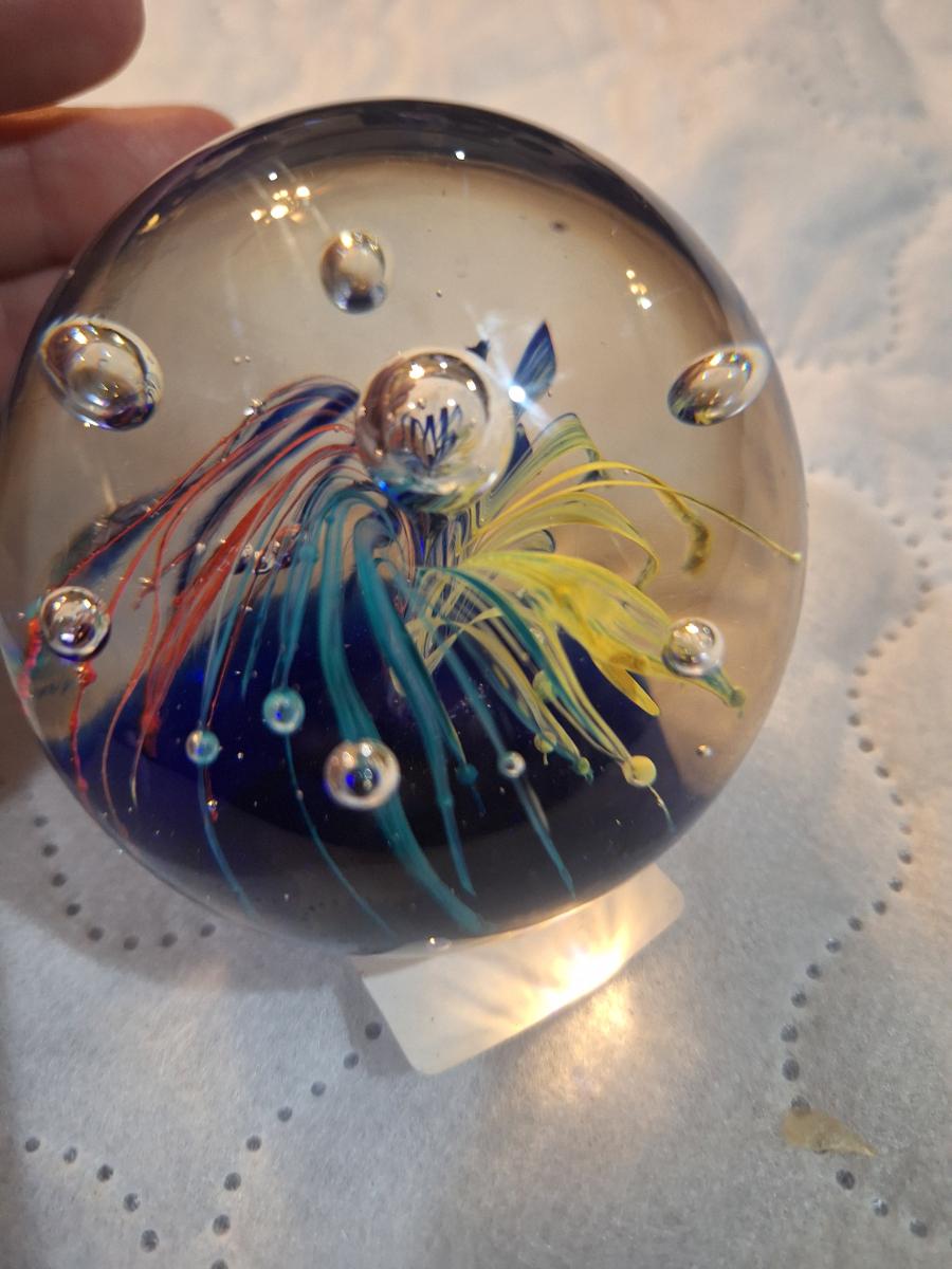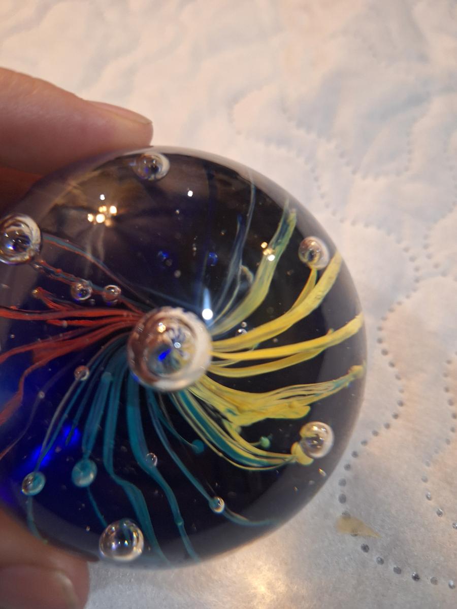 vintage hand-blown art glass paperweight, featuring a "firework" or "flower burst" design with controlled bubbles.