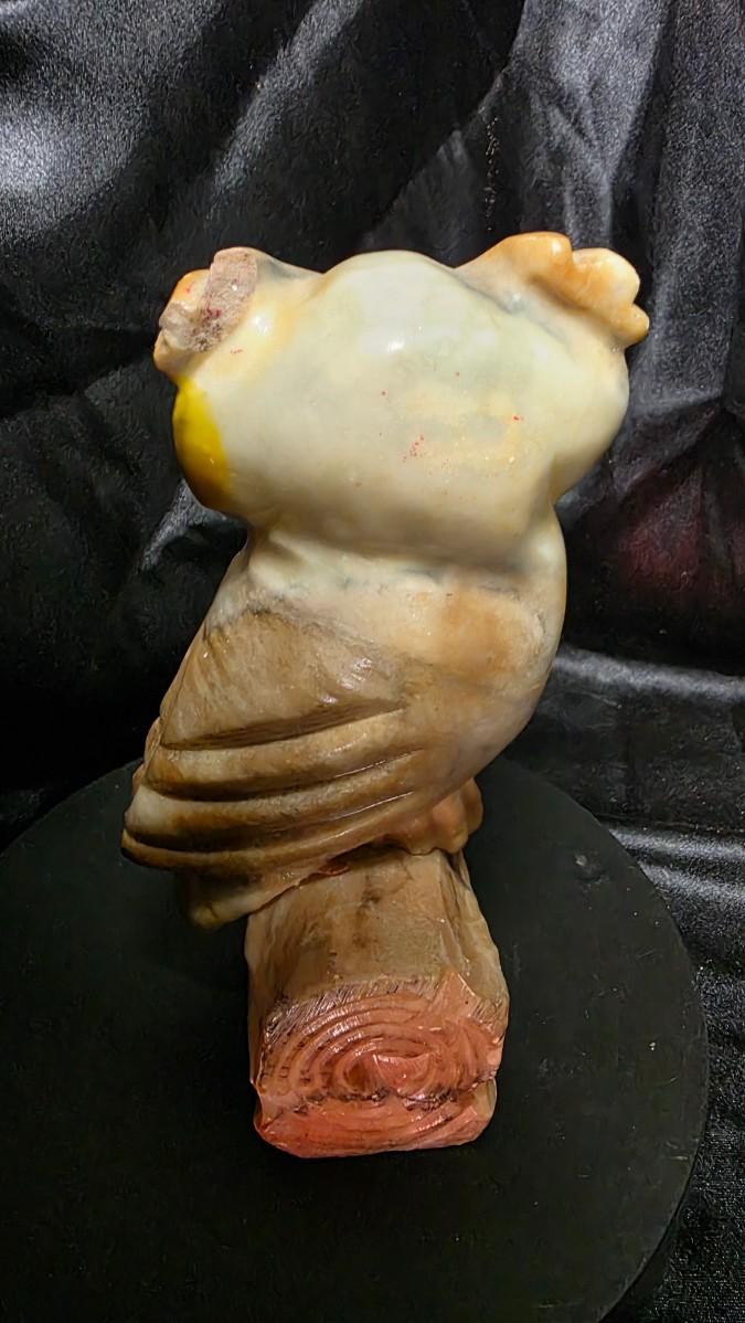 The owl’s expression is captivating. Inset glass eyes catch the light with a subtle glimmer, giving the sculpture a sense of awareness and character that feels almost alive. Carefully carved feather details wrap around the body, while the owl perches atop a stylized log base, grounding the piece with balance and visual weight. Every curve and contour reflects the skilled hands of Italian artisans who specialized in alabaster carving during the mid-20th century.