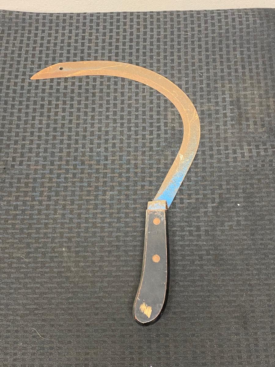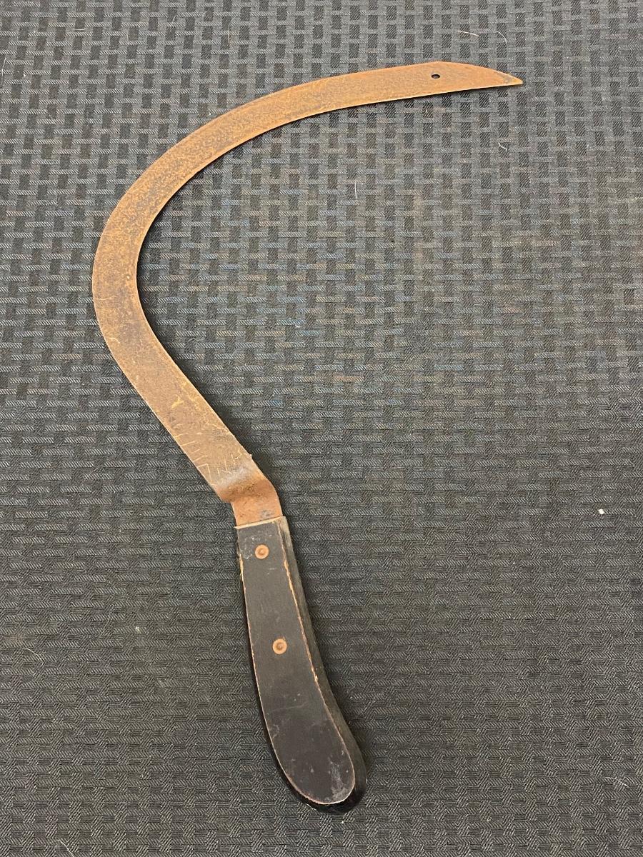 Handheld sickle. A bit rusty but useable. Great for garden use or horror prop.