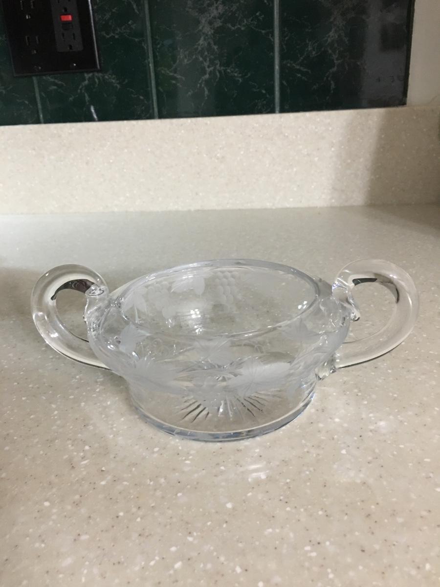 Vintage handled glass sugar bowl etched with grapes and leaves with with an indented starburst design on the bottom. No chips or cracks but scratches on the inside from use. 2 1/2” high and 4” wide.