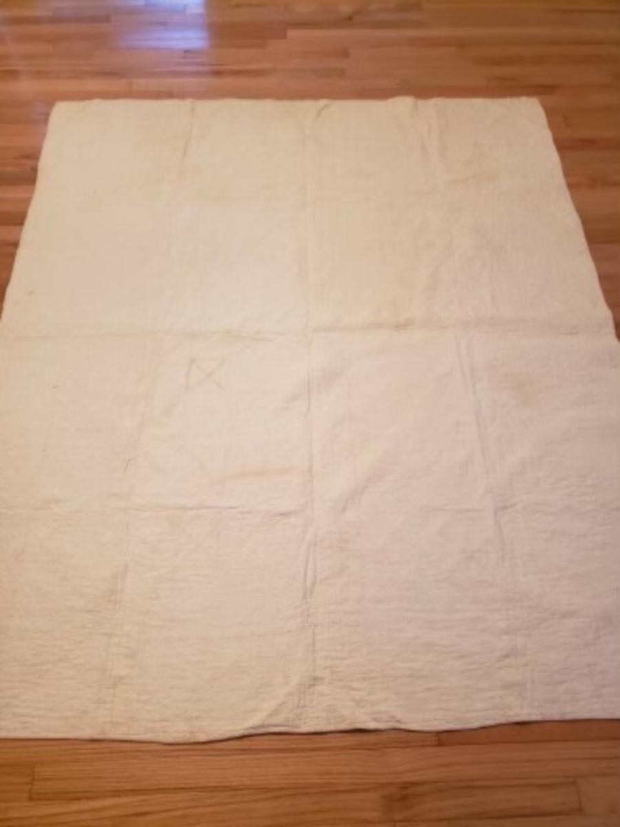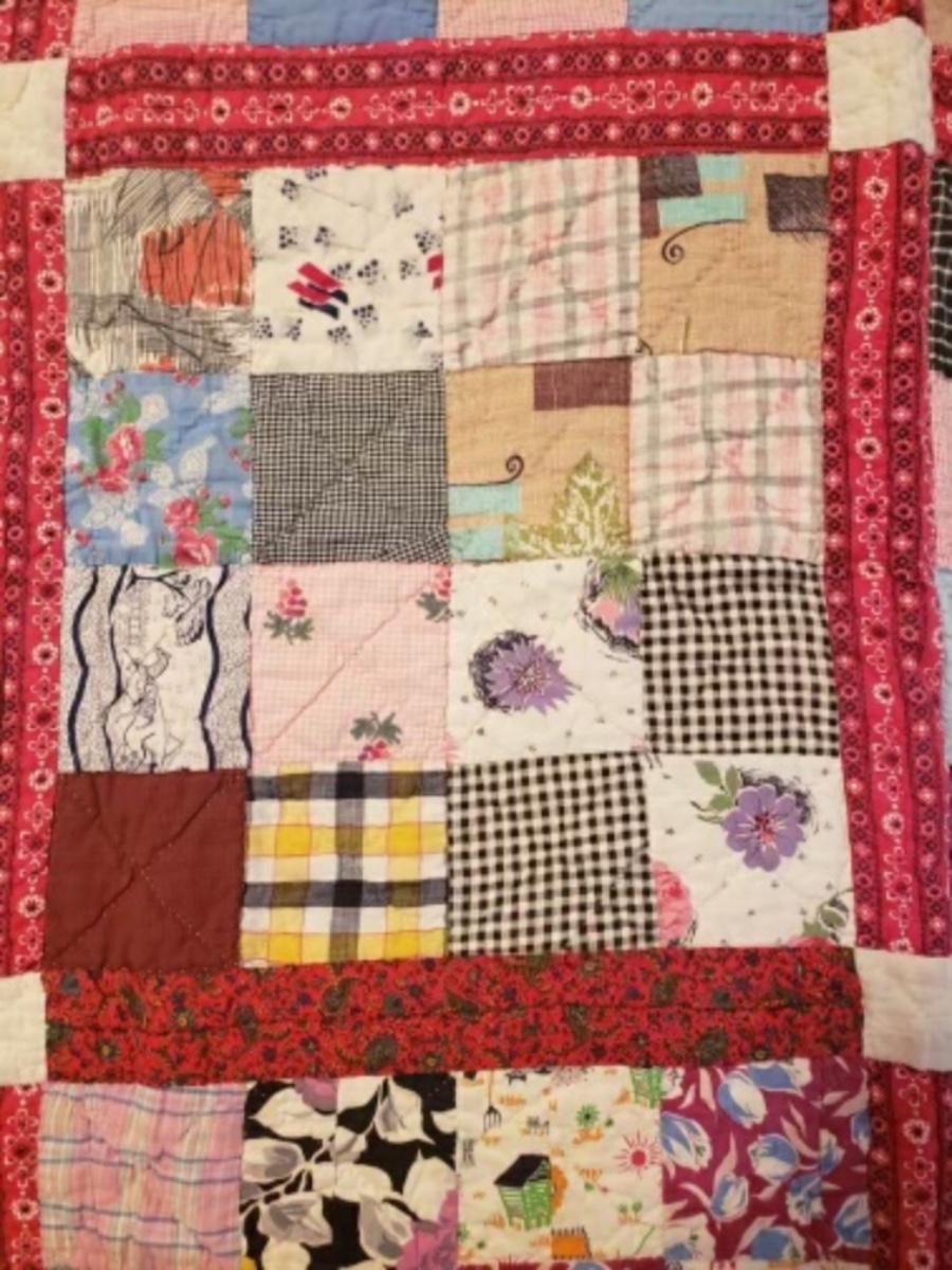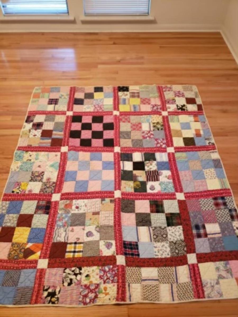 Vintage handmade 16 patch block scrappy quilt. 63 x75