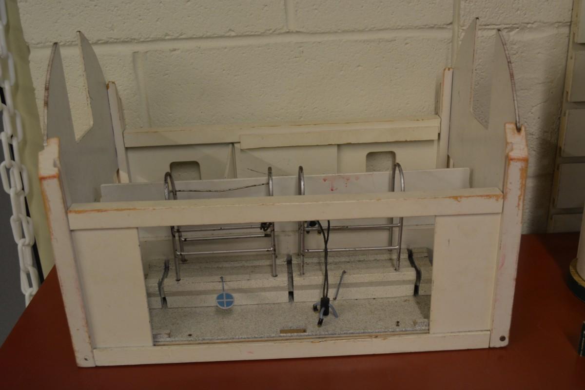 Super cool vintage handmade farm playset and accessories. Many pieces show signs of age and wear. Flaws include paint chipping, scratches, marks, dents, and broken/missing pieces. Comes in a large black custom box with stackable handled shelving units that hold the pieces inside. Does have some extra room inside to add custom pieces. The green flatbed trailers attachment is broken and would need to be repaired. The farmer is sadly missing his head, which is not included in the lot. Both the chick and chicken have posts to hold them into something but I am not sure what. I also included a photo of some miscellaneous pieces that I do believe belong with the barn but am not sure of what they do. Please note there are other signs of wear, peruse all photos closely, and ask any questions you may have prior to bidding. Full storage box measures 27"X20"X13"