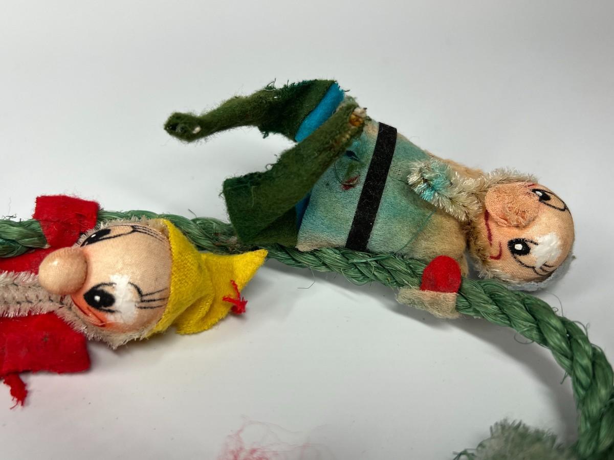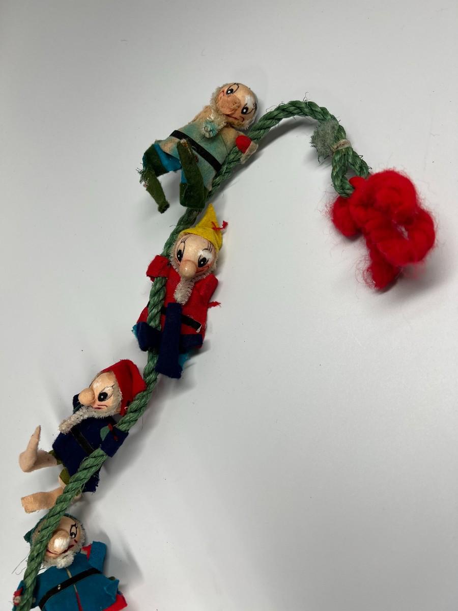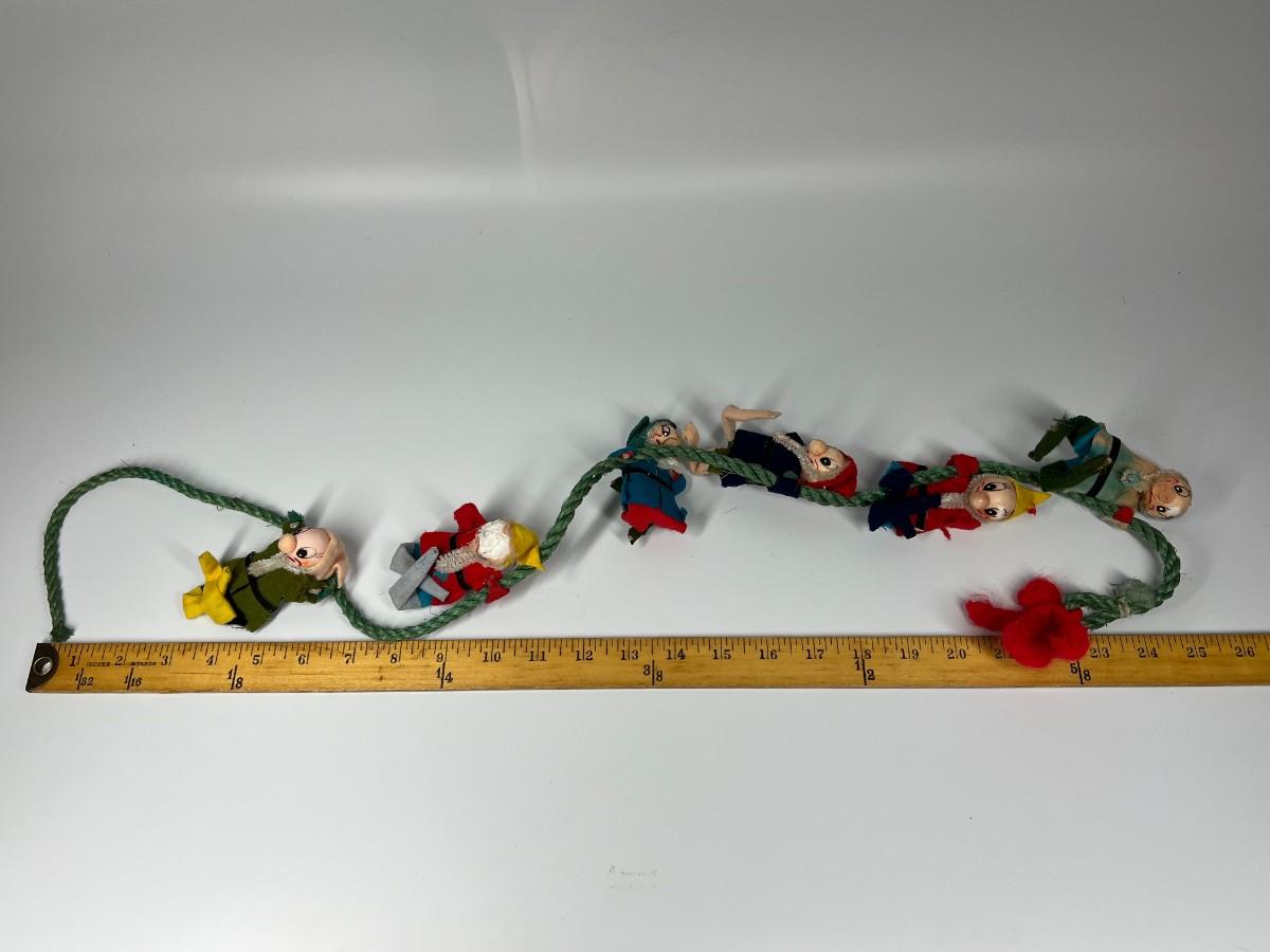 Vintage Handmade Arts & Crafts Story Book Dwarves Hanging Decor, there is some ripping to some dwarf figures that is attached to the nylon rope, check pictures for more details and for sizing.