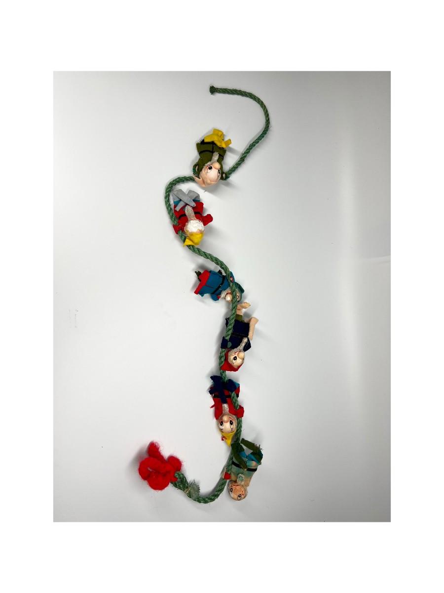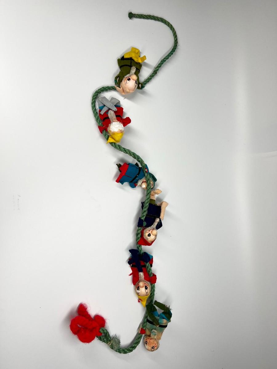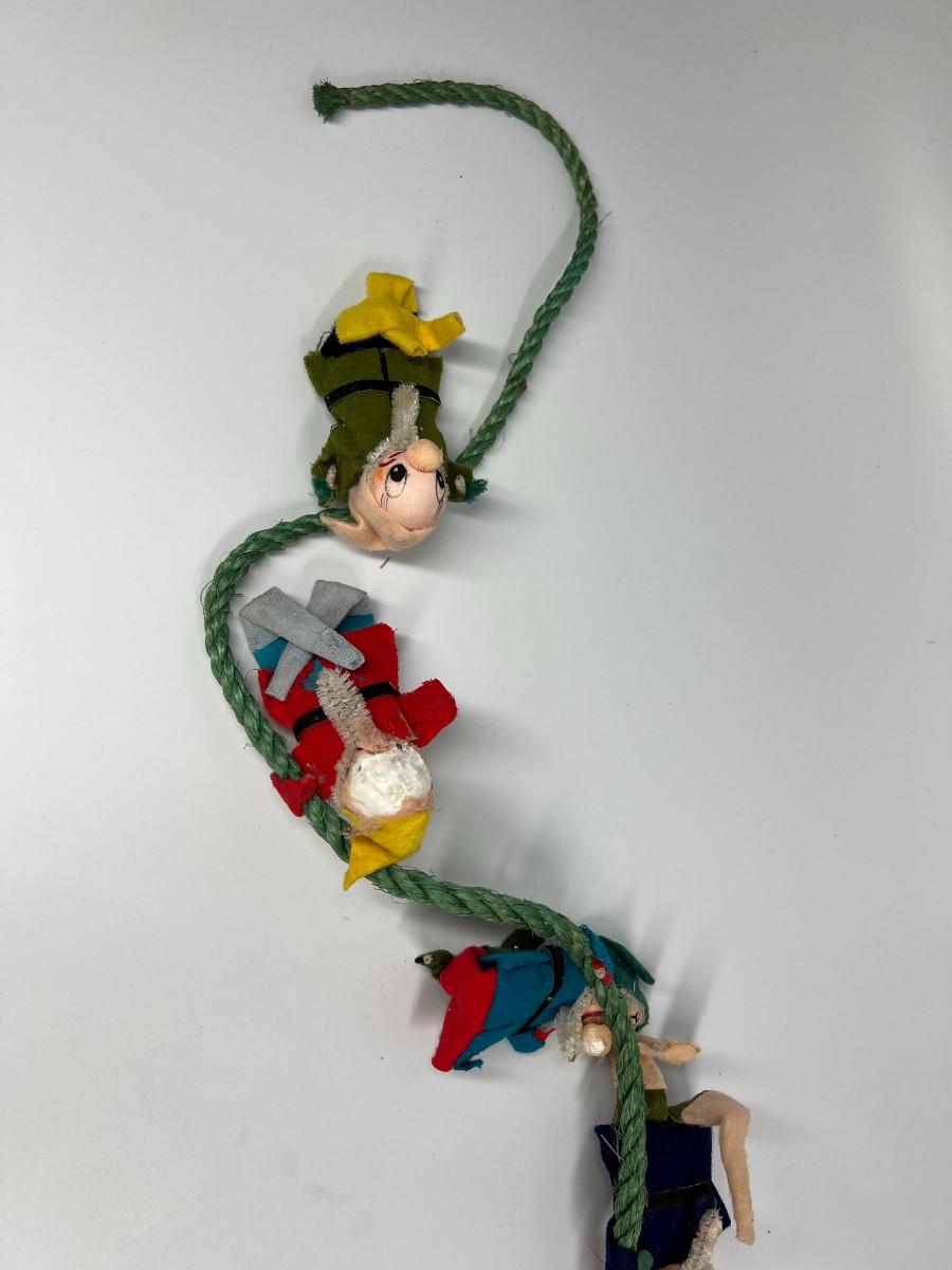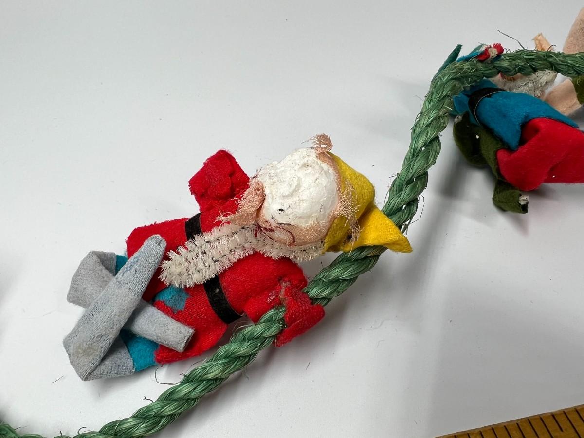 Vintage Handmade Arts & Crafts Story Book Dwarves Hanging Decor, there is some ripping to some dwarf figures that is attached to the nylon rope, check pictures for more details and for sizing.