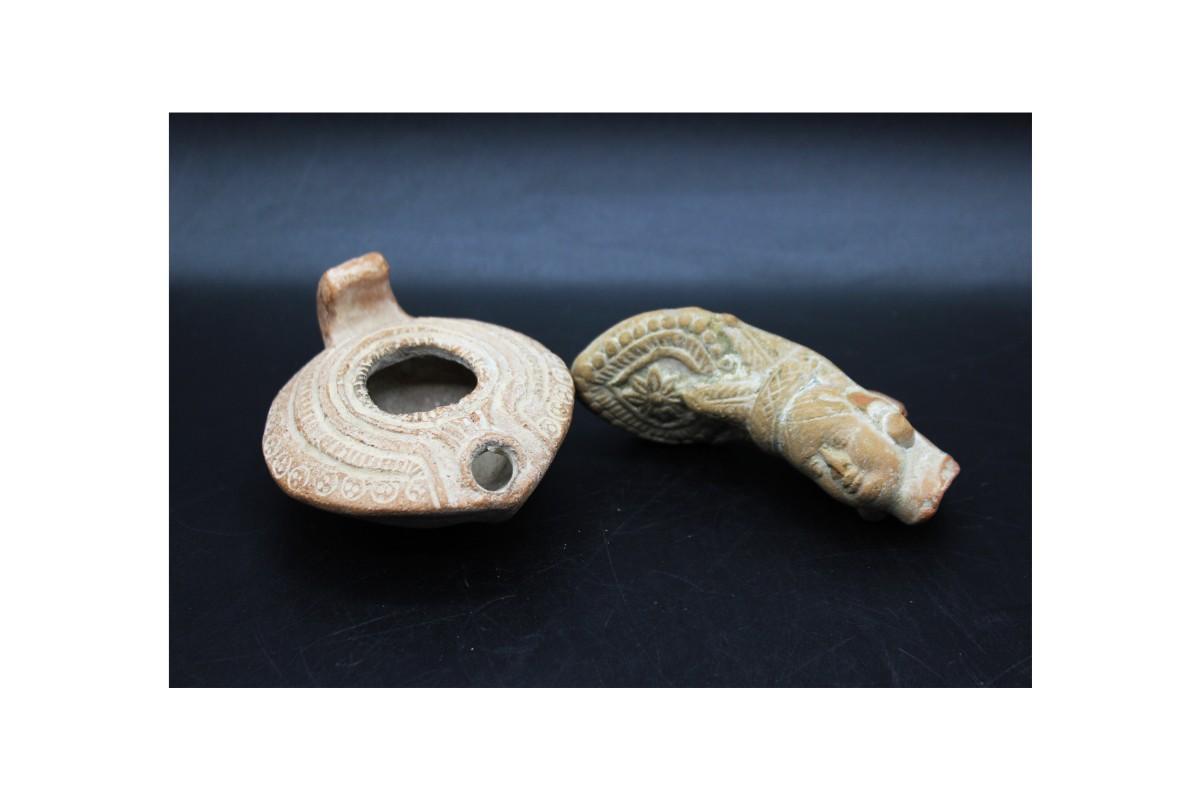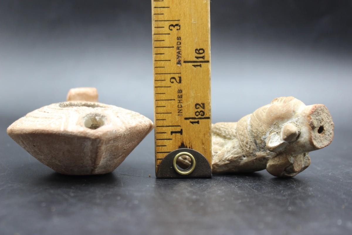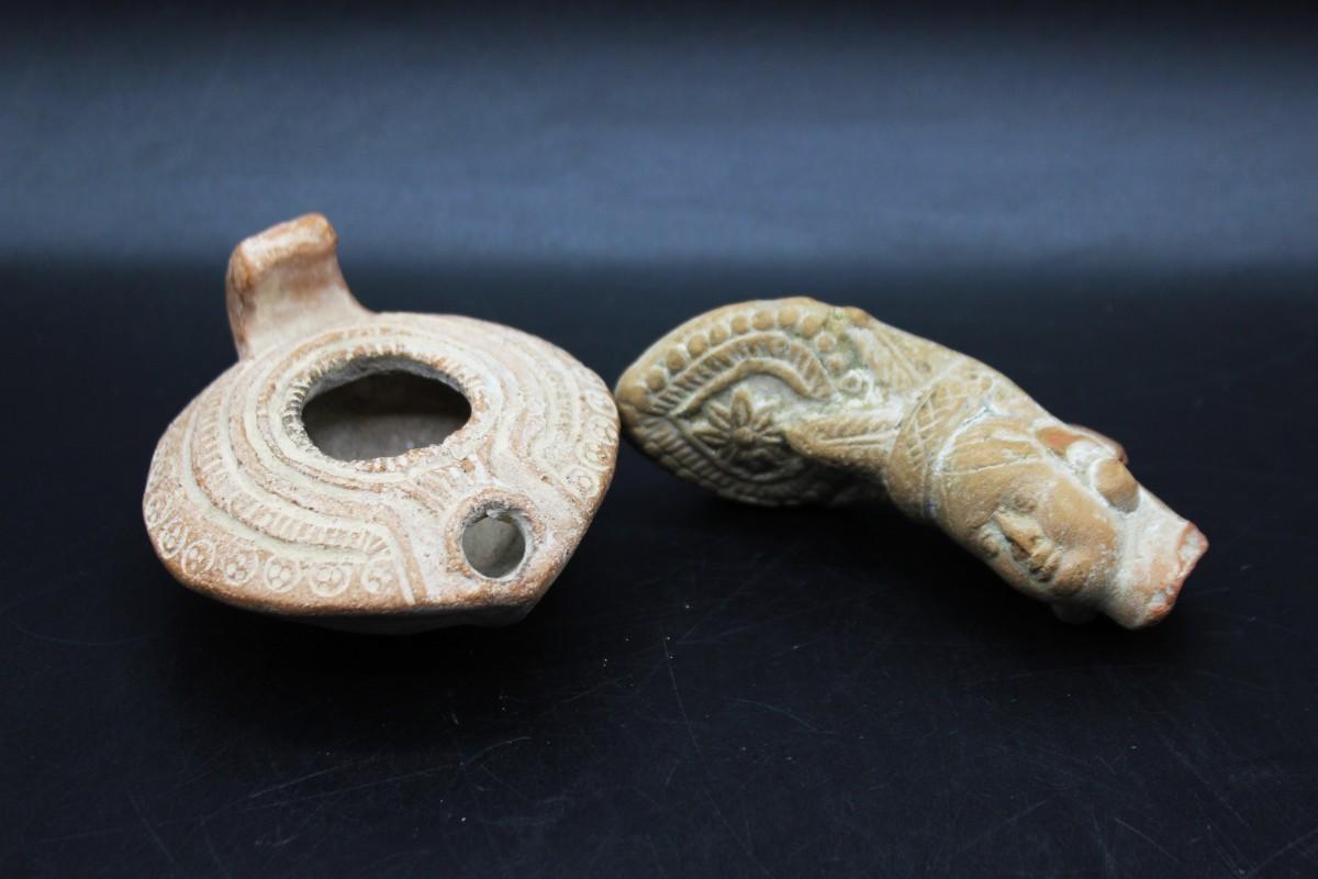 Vintage Handmade Carved Clay Herodian Oil Lamp & Head Artifacts