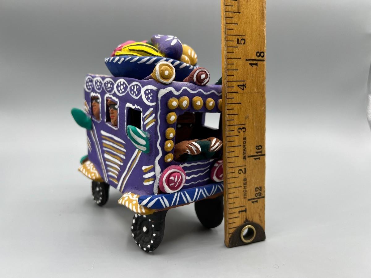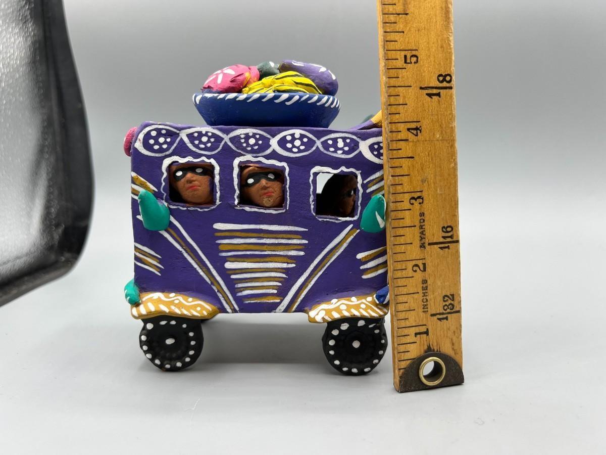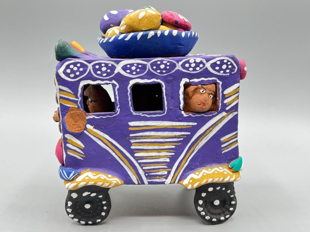 Vintage Handmade Mexican Michoacán Colorful Ceramic Traveling Camion Bus with Passengers Folk Art, one of the mirrors has been broken off, there is no other significant damage to the piece and is in good vintage and displayable condition. Check pictures for more details and for sizing.