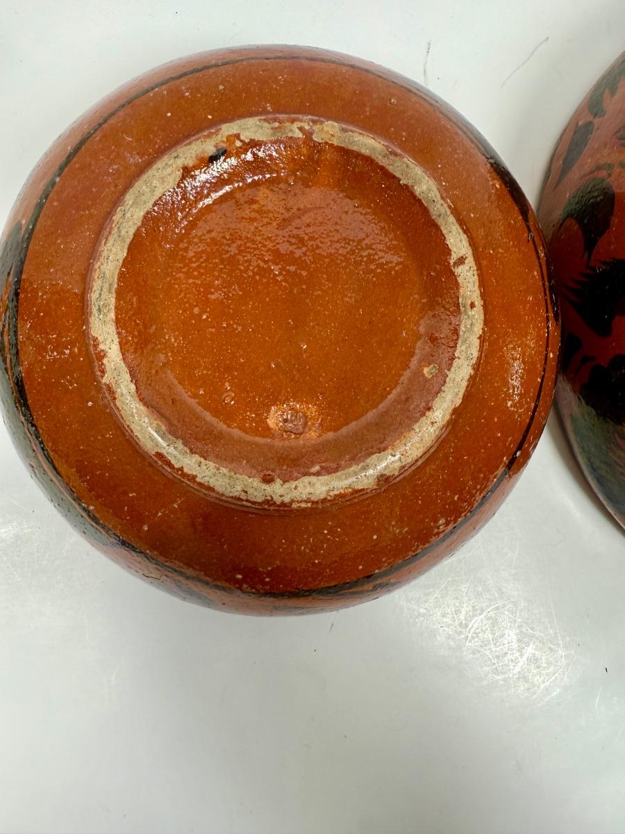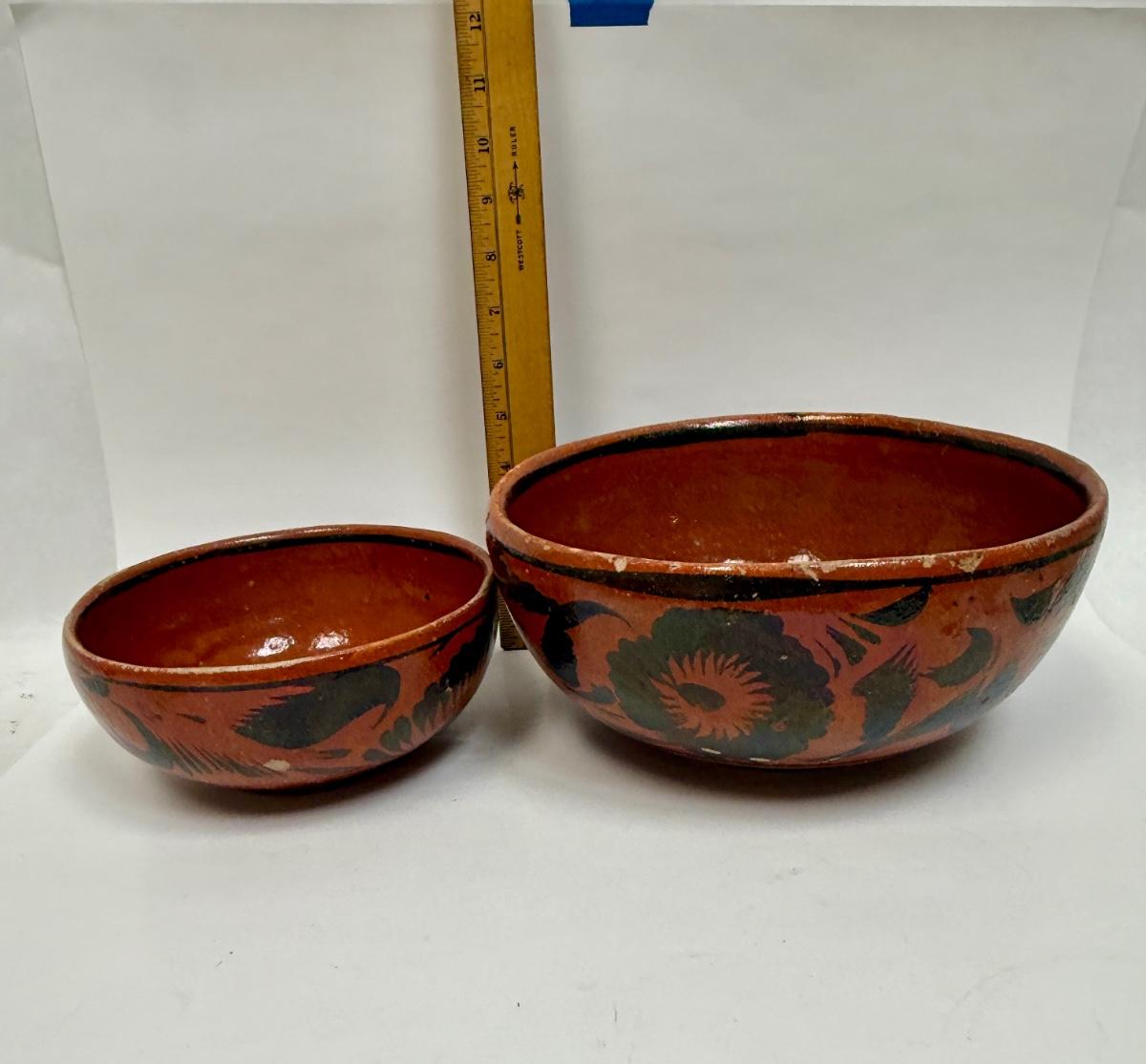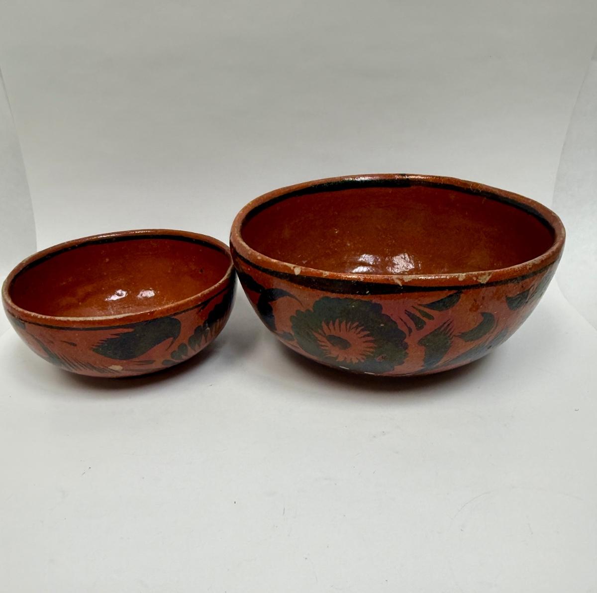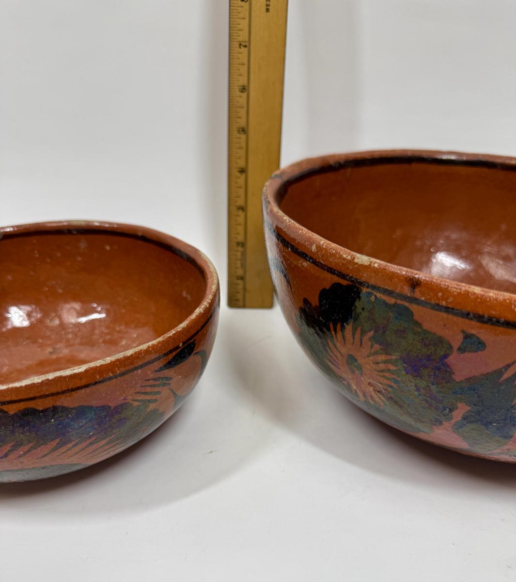 Vintage Handmade Mexican Redware Clay Pottery Serving Bowl Set of 2 Hand Painted