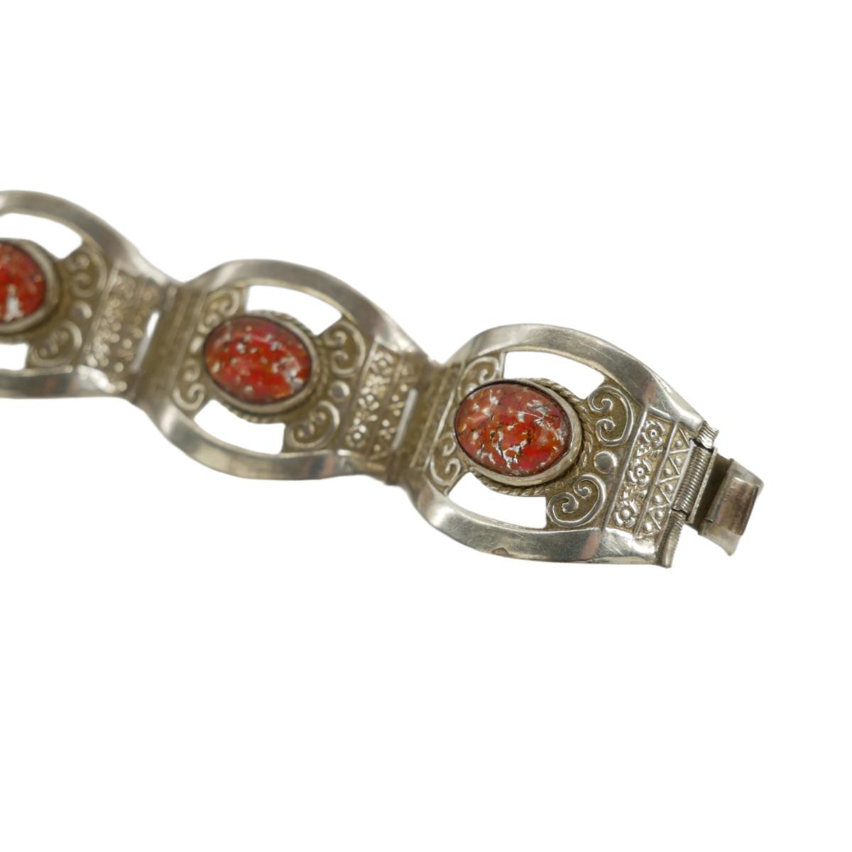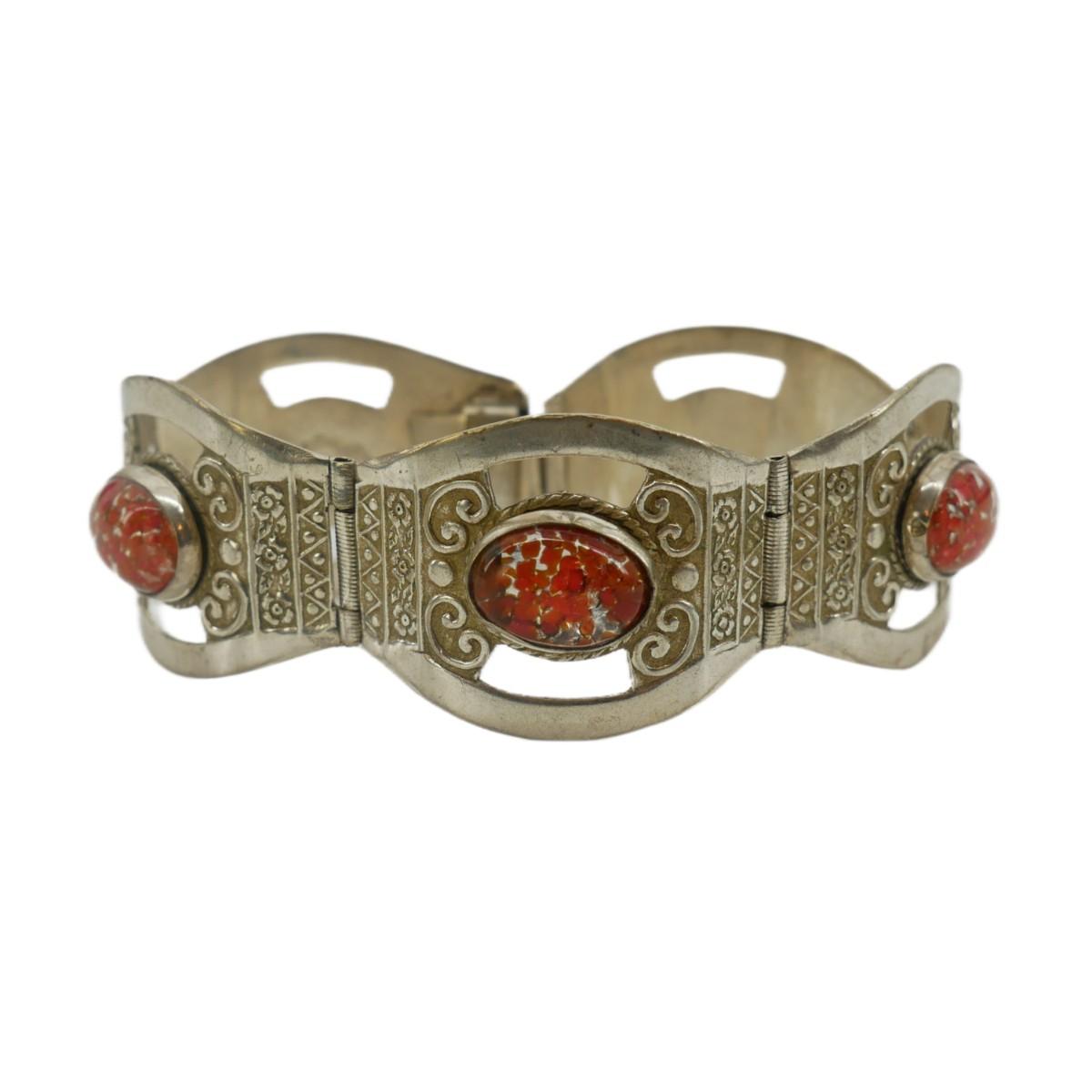 Gorgeous vintage handmade silver hinged multi-panel cuff bracelet with orange and ornate design. Stamped "Hecho en Mexico". Measures approximately 6.5" in length and 1" in height. Weighs 35g total.