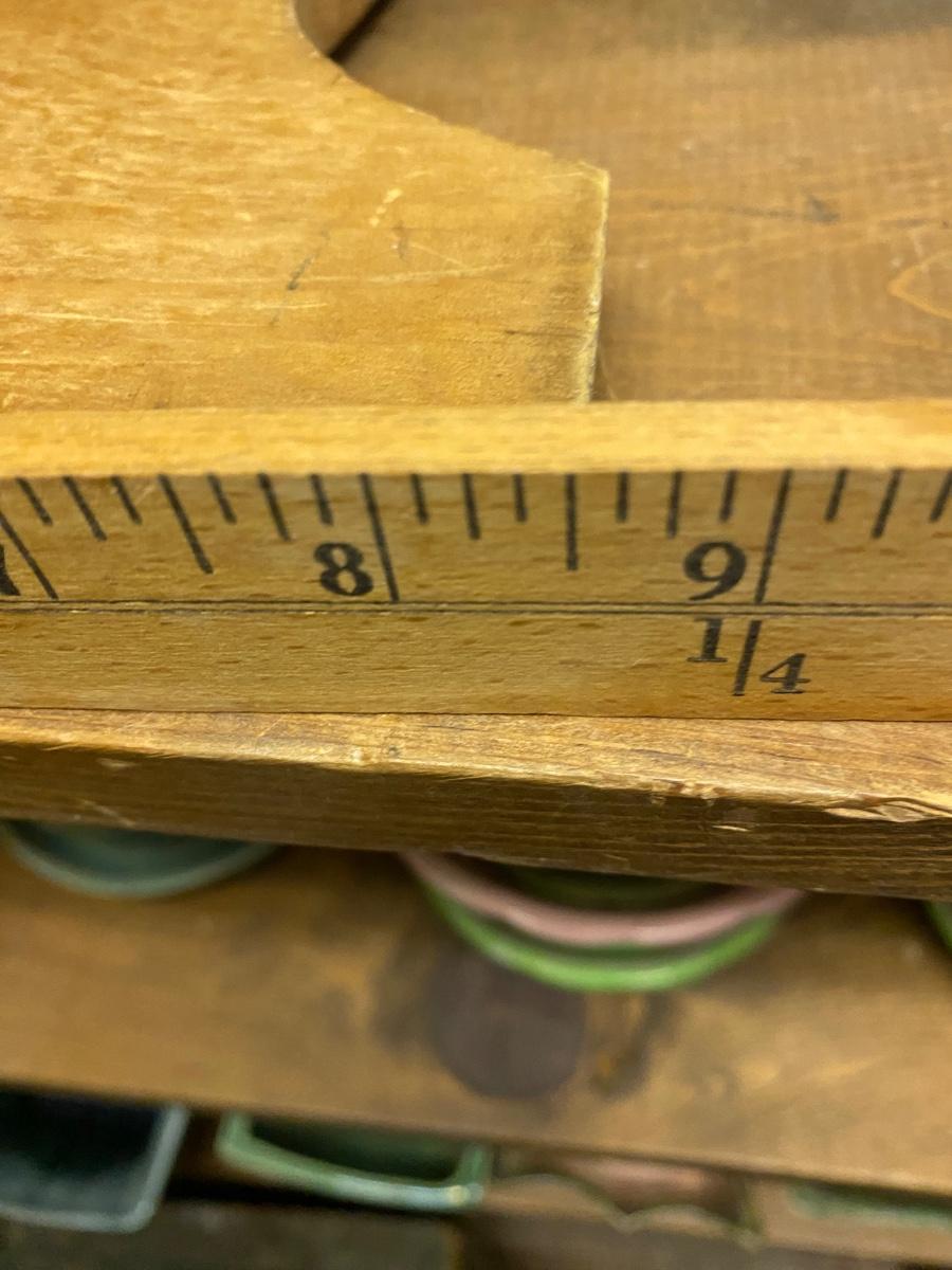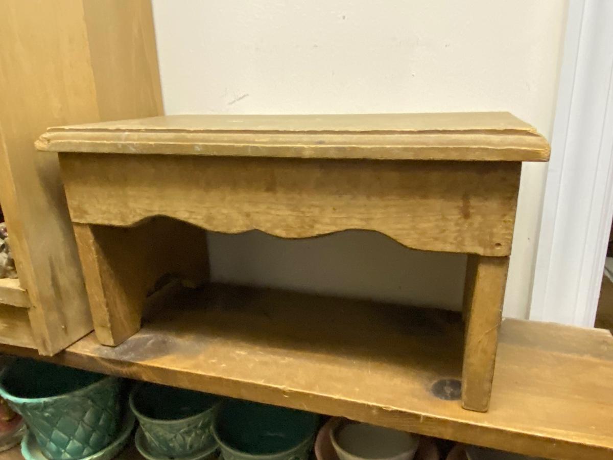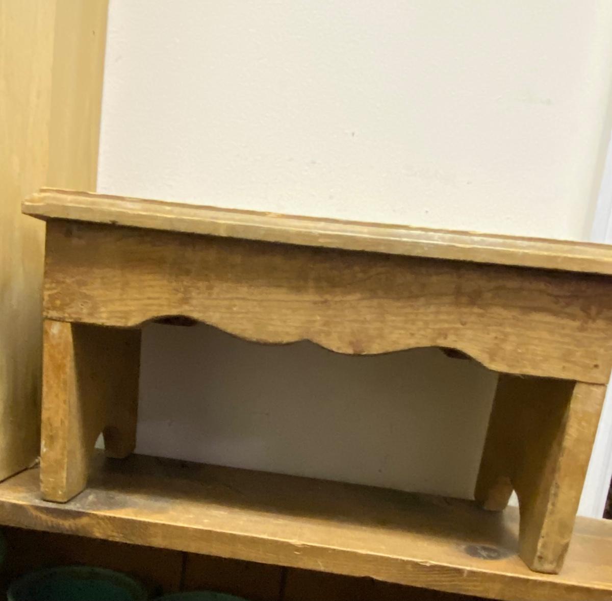 This is a classic pine wood stool or small bench. Beveled edging. Old fashioned construction. Small chip on one corner.