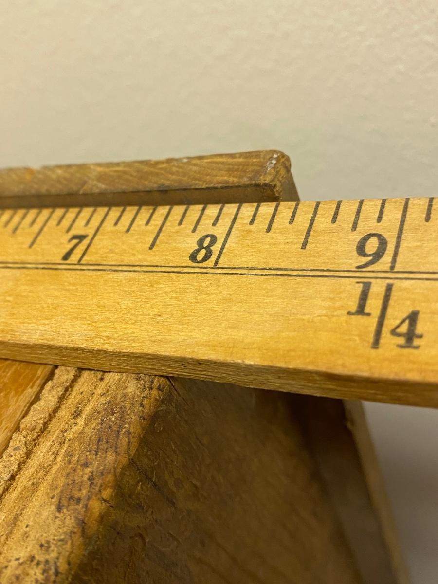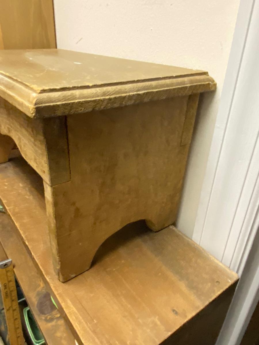 This is a classic pine wood stool or small bench. Beveled edging. Old fashioned construction. Small chip on one corner.