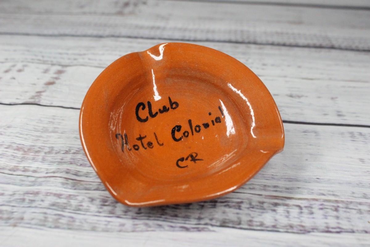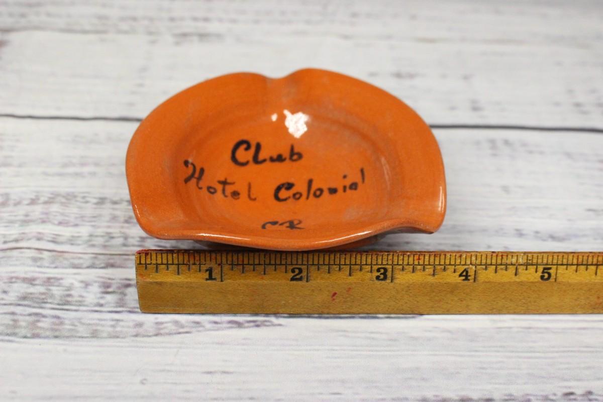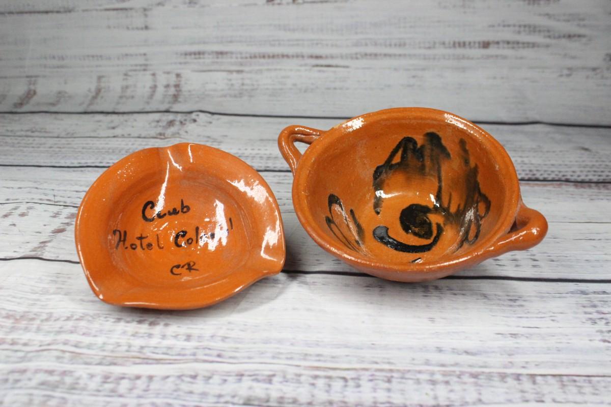 Vintage handmade pottery cup and dish, there is no significant chips or scratches to the pieces. The cup measures to about 5" and the dish is 3.5." The dish reads "Club Hotel Colonial CR" which is located in Costa Rica.