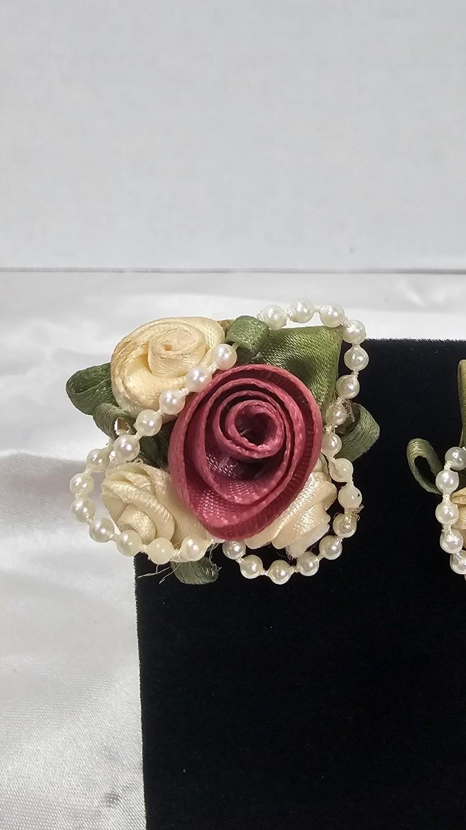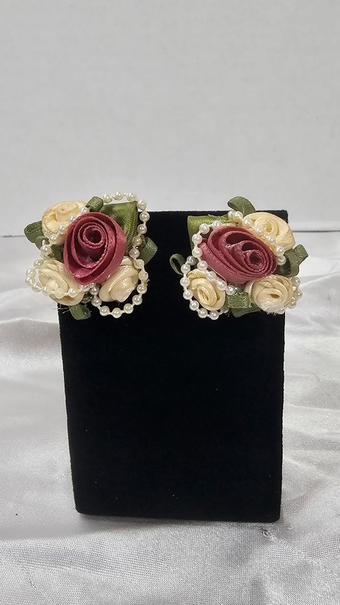 These earrings are best suited for special occasions, garden events, bridal or vintage-inspired styling, or collectors who appreciate handcrafted costume jewelry with textile elements. Subtle variations in ribbon shaping and pearl placement are consistent with handmade production and enhance their unique character.