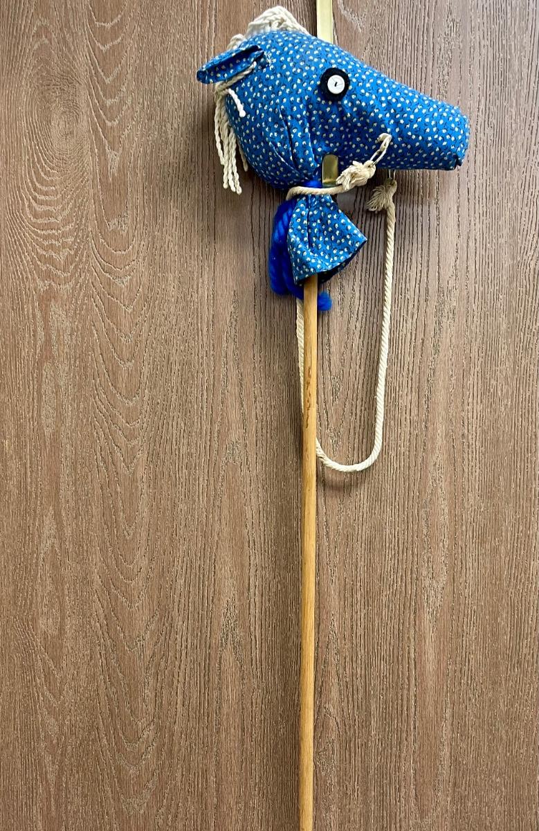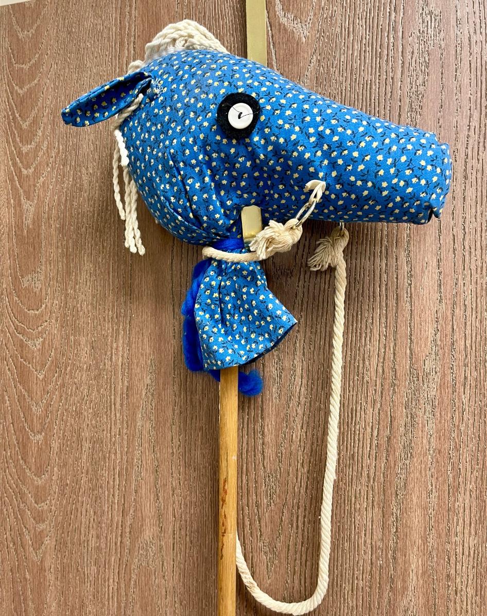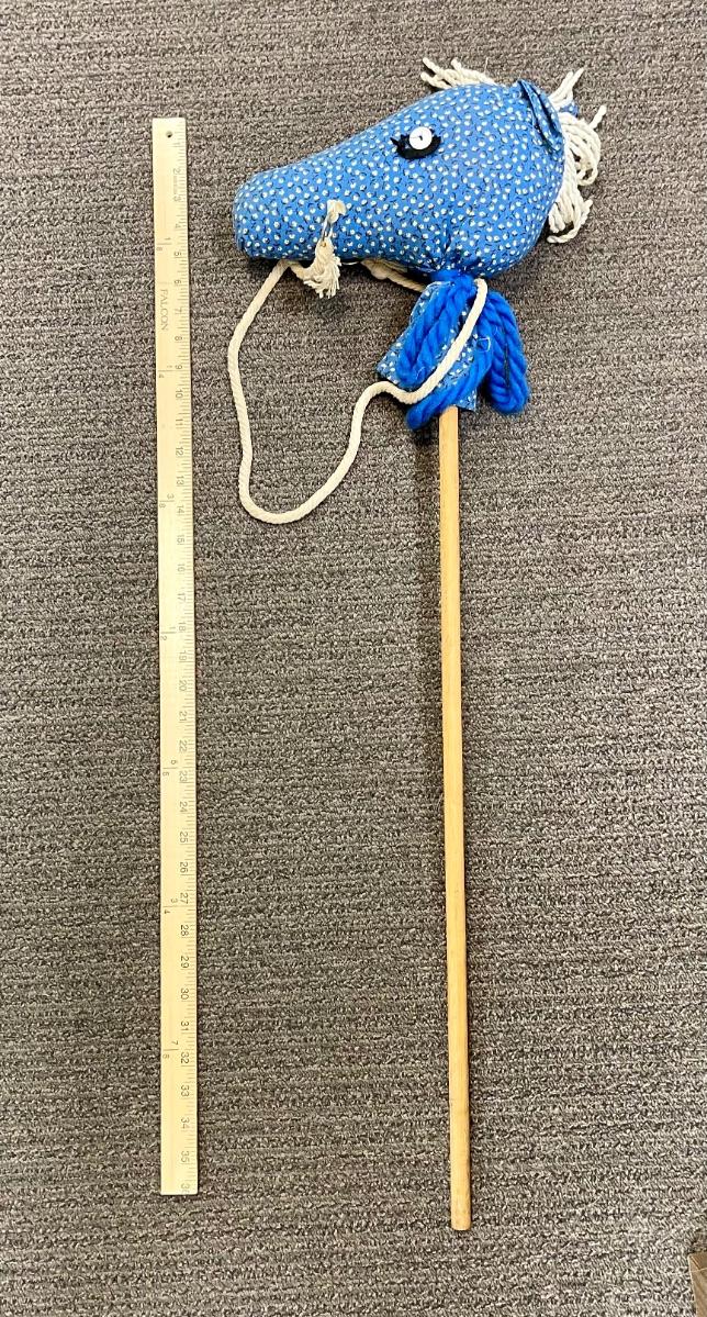 Blue fabric with polka dots. White rope bridle. Approx. 36" long. In good condition