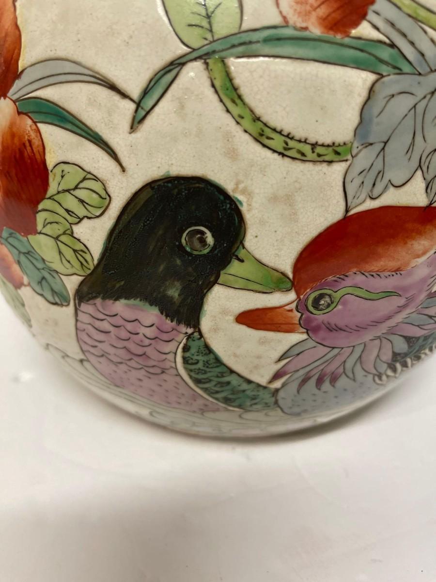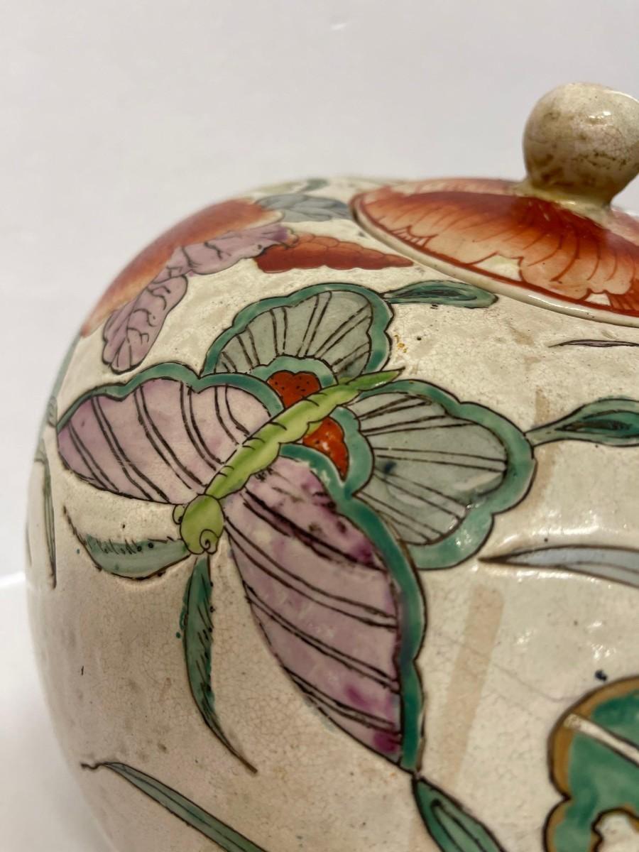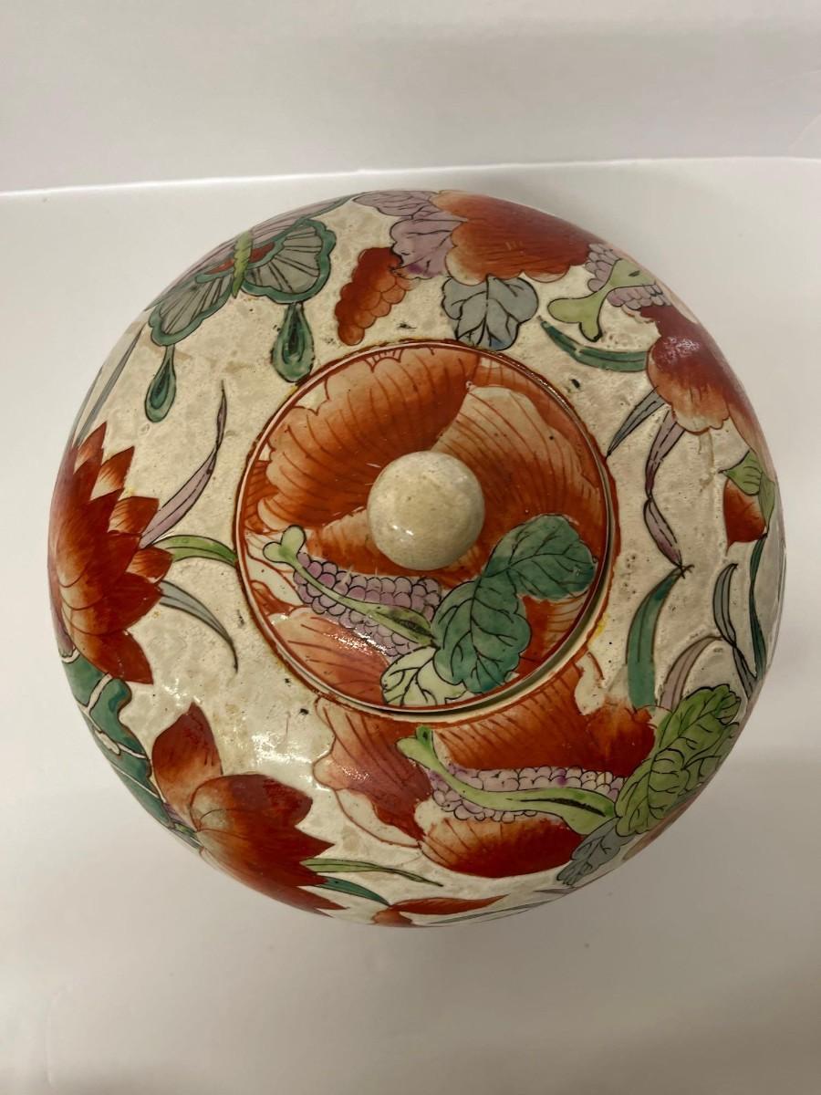 <p>Vintage hand painted Chinese jar with lid very good condition showing minor signs of where consistent with age and use. 10 inches to the top of the finial.</p>