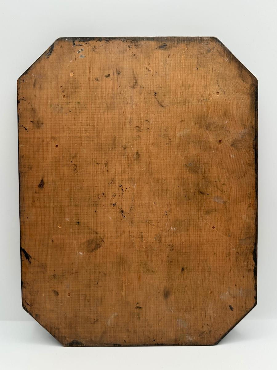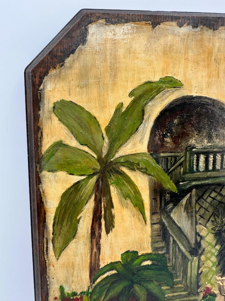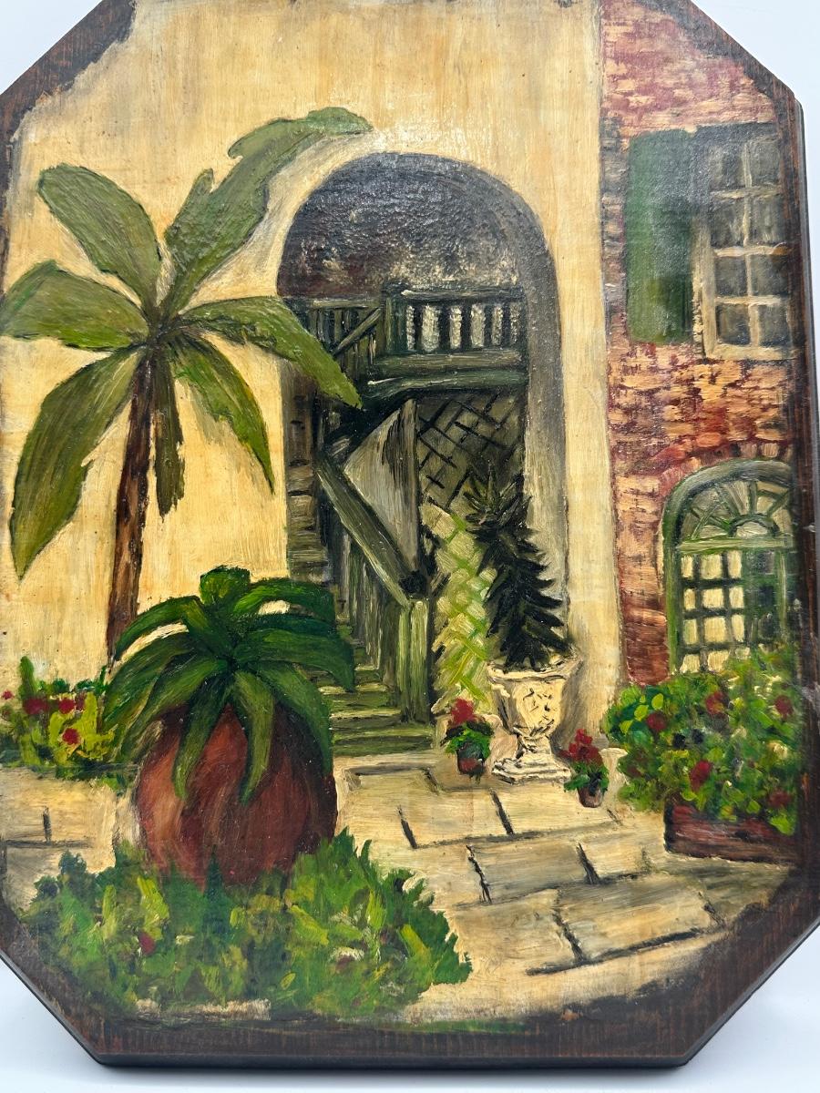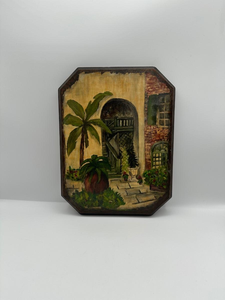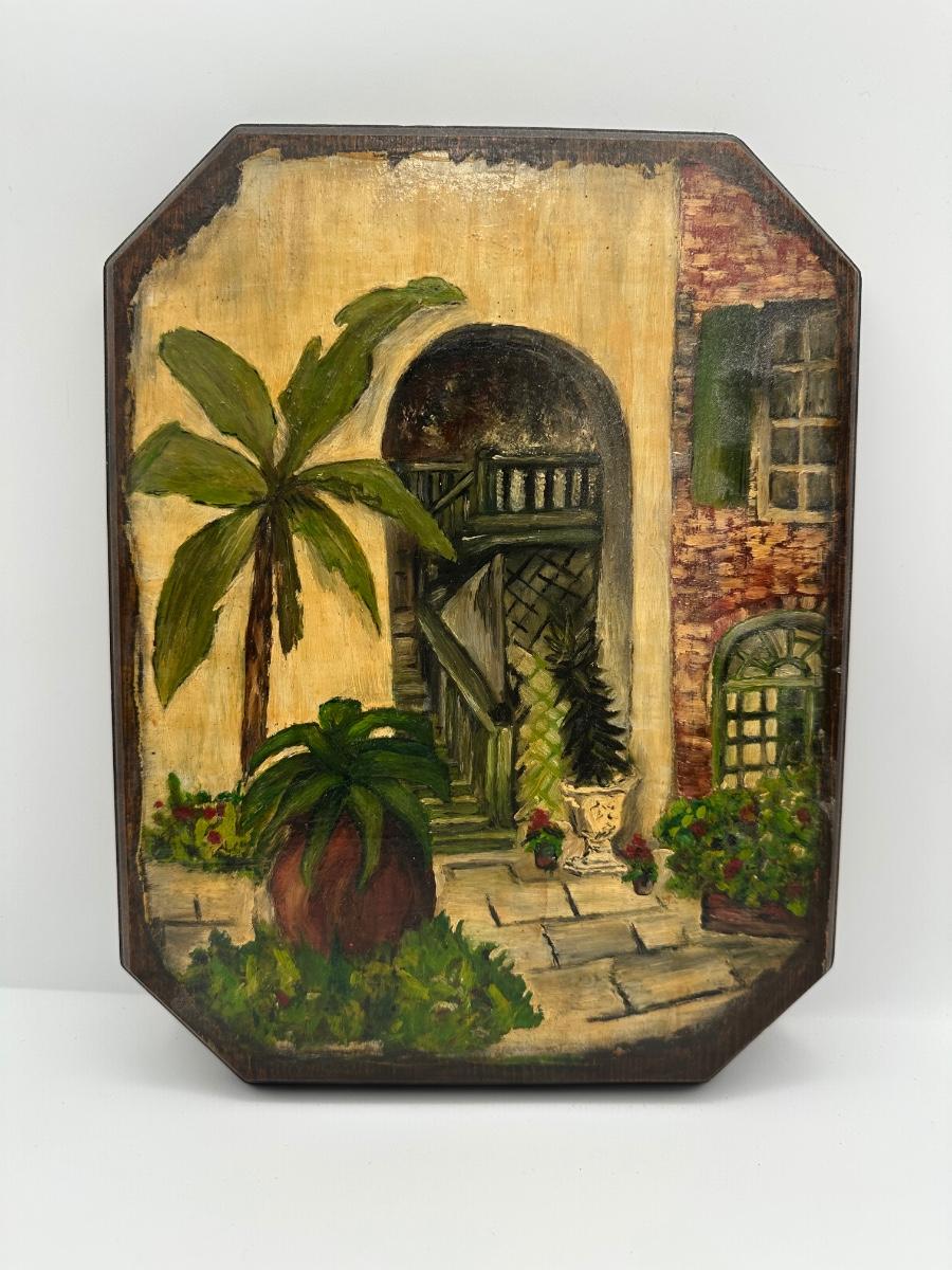 Vintage Hand-Painted Courtyard Scene on Wood Wall Plaque