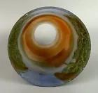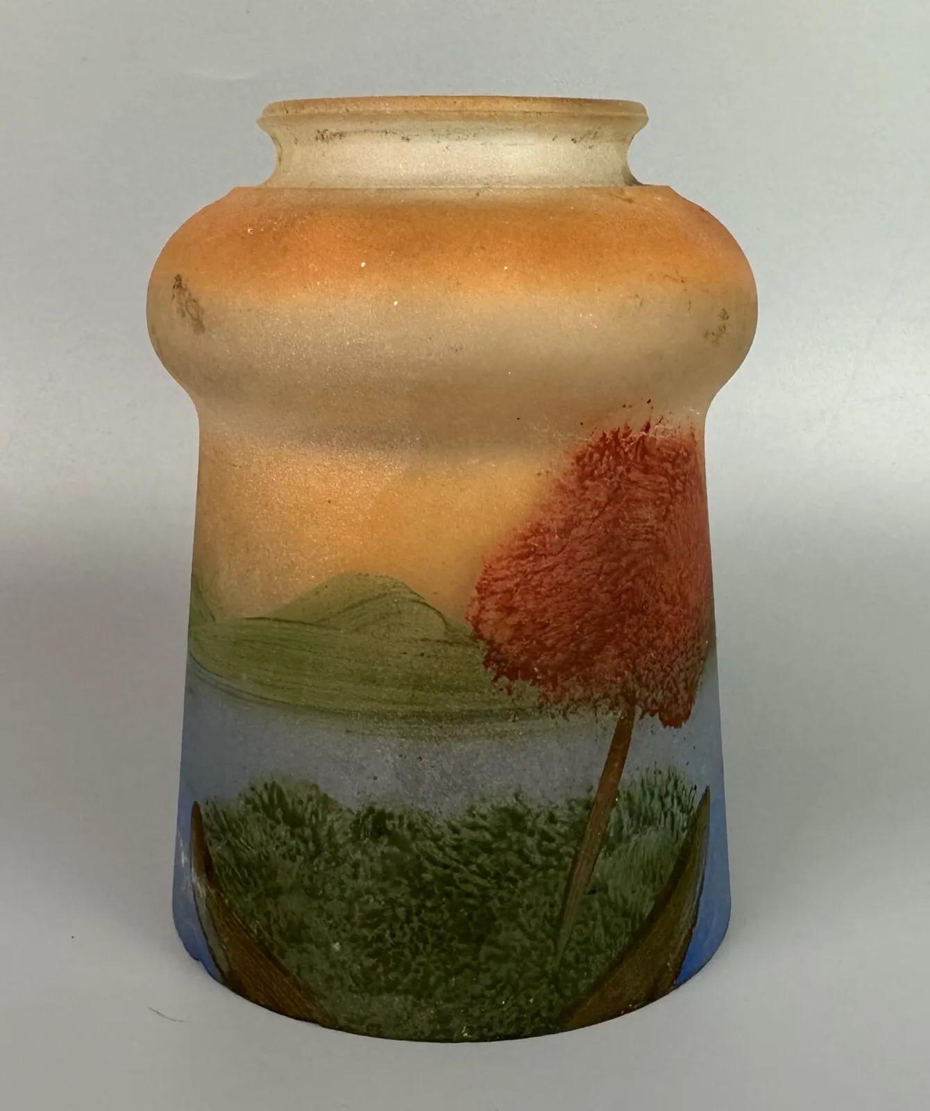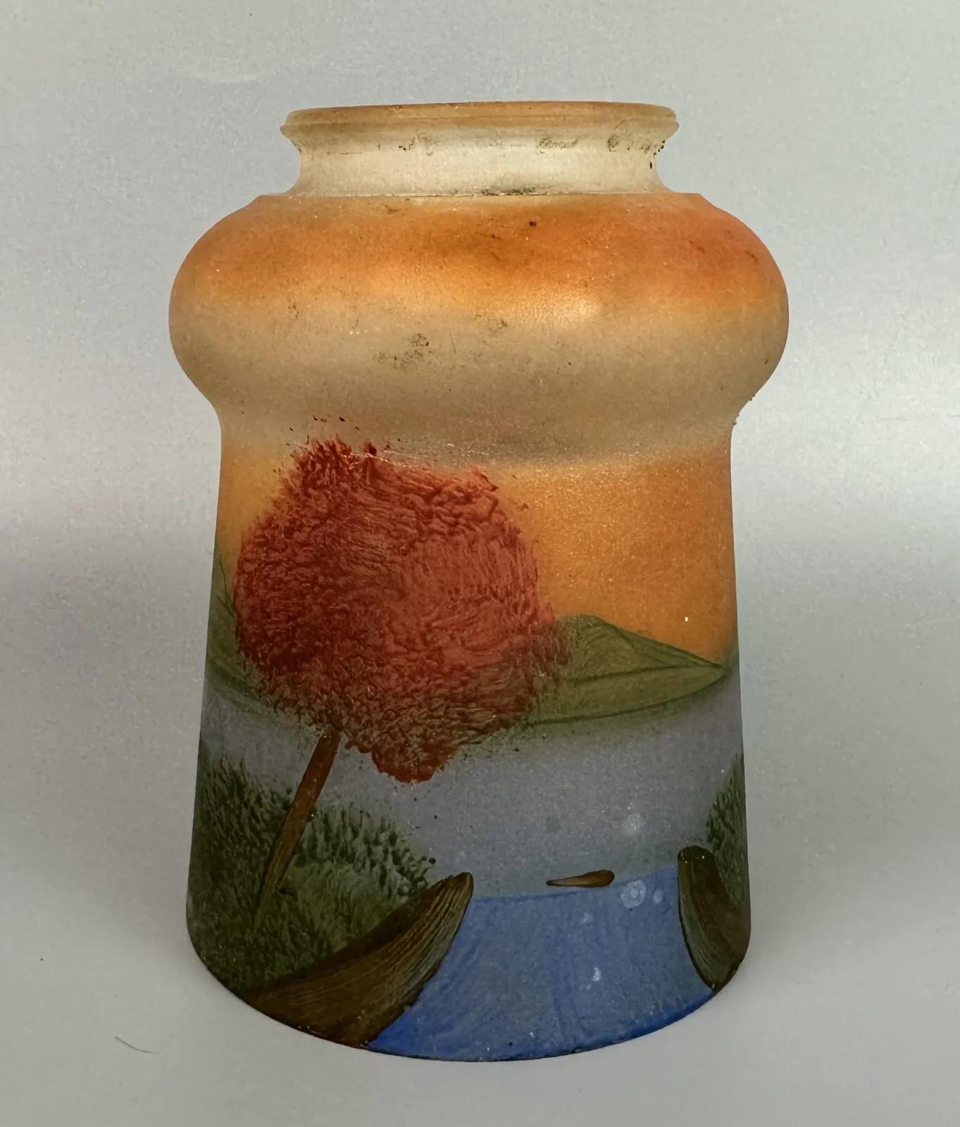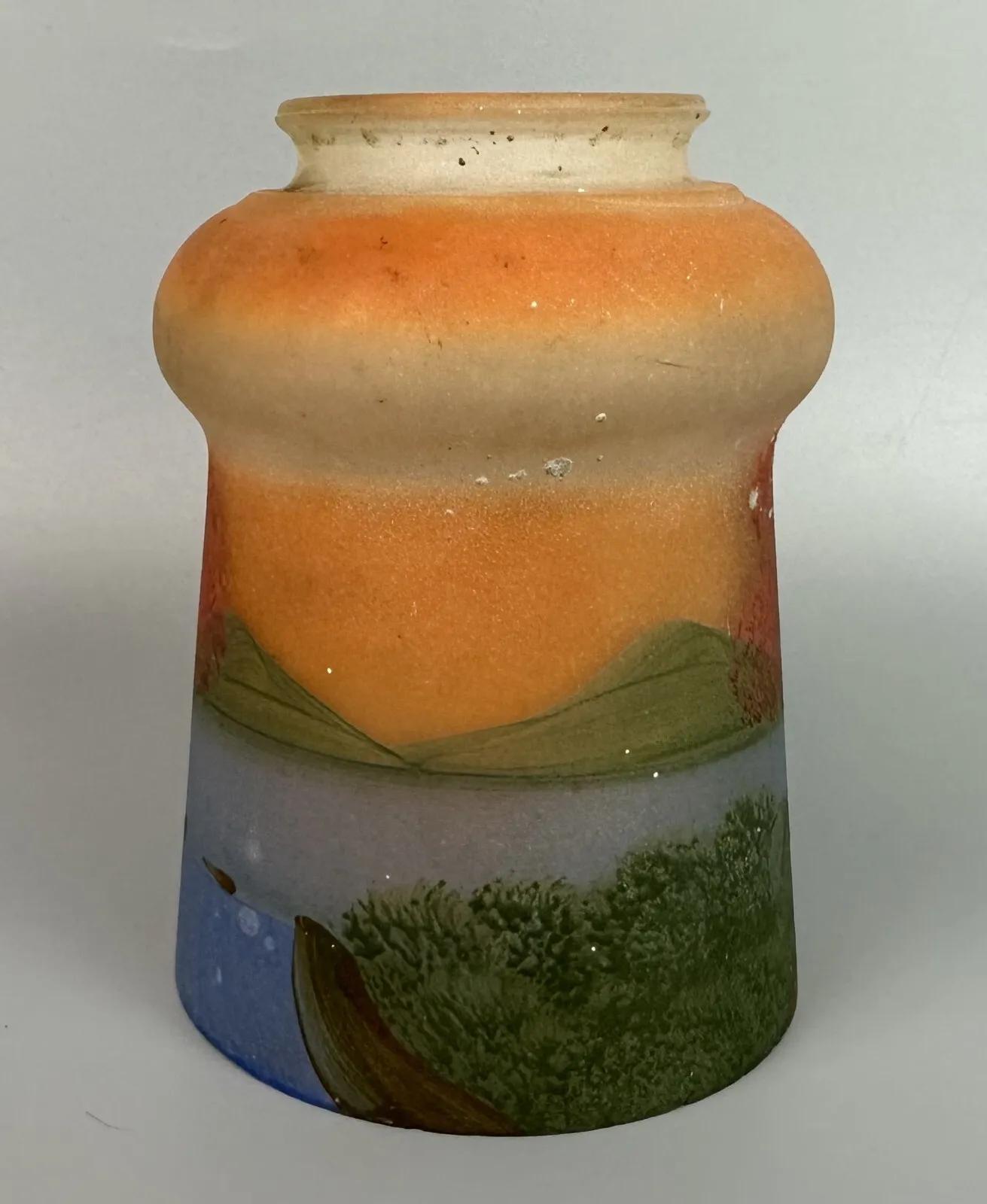 Here is a vintage handpainted glass lamp shade circa 1920s...Light age and use wear..slight soiling...as shown..Dimensions: 2.25" top fitter..3.75" bottom rim..5" tall...Unknown artist on this estate find.