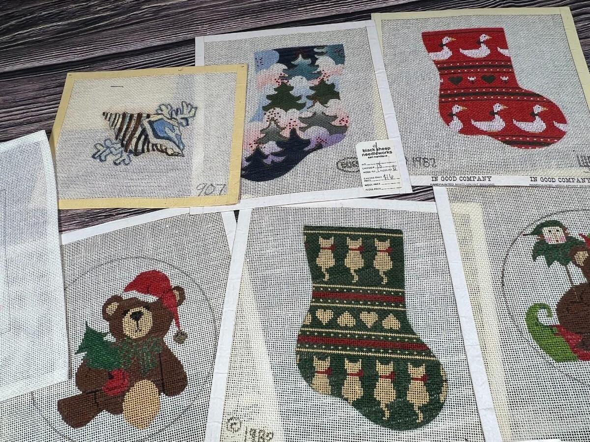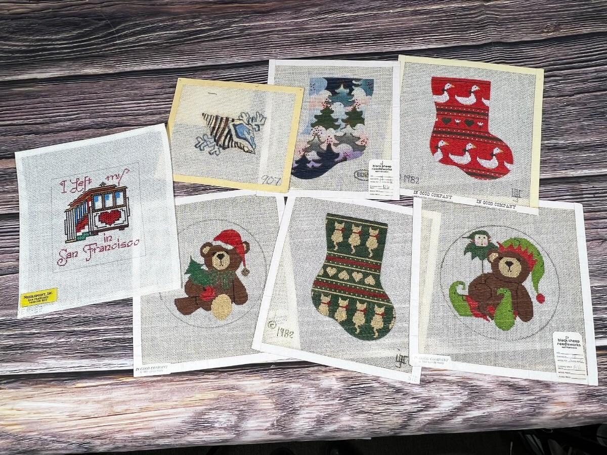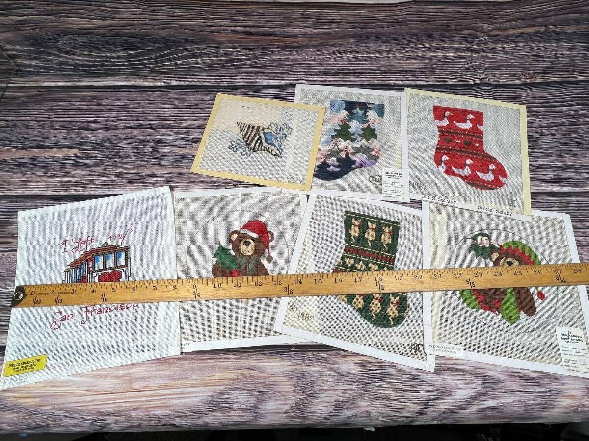 Vintage Handpainted Needlepoint Designs San Francisco Trolley, Christmas Stockings, Nautical Shells, & More, there is no significant damage to the needle point canvases and is in good useable condition. Check pictures for more details and for sizing.