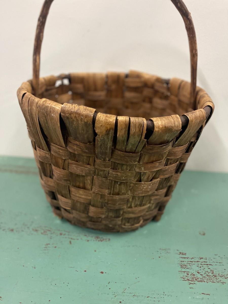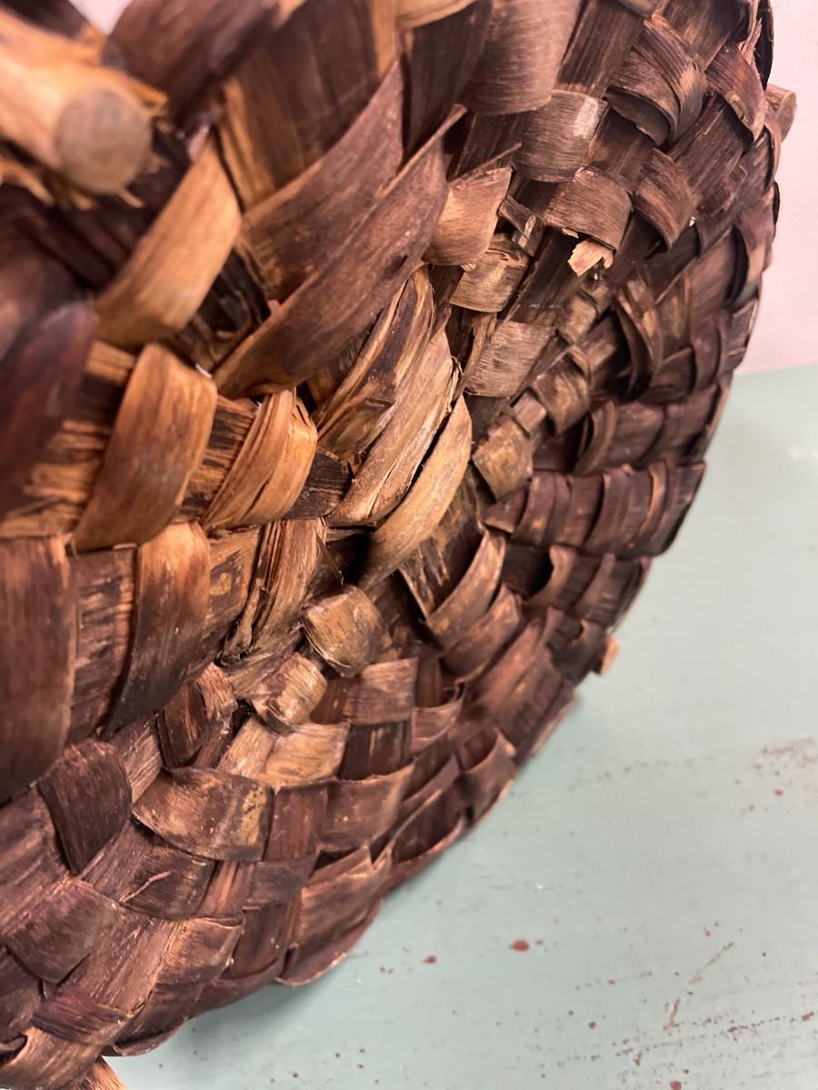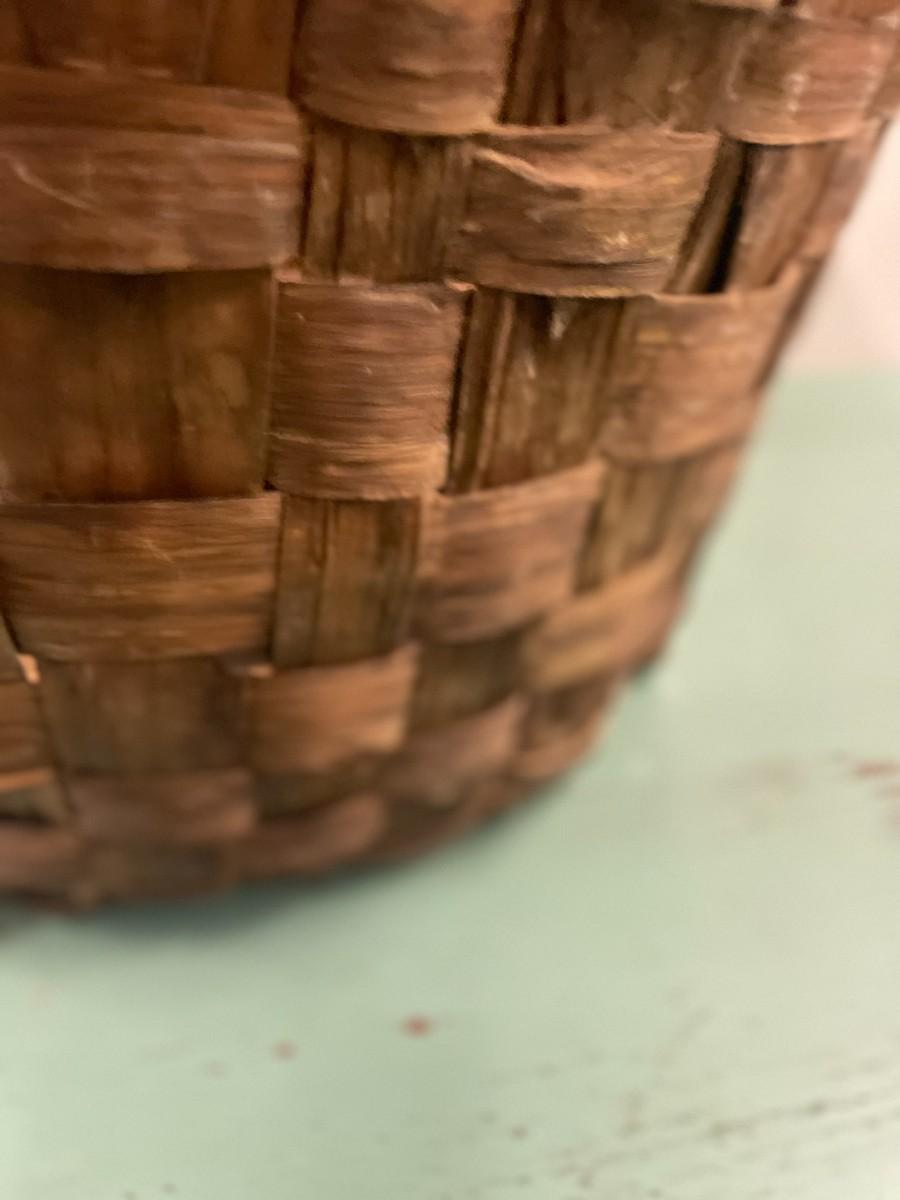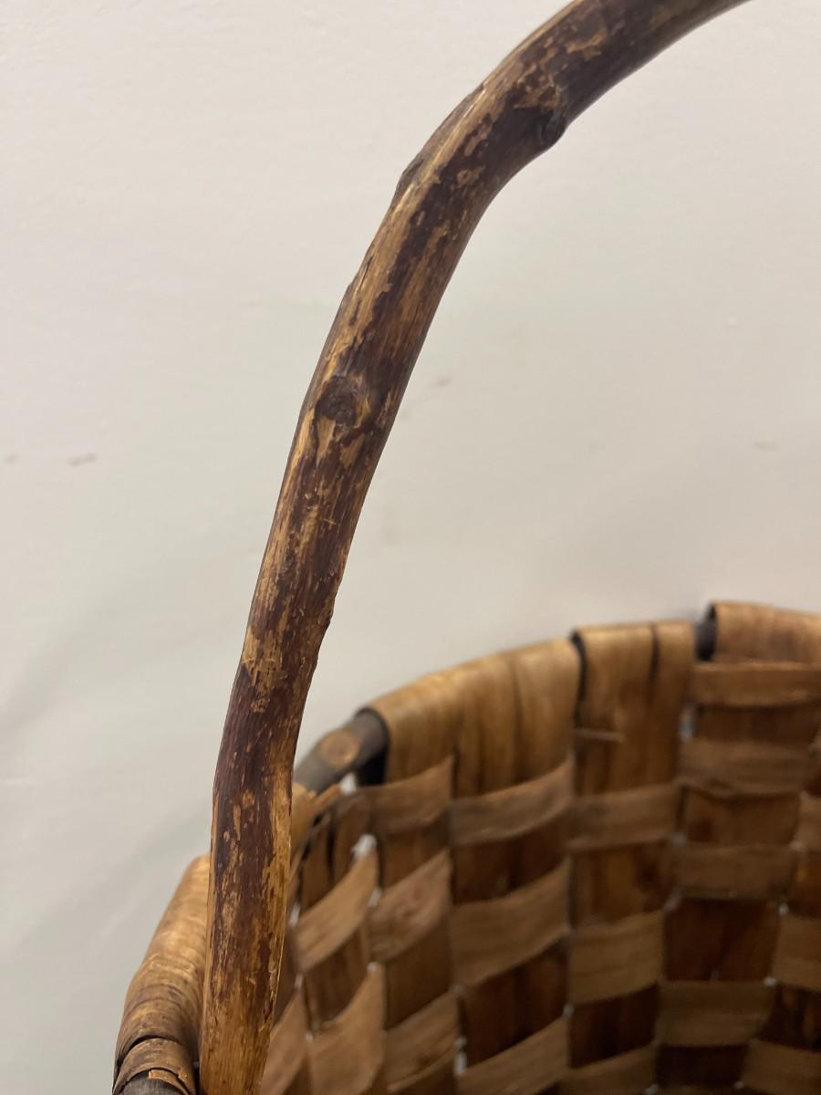 Vintage handwoven basket with handle. Shows some wear and has some breakage here and there. Measures approximately 17" x 21". # 911