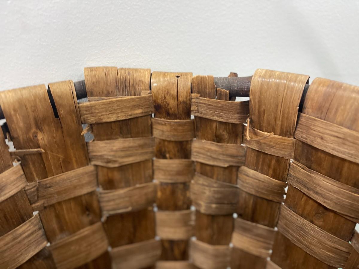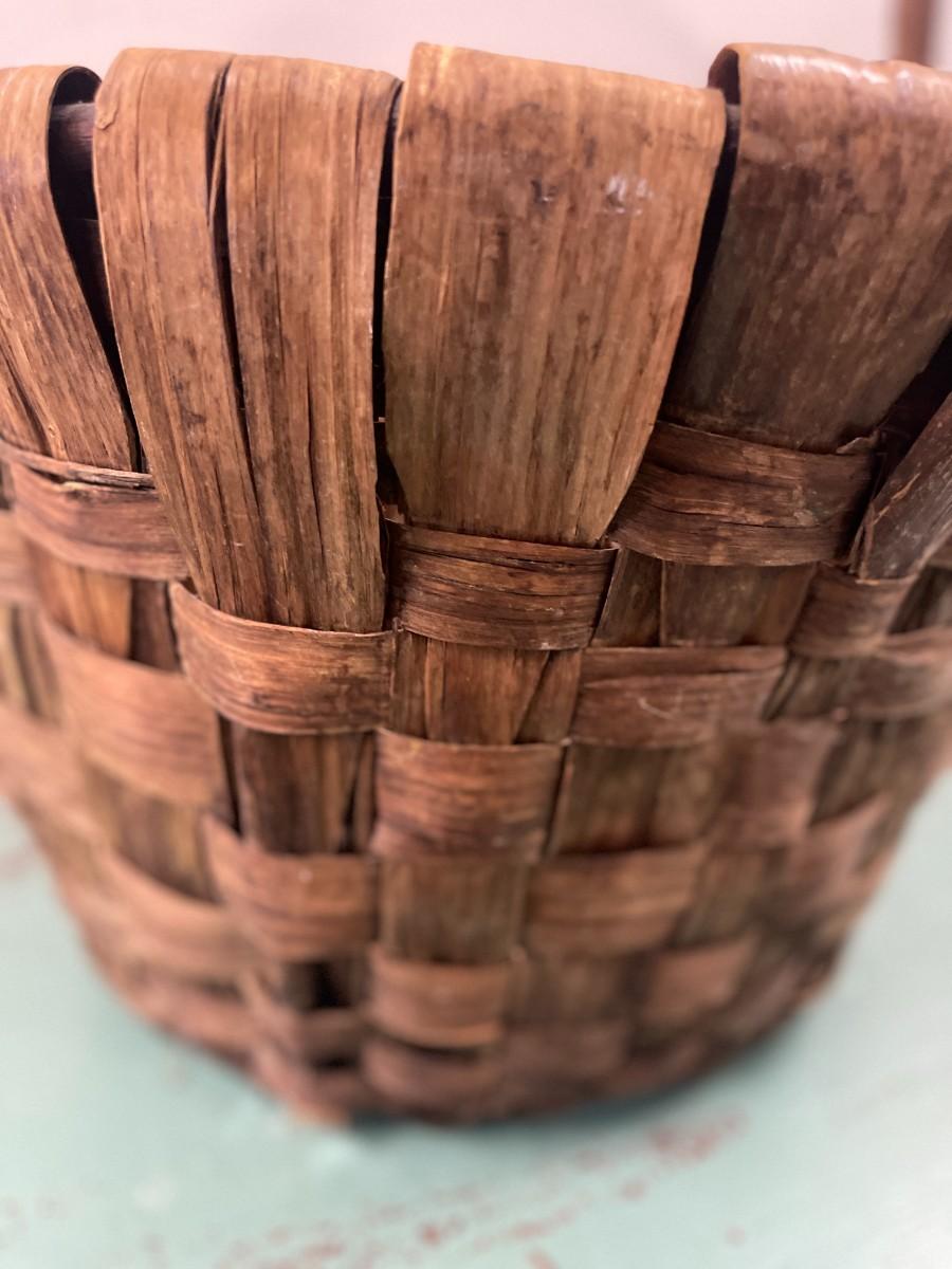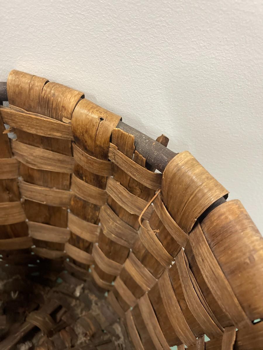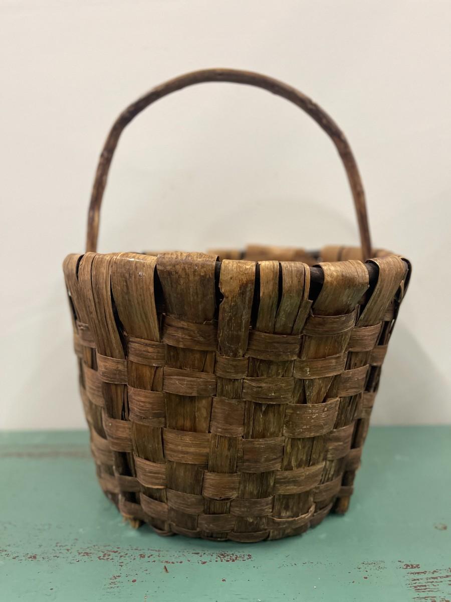 Vintage handwoven basket with handle. Shows some wear and has some breakage here and there. Measures approximately 17" x 21". # 911