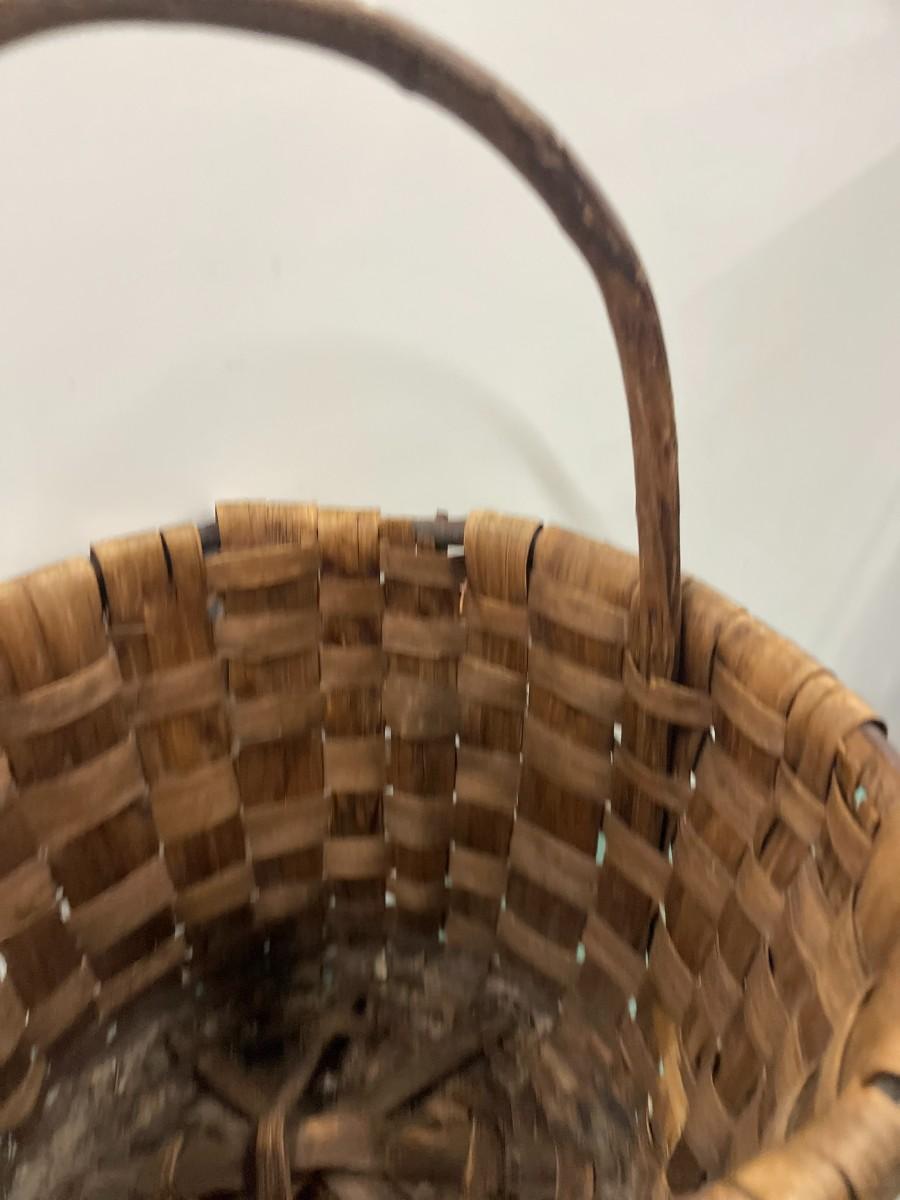 Vintage handwoven basket with handle. Shows some wear and has some breakage here and there. Measures approximately 17" x 21". # 911