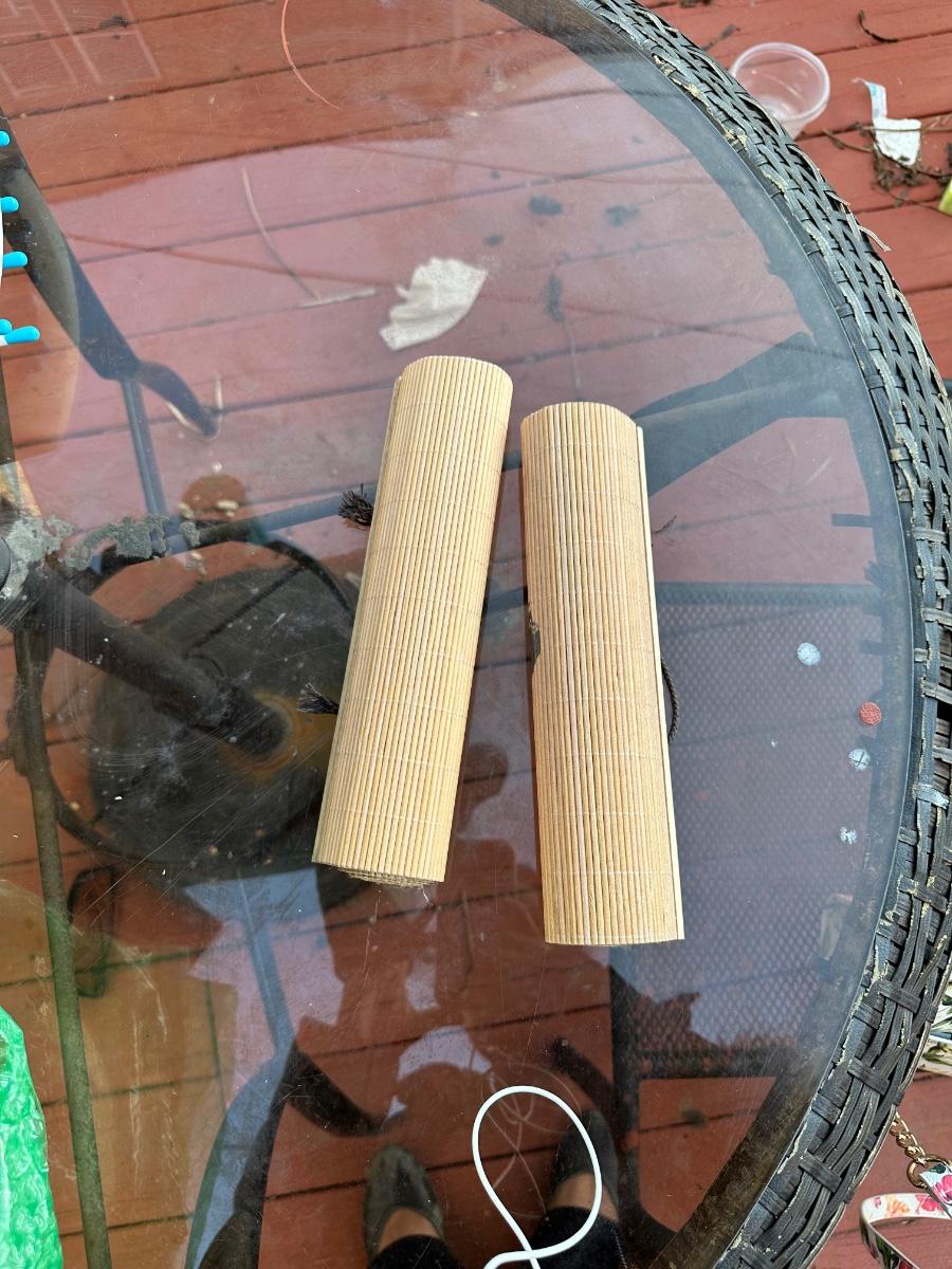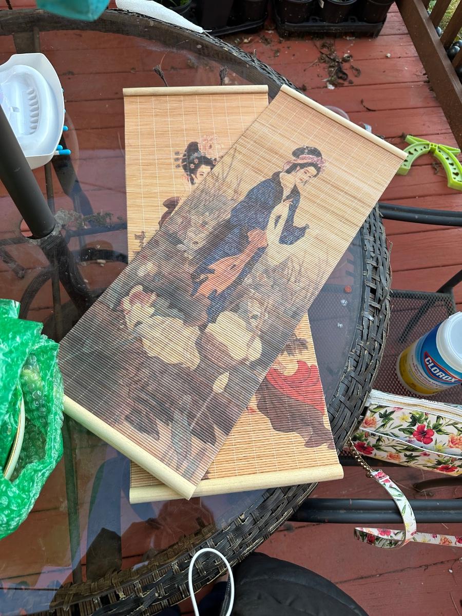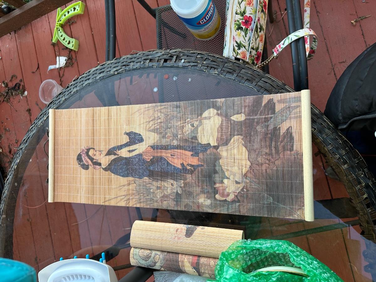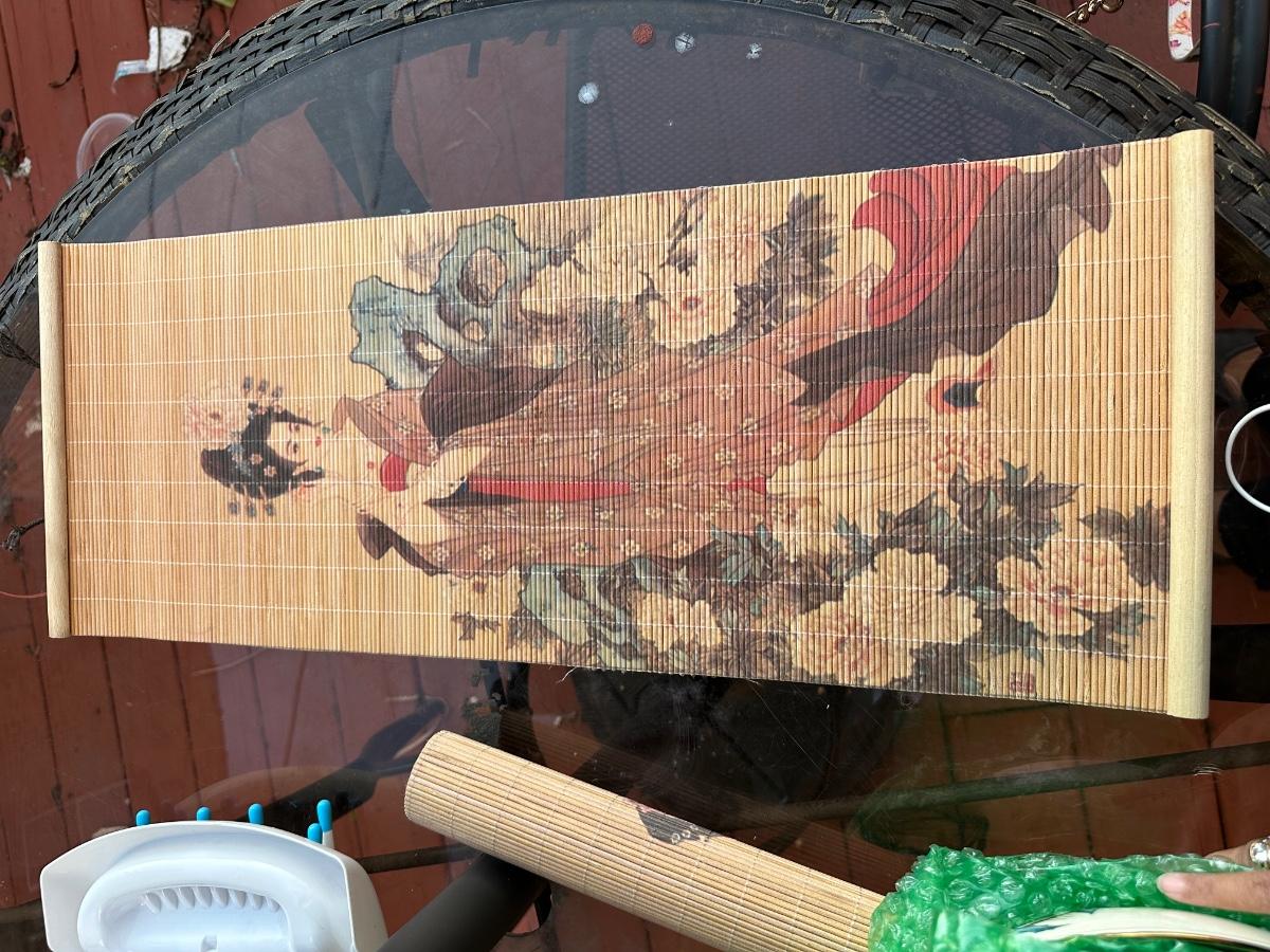 Vintage hanging bamboo scroll featuring Japanese geisha art