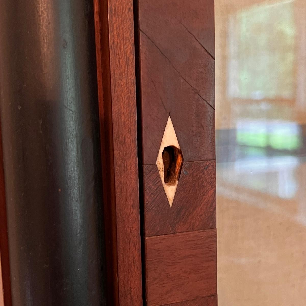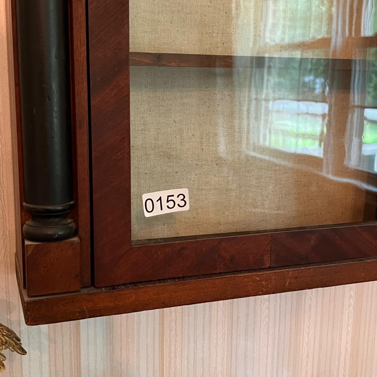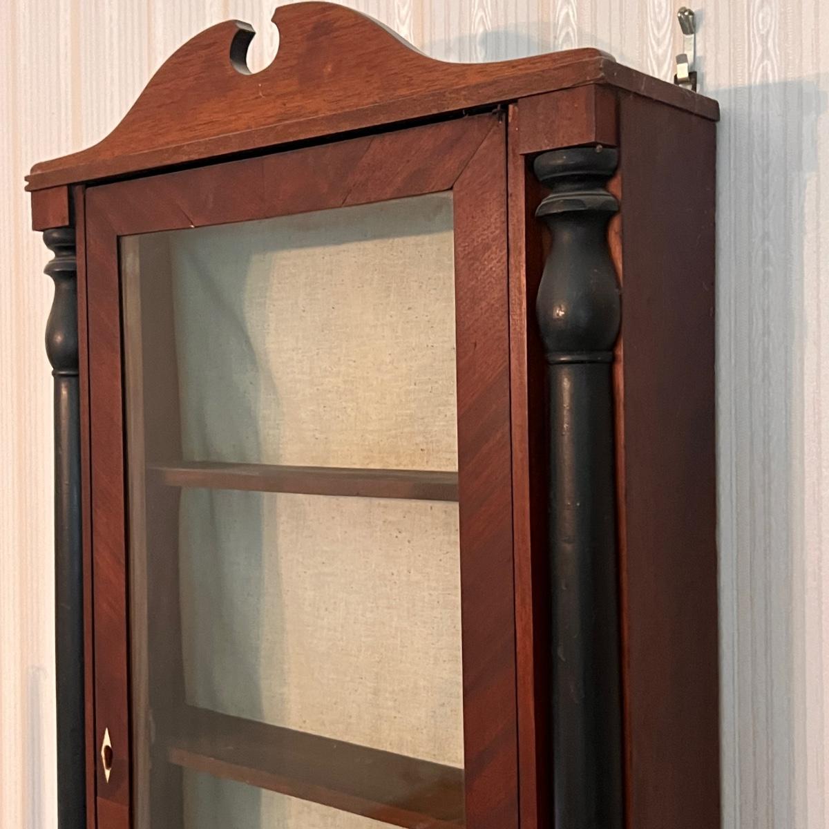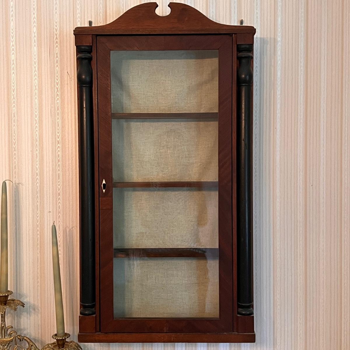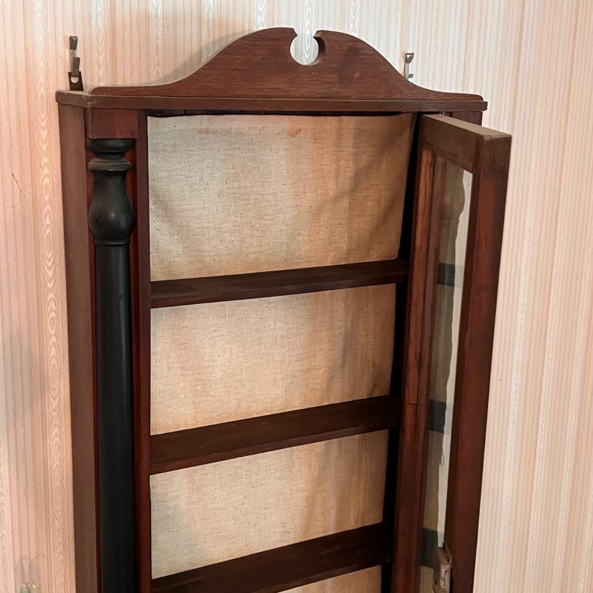 Beautiful hanging wall mounted curio cabinet. Inside has cloth backdrop that can be removed. In great condition consistent with age.