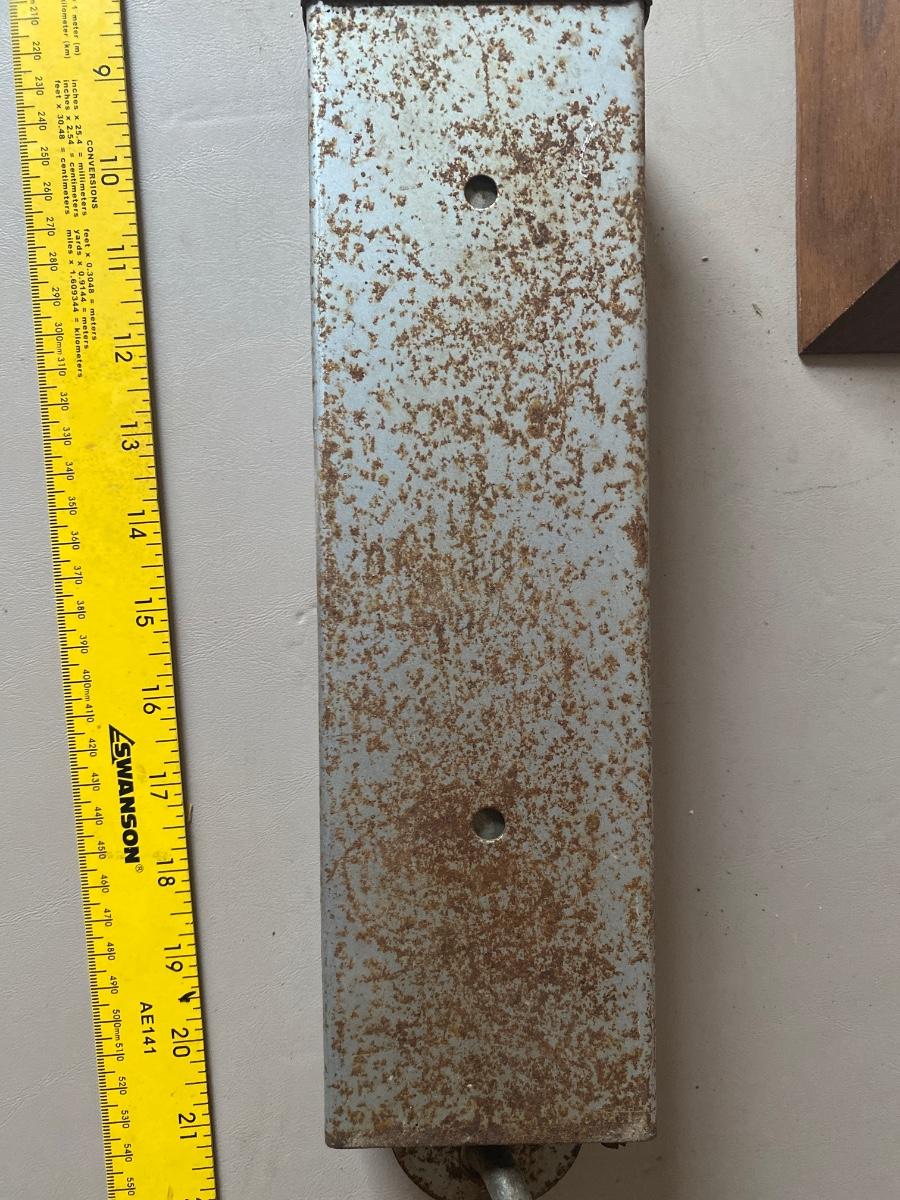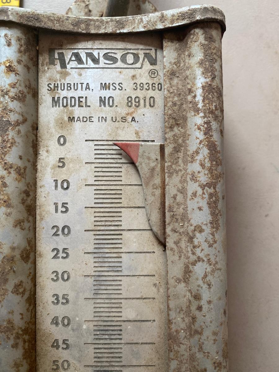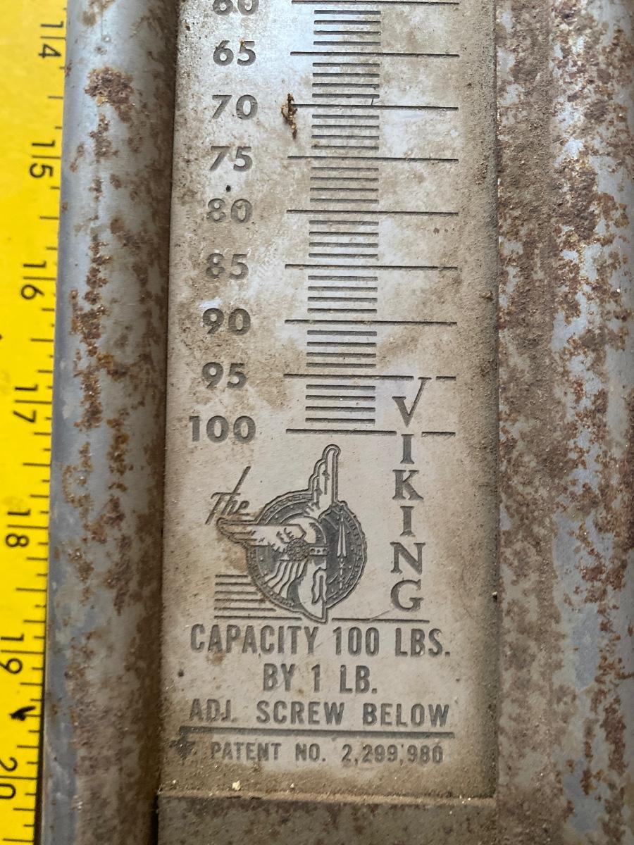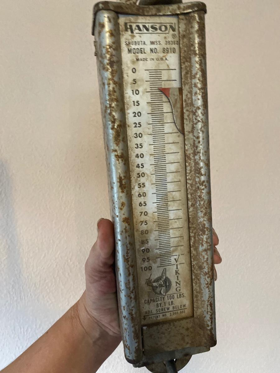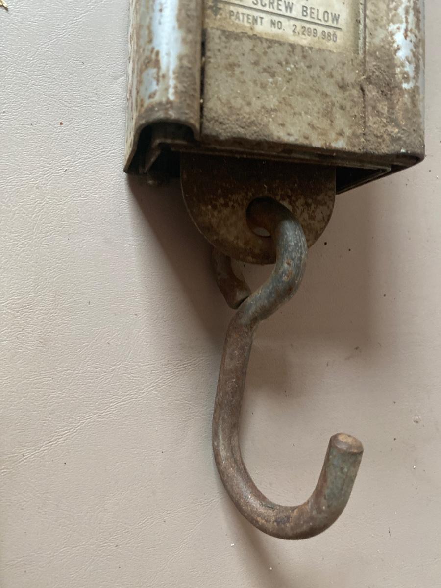 A true barn find Hansen, Viking 100 pound capacity hanging scale it does work. Last photo try to show it does work. It was having a bag of canned food hanging from it.
