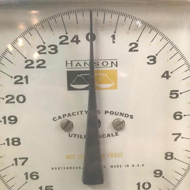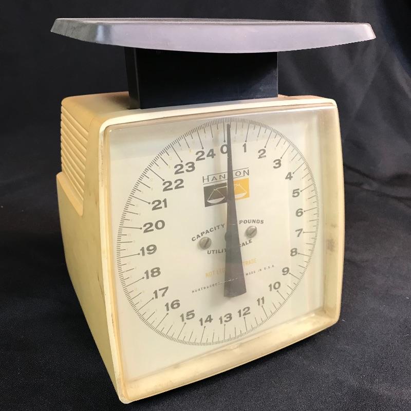 Vintage Household scale . The plastic has some discoloration from age; see pictures. Still zeroes perfectly. Has an adjustment knob on the rear to calibrate zero.